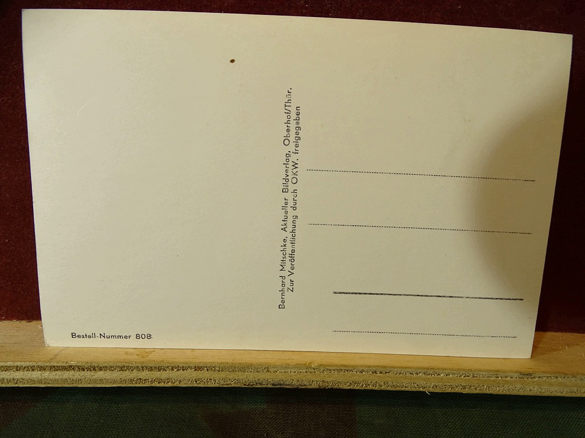 Beschriftet: Bernhard Mitschke, Opberhof / Thüringen, Best. Nr. 808, Freigegeben von OKW. Wehrmachtssoldaten mit MG 34 im Fronteinsatz, der Schütze mit Stielhandgranate im Stiefel. Ungelaufen. Zustand siehe Fotos
