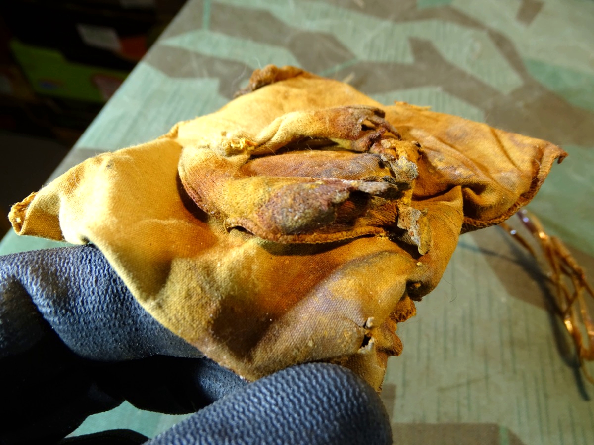 Gehört in Hülse zwischen die Treibladungsstäbe / Spagettis und das Geschoss. Ist nicht in jeder 8,8 Granate verbaut gewesen. Oben aufgenäht ein kleinerer Beutel für brisanteres Zündpulver, anbei original Bindematrial für die Nitro Zündladungsstäbe ( Schwarze Spagettis ) die in der Hülse waren. Aus Nachlass eines Wehrmachts Feuerwerkers, hatte er als Anschauungsmaterial aufgehoben. Frei von brennbaren und explosiven Stoffen.
