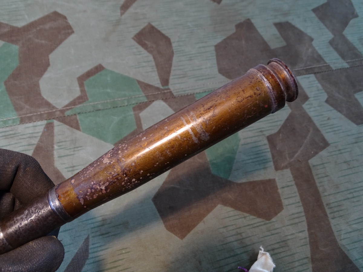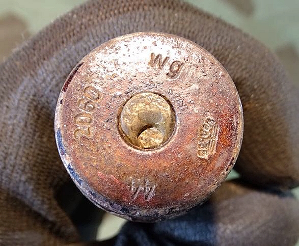 Geschoss in weitgehend glattem Matell, angelaufen, einige Stempel lesbar wie Zahlen, Buchstaben und WaA Abnahme Adler.