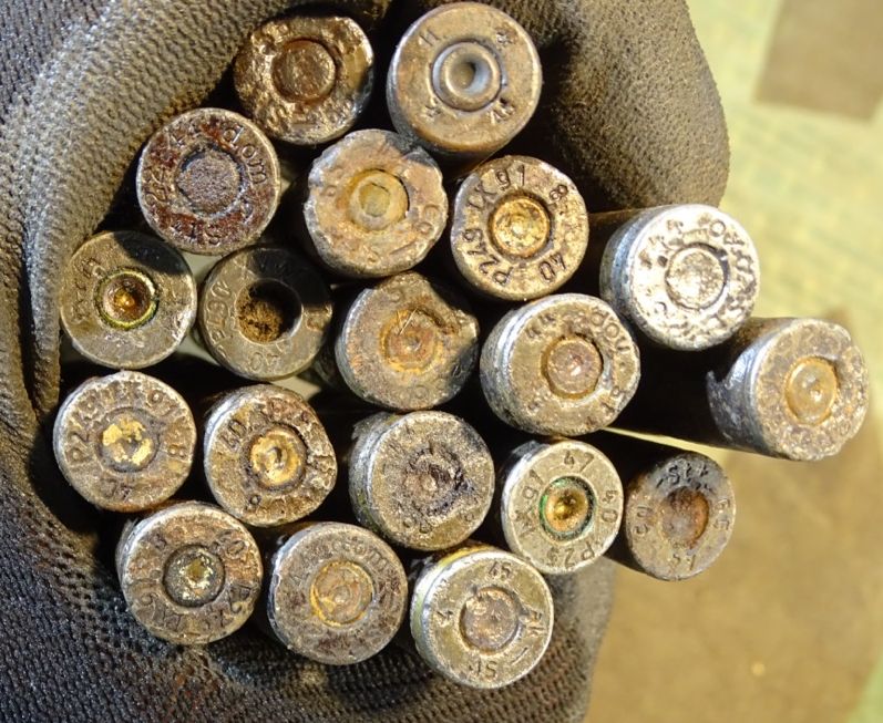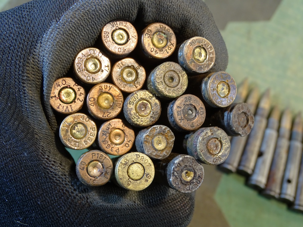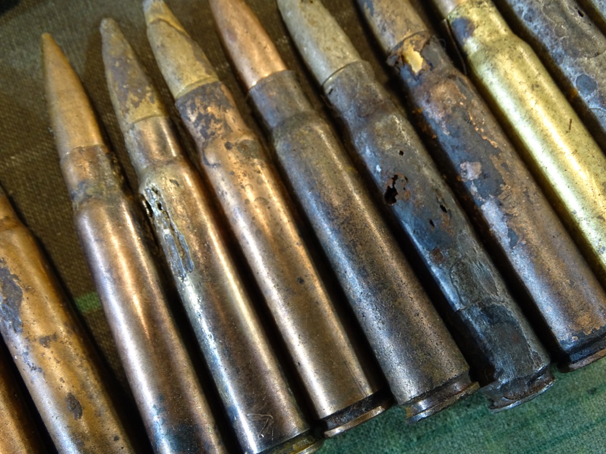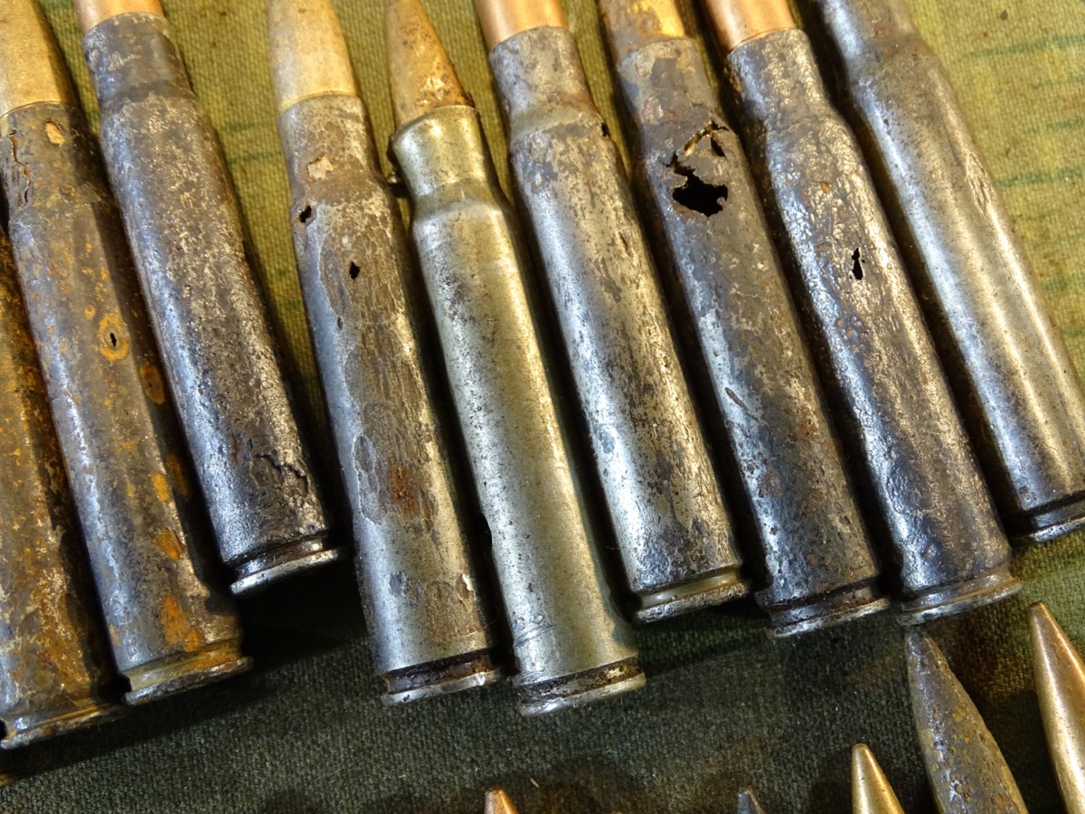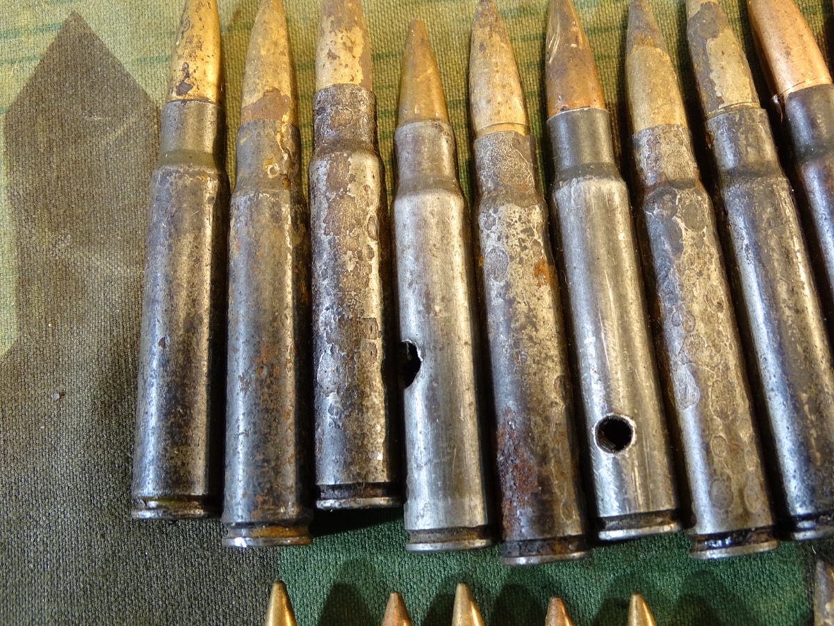38 original Deko Patronen 8x57der Wehrmacht. Narbig, teils kleine Löcher. Verschiedene Hersteller
