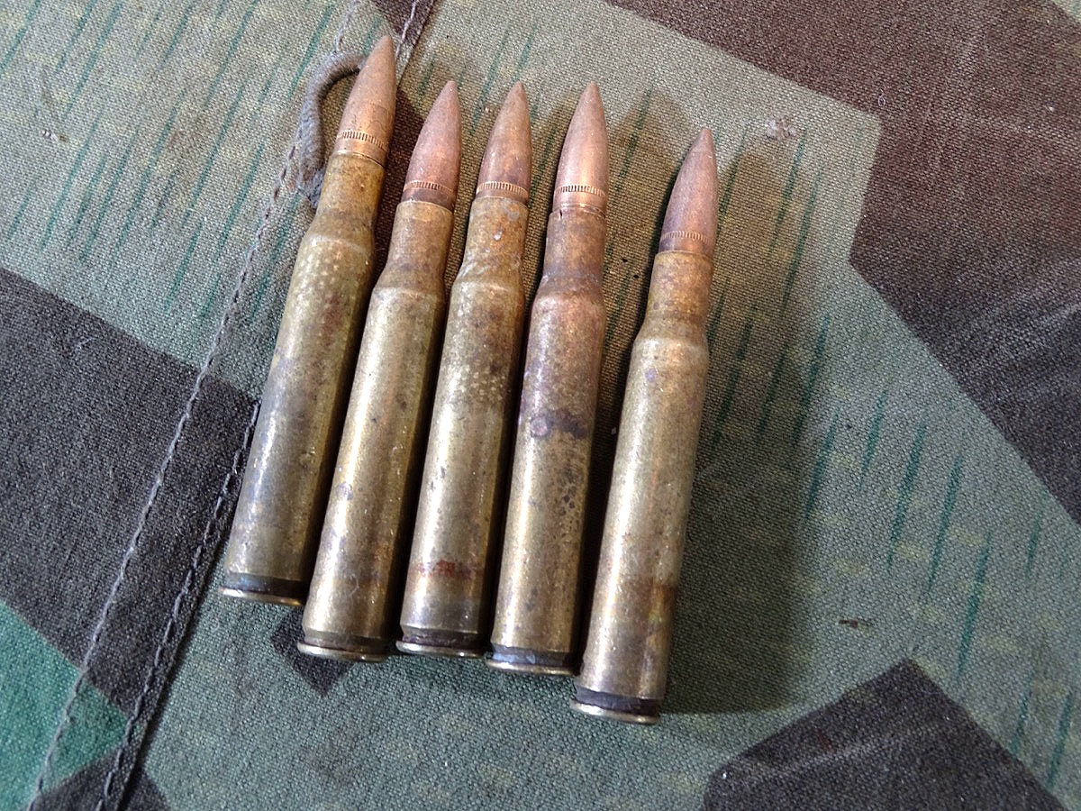 5 Schuss Deko Patronen für das US MG cal. 30, 2. Weltkrieg, alle Hülsen SL 43