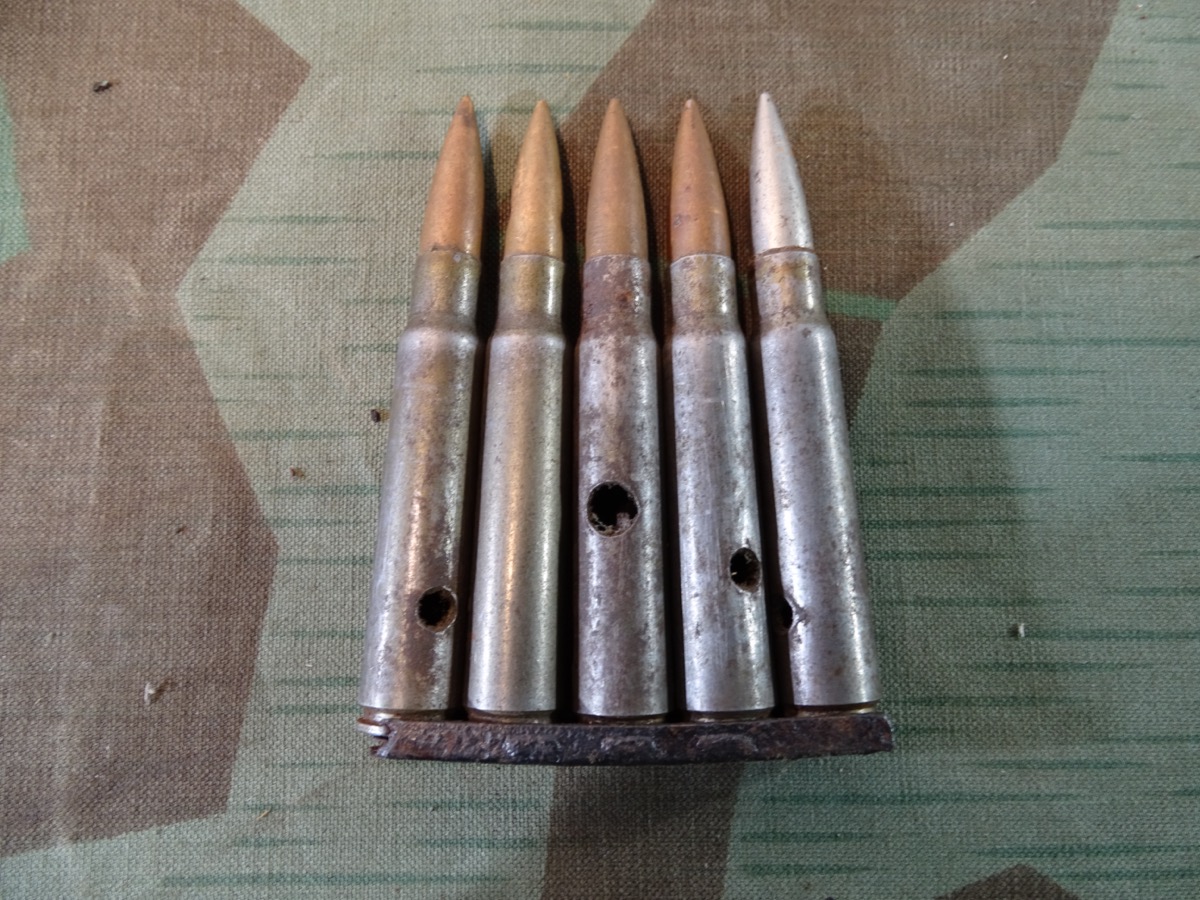 5 Wehrmachts Deko Patronen 8x57, Stahlhülsen mit Ladestreifen, 1940
