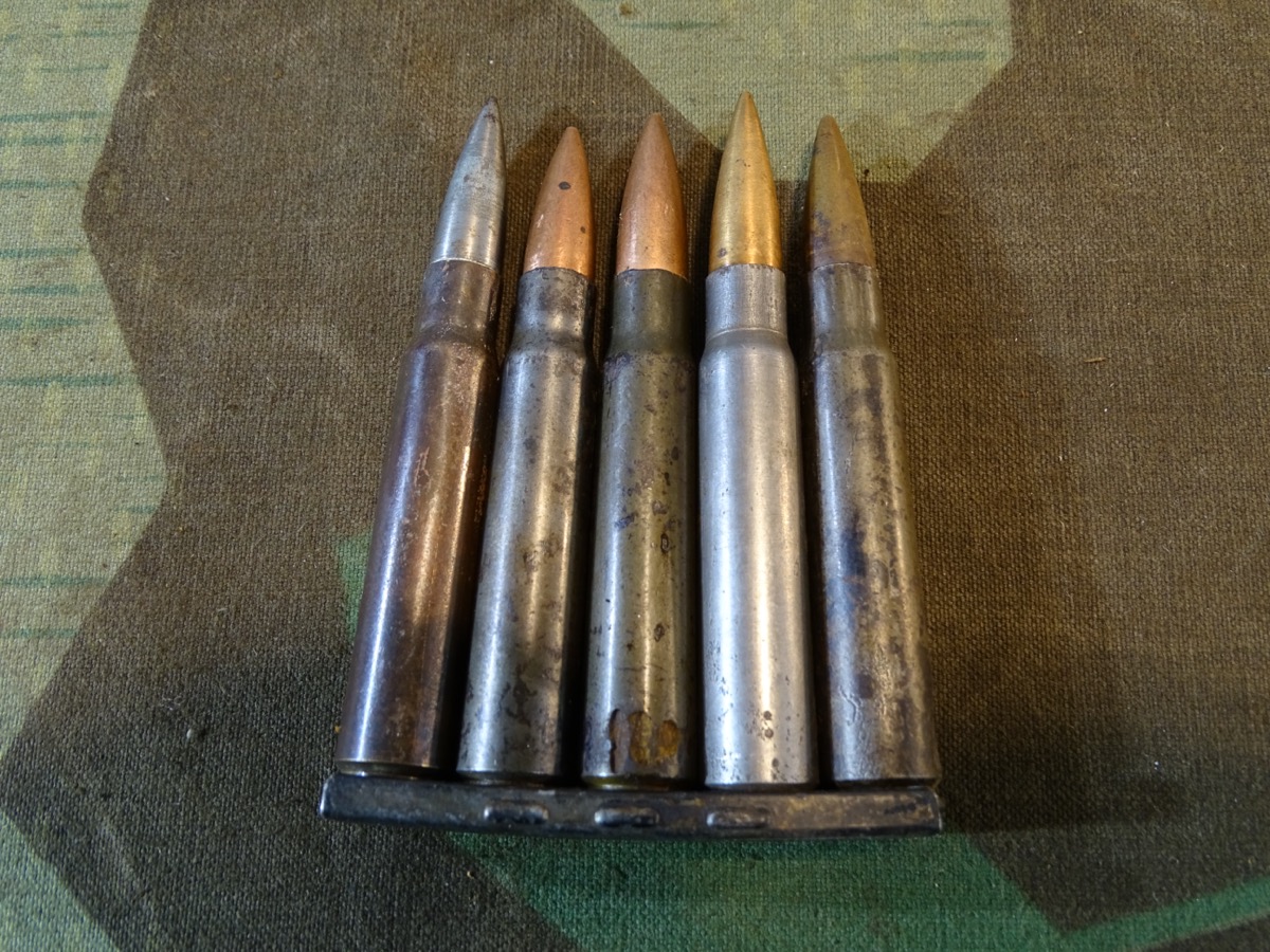5 Wehrmachts Deko Patronen 8x57, zweiter Welktkrieg mit gestempeltem Original Ladestreifen