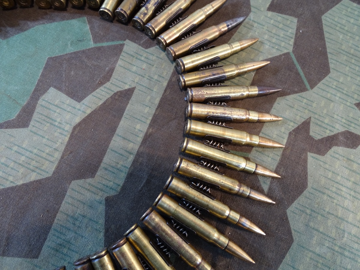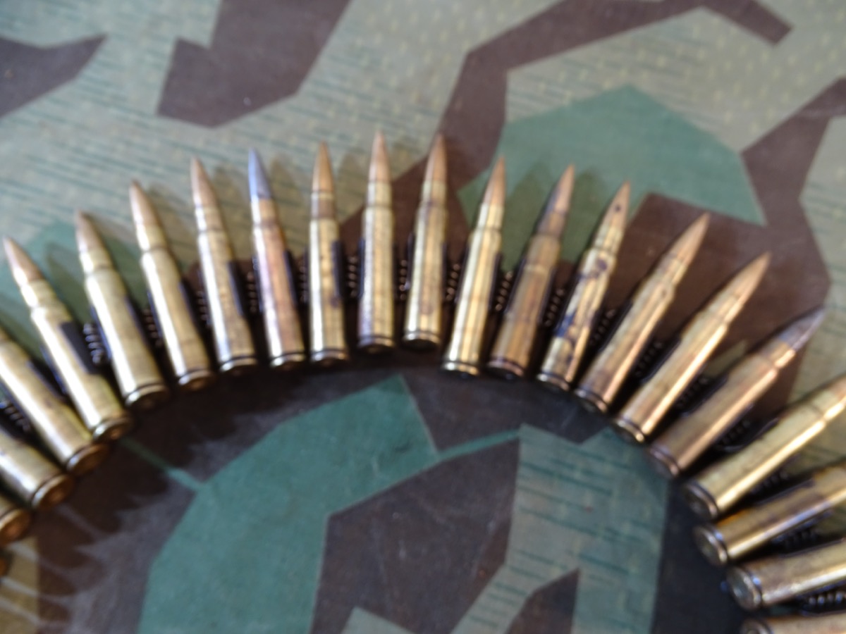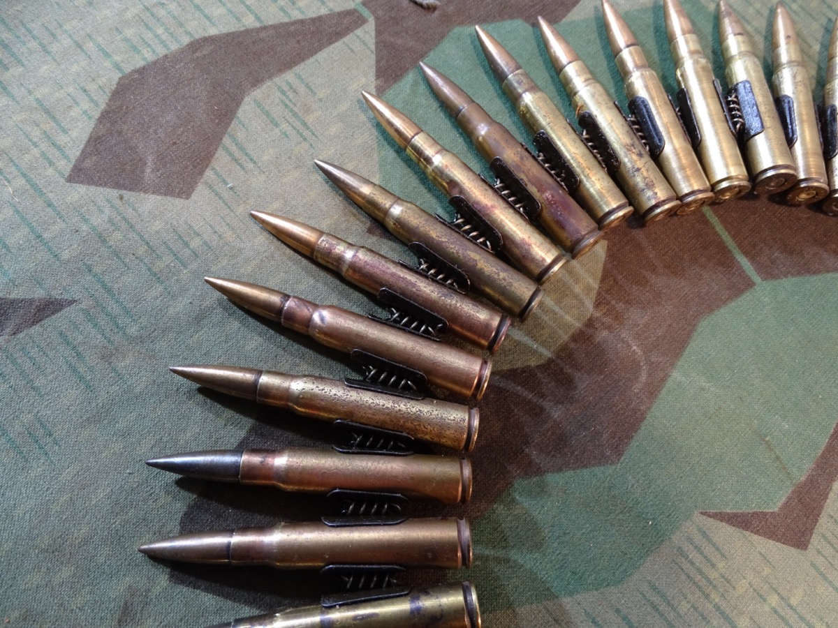 Mesinghülsen, alle mit Herstellerstempeln vor 1945. Schön erhaltene Geschosse. Gemischte Herstellermarken. Ein Kettenglied verzogen, Bild 8, Das Kettenglied hält die Patrone aber trotzdem. - siehe Fotos. Gesetzeskonform, frei erwerbbar ab 18 Jahre. Kein Versand ins Ausland. NO SHIPPING TO FOREIGN COUNTRYS!! So im 2. Weltkrieg verwendet. Frei von zündfähigem Material, kpl.delaboriert. Bei Bestellung bitte Altersnachweis senden oder mailen ( Kopie vom Personalausweis). Zündhütchen abgeschlagen. Zustand siehe Fotos
