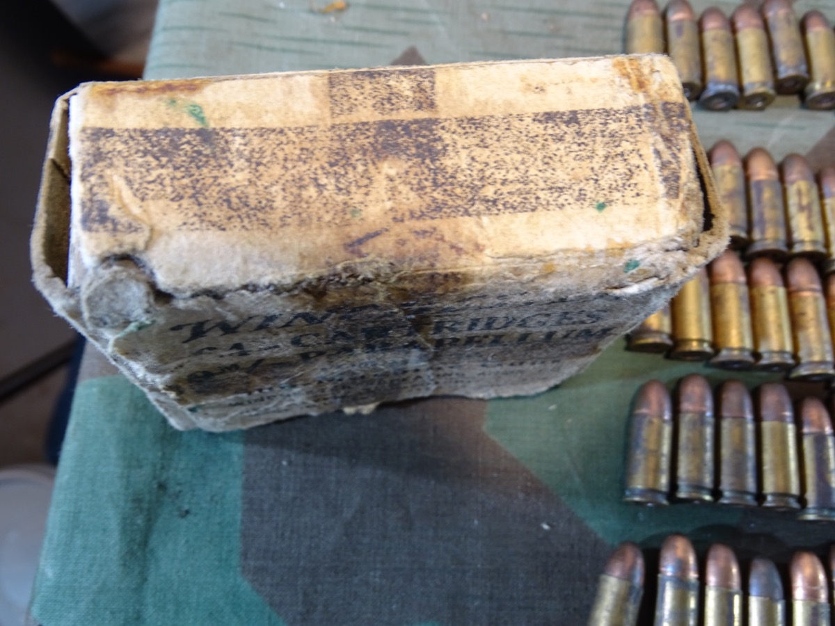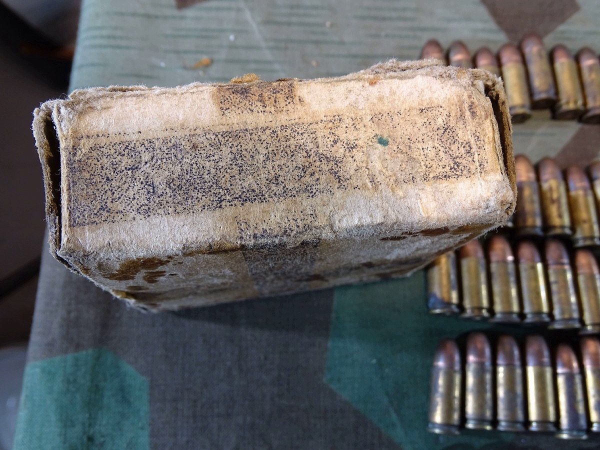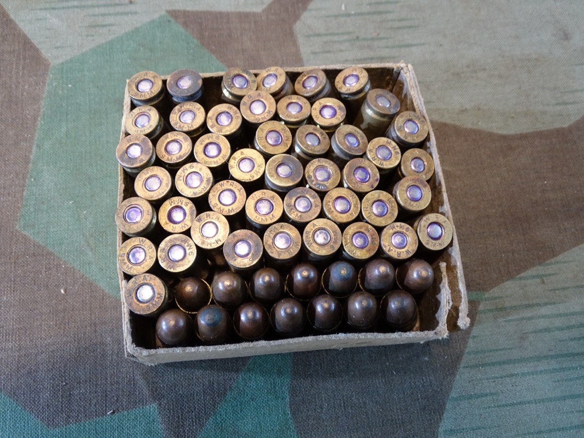 Kein Versand ins Ausland. NO SHIPPING TO FOREIGN COUNTRYS!! So sehr selten als Deko Set im Handel ! 60 Original delaborierte Deko Patronen, mit alter, gleichmässiger Patina, ungereinigter Fundzustand. (Könnte man auf Neuzustand polieren, da es Buntmetall ist) Innen mit Kugel, so dass man hören kann, dass sie leer sind. Messinghülsen mit 9 mm Buntmetall Geschoss. Alle gleiche Charge W.-R.A. 9 MM . Mit genau zugehöriger Originalschaschtel, 2. Weltkrieg, US Army/ Kanada. So genutzt z.B. für die MP Grease Gun, oder auch die 9 mm High Power Pistole der kanadischen Truppen.Schachtel gut leserlich beschriftet mit Winchester, 64 Cartridges 9 mm Parabellum, Sub Machine Guns. Winchester Repeating Arms, New Heaven, Conneticut, Made in USA. Schachtel in stark gebrauchter Erhaltung. In den Ecken mit farblich passender, zeitgenössicher Pappe hinterklebt um sie zu stabililisieren. Bei Bestellung bitte Altersnachweis senden oder mailen ( Kopie vom Personalausweis).Zustand siehe Fotos.