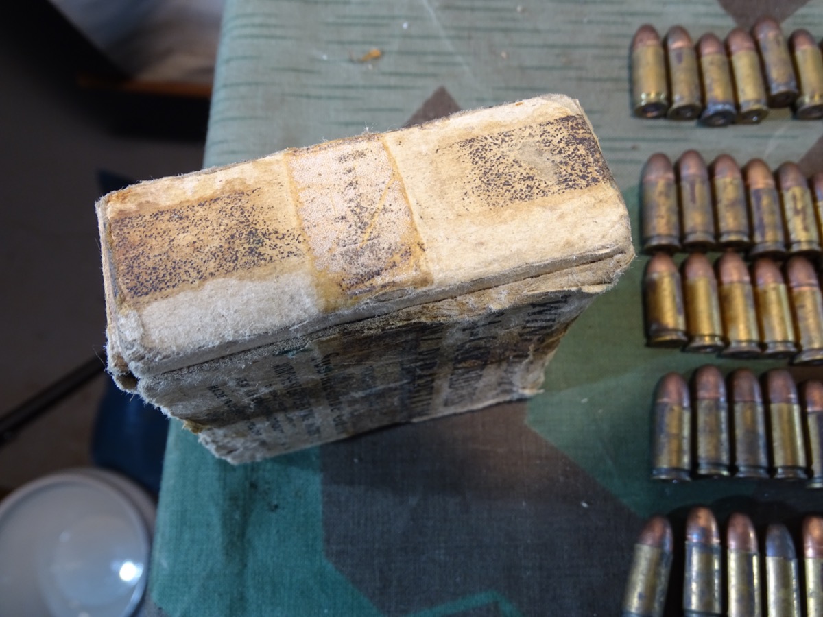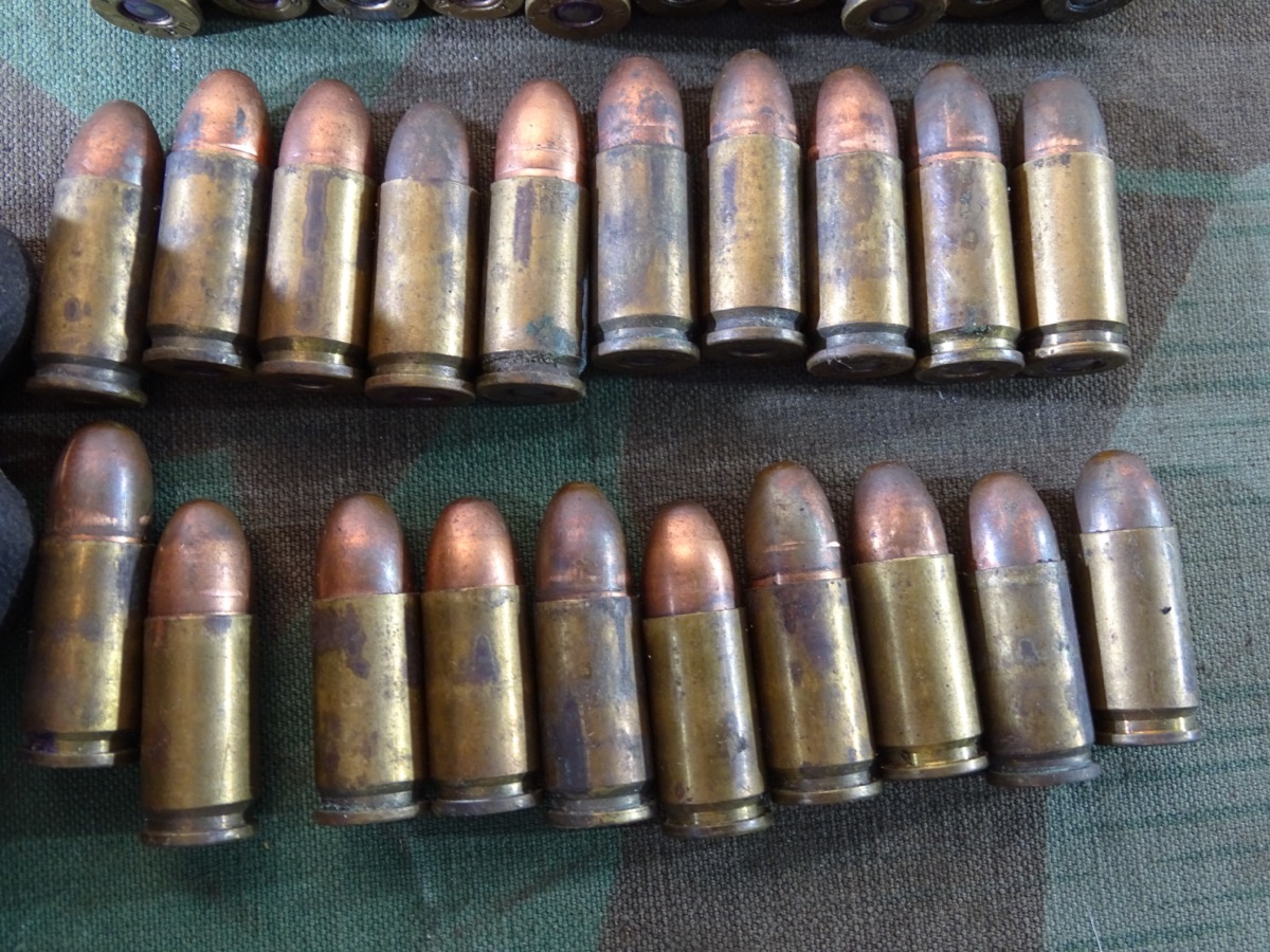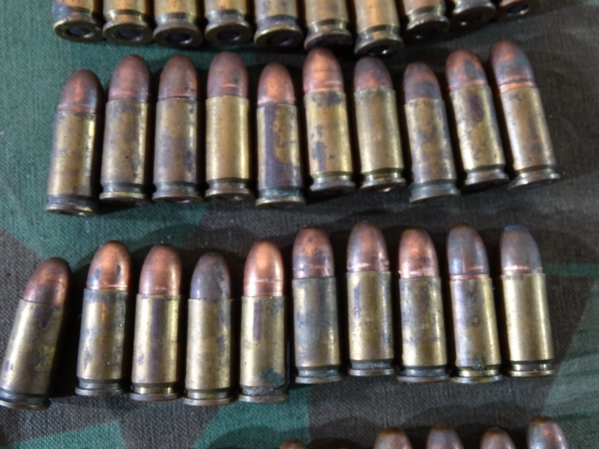 Kein Versand ins Ausland. NO SHIPPING TO FOREIGN COUNTRYS!! So sehr selten als Deko Set im Handel ! 60 Original delaborierte Deko Patronen, mit alter, gleichmässiger Patina, ungereinigter Fundzustand. (Könnte man auf Neuzustand polieren, da es Buntmetall ist) Innen mit Kugel, so dass man hören kann, dass sie leer sind. Messinghülsen mit 9 mm Buntmetall Geschoss. Alle gleiche Charge W.-R.A. 9 MM . Mit genau zugehöriger Originalschaschtel, 2. Weltkrieg, US Army/ Kanada. So genutzt z.B. für die MP Grease Gun, oder auch die 9 mm High Power Pistole der kanadischen Truppen.Schachtel gut leserlich beschriftet mit Winchester, 64 Cartridges 9 mm Parabellum, Sub Machine Guns. Winchester Repeating Arms, New Heaven, Conneticut, Made in USA. Schachtel in stark gebrauchter Erhaltung. In den Ecken mit farblich passender, zeitgenössicher Pappe hinterklebt um sie zu stabililisieren. Bei Bestellung bitte Altersnachweis senden oder mailen ( Kopie vom Personalausweis).Zustand siehe Fotos.