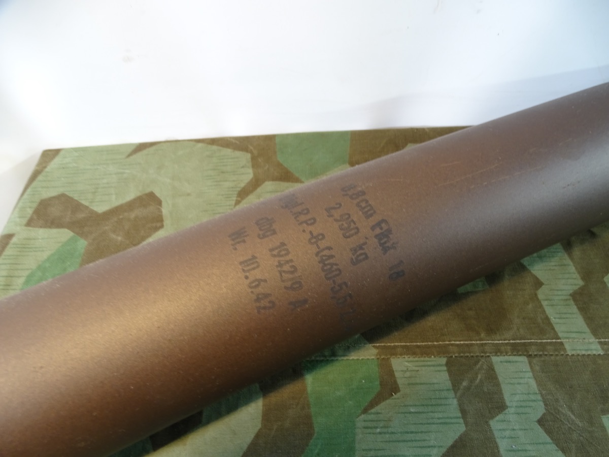 NO SHIPPING TO FOREIGN COUNTRYS!! Kein Auslandsversand. Original Hülse der berühmten deutschen Wehrmachts 8,8 cm Flak 18, die auch im Erdkampf gegen Panzer ein gefürchteter Gegner war. Die Hülse ist glattes, gut erhaltenes Metall. Keine oder nur sehr leichte Narben. Nicht gespachtelt ! Bodenstemplungen wie Adler, Herstellercode, Jahr und 8,8 cm Flak 18 lesbar. Stammt aus einem Museumsbestand. Lack und Beschriftung sind originalgetreu - aber unserer Meinung nach mal irgendwann erneuert worden, wahrscheinlich von den Museumsrestauratoren. - gut gemacht. In dieser Qualität selten zu bekommen. Komplett frei von gefährlichen Stoffen - reiner Dekorationsgegenstand, komplett delaboriert/ deaktiviert. Bei Bestellung bitte Altersnachweis senden oder mailen ( Kopie vom Personalausweis).Das Foto steht stellvertretend für unseren Bestand an gleichwertigen Artikeln gleichen Zustands. Mehrere bei Bestellung vorrätig. Es kann daher bei Lieferung zu Abweichungen zum Foto kommen