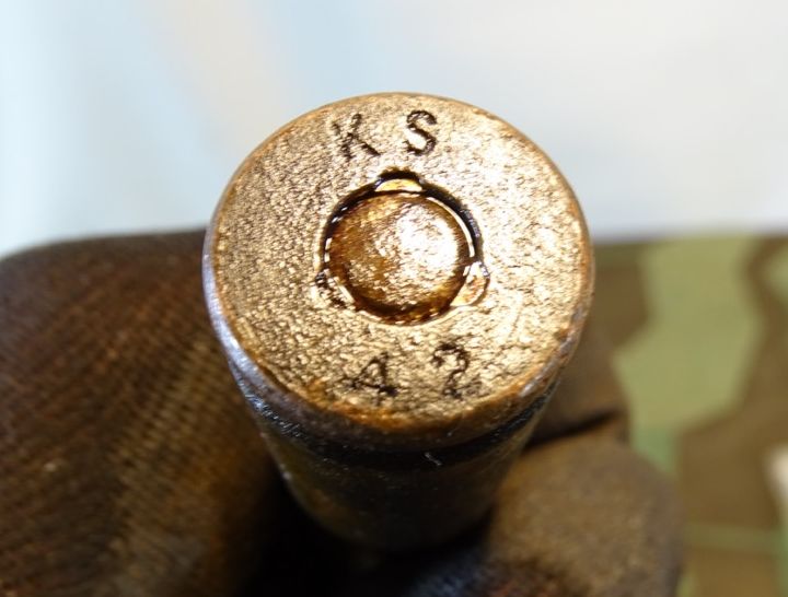 Kein Versand ins Ausland, NO SHIPPING TO FOREIGN COUNTRYS. Buntmetall. Standartmunition im 2. Weltkrieg. Gestempelt auf Bodenplatte mit "KS 42 " für Hersteller Kelly Springfield, Allegany Ordnance Plant - Cumberland, Maryland, USA und 1942 Zustand siehe Fotos. Die Hülsen dieser Patrone liegen praktisch in jedem deutschen Wald in Reihen mit einem Abstand von ca. 50 m.