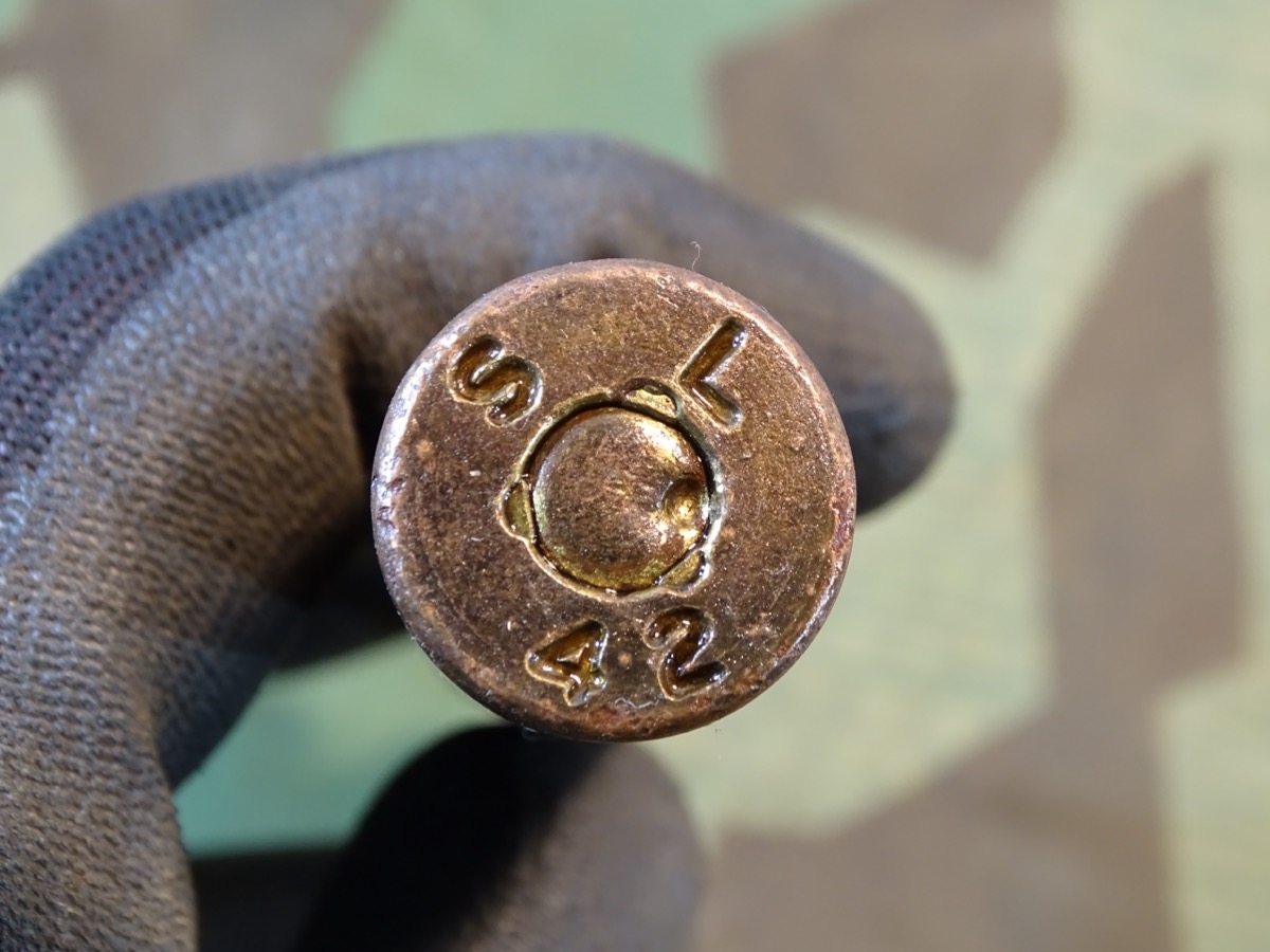 Kein Versand ins Ausland, NO SHIPPING TO FOREIGN COUNTRYS. Buntmetall. Standartmunition im 2. Weltkrieg. Gestempelt auf Bodenplatte mit "SL 42 " für Hersteller und 1942 Guter Zustand. Die Hülsen dieser Patrone liegen praktisch in jedem deutschen Wald in Reihen mit einem Abstand von ca. 50 m.