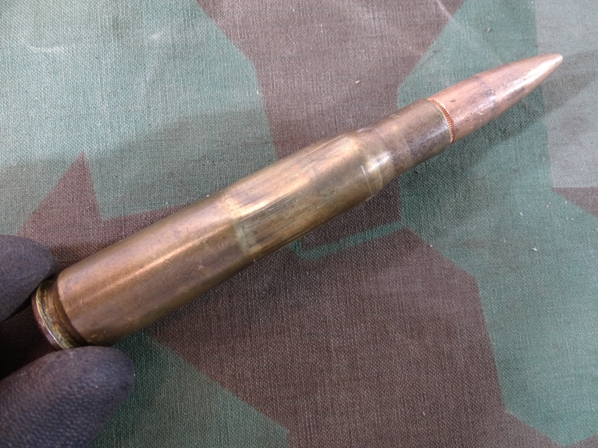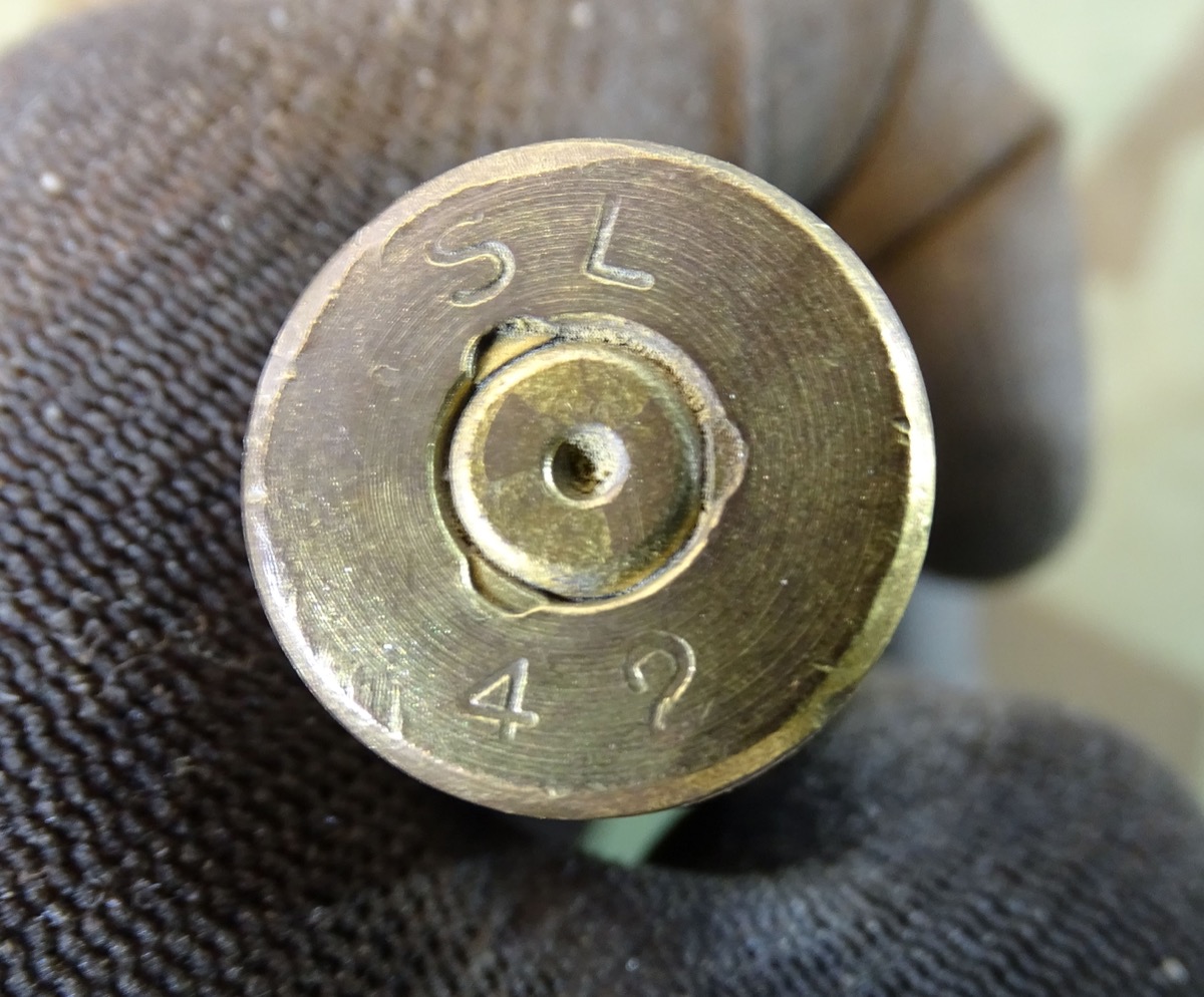 Kein Versand ins Ausland, NO SHIPPING TO FOREIGN COUNTRYS. Buntmetall. Standartmunition im 2. Weltkrieg. Gestempelt auf Bodenplatte mit "SL 42 " für Hersteller St. Louis Ordnance Plant, St. Louis Missoiri, USA und 1942 Guter Zustand. Die Hülsen dieser Patrone liegen praktisch in jedem deutschen Wald in Reihen mit einem Abstand von ca. 50 m.