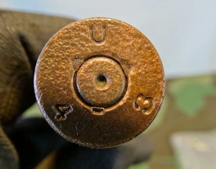 Kein Versand ins Ausland, NO SHIPPING TO FOREIGN COUNTRYS. Buntmetall. Standartmunition im 2. Weltkrieg. Gestempelt auf Bodenplatte mit "U 43 " für Hersteller Utah Ordnance Plant - Salt Lake City, Utah, USA und 1943 Zustand siehe Fotos. Die Hülsen dieser Patrone liegen praktisch in jedem deutschen Wald in Reihen mit einem Abstand von ca. 50 m.
