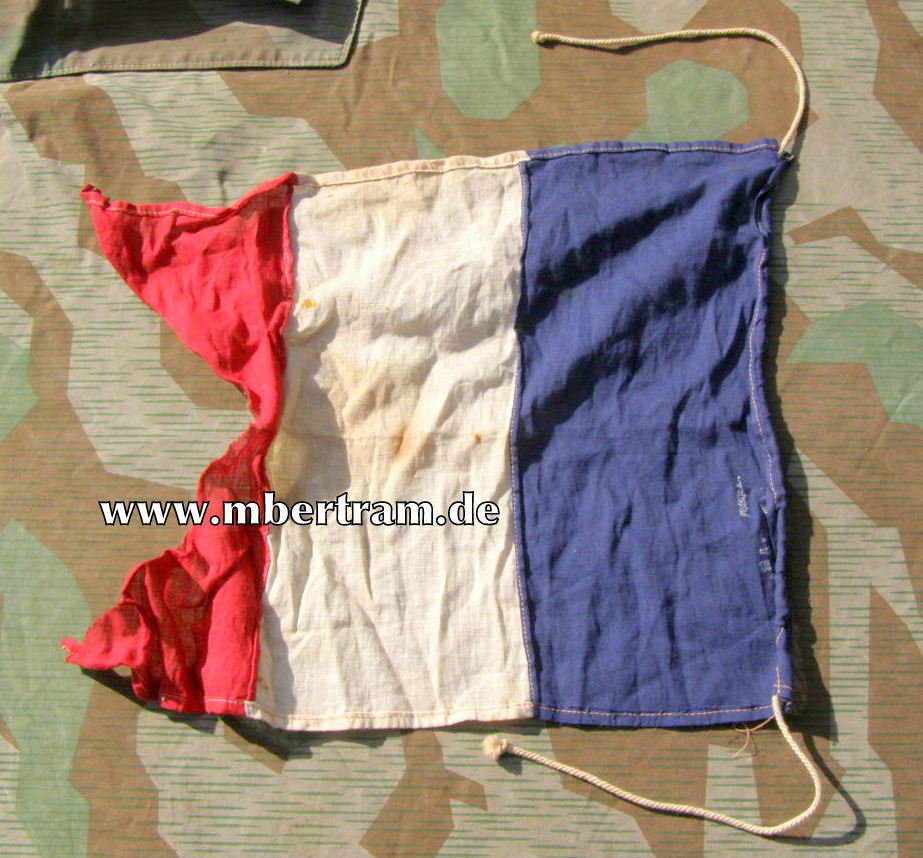 Typische zweischwänzige Form, wie auch bei deutschen Lanzenfahnen zu finden. An beiden Seiten Festmachriemen. Auch Abmessungen ähnlich, Breite ca.43 cm, Länge ca. 32,5cm. Aus Nachlass eines ehem. deutschen Husaren, der die Fahne laut Aussage seines Sohnes als Beutestück mit nach Hause brachte. Direkt aus Familiennachlass angekauft.