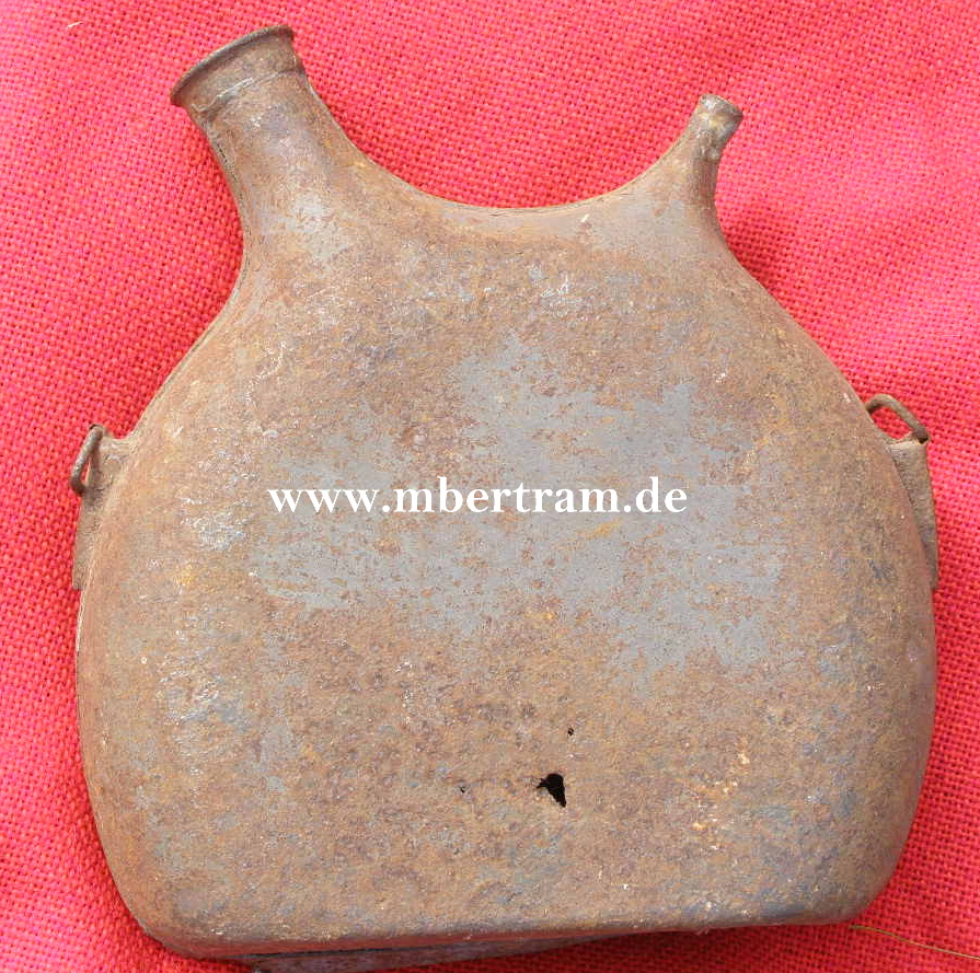 Mitgebracht von einem deutschen Soldaten des Afrika Korps aus Afrika, wo er Sie von einem italienischen Kameraden bekommen hatte. Der dt. Soldat trug sie dort neben seiner deutschen Feldflasche als Zusatz Wasserreserve gegen die große Hitze. Hat hier im Keller überlebt und wir konnten sie von seiner Frau ankaufen. Schraubverschluss klappt. Getragener Zustand - siehe Foto.