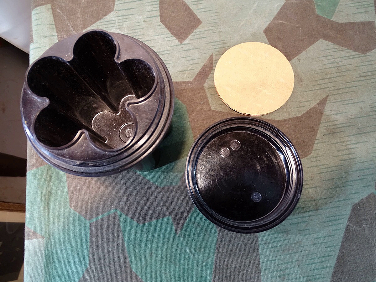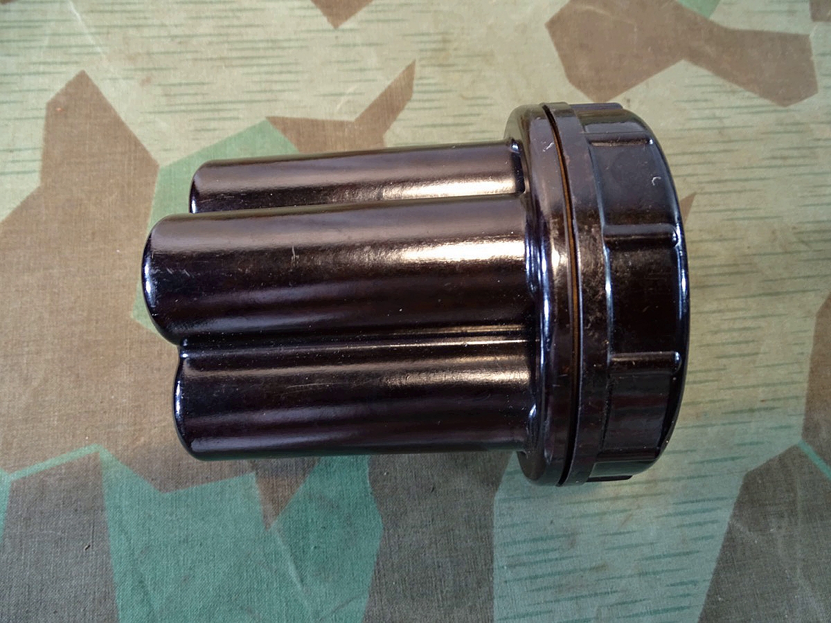 Bakelit in Deckel und Unterteil mit Herstellercode boa für die Fa. Venditor, Kunststoff Verkaufsgesellschaft, Troisdorf, Zustand siehe Fotos. Bakelit Dose für 6 Leuchtsignalpatronen der Wehrmacht, Dose sehr guter Zustand, mit original Etikett in gebrauchtem Zustand. Mit Etikett selten so zu finden.