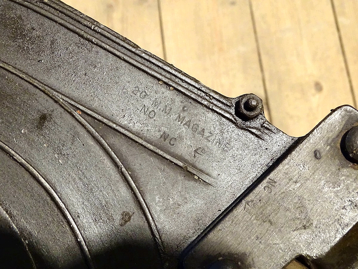 Waffennummer auf Gehäuse MK II S11313. Waffe mit Jahrgangsstempel NI 42 für 1942, auf Lauf N III 44 für 1944. Sehr massive Bauweise mit fast komplett glatter Metalloberfläche ohne Narben. Sie erhalten alle Teile des Waffensystems in gutem, normal gebrauchtem Zustand wie abgebildet. Die Bauteile sind noch zum größten Teil brüniert oder lackiert. Gereinigt, gefettet, zerlegbar. In der Bilderfolge haben wir einen Zerlegeplan abgebildet auf der Sie sehen können, was alles zur Waffe gehört und welchen Zustand die Einzelteile haben. Mit 2 Stück grob gereinigten, unrestaurierten, Trommel Magazinen mit Nutzungsspuren. Das abgebildete Gehäuse hat eine britische Beschriftung MK II und den britischen Waffenamts Pfeil. Um einen sicheren Stand zu gewährleisten, erhalten Sie das aus einer Palette gefertigte, Stoff bespannte, grau gestrichene Podest anbei.