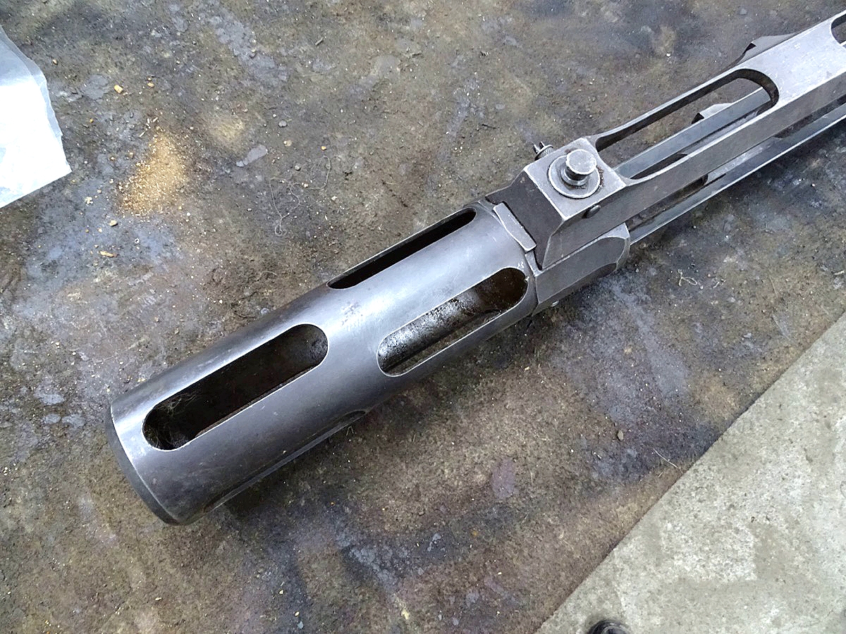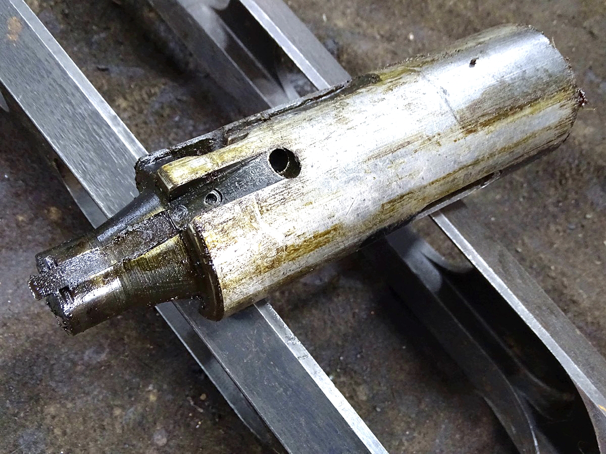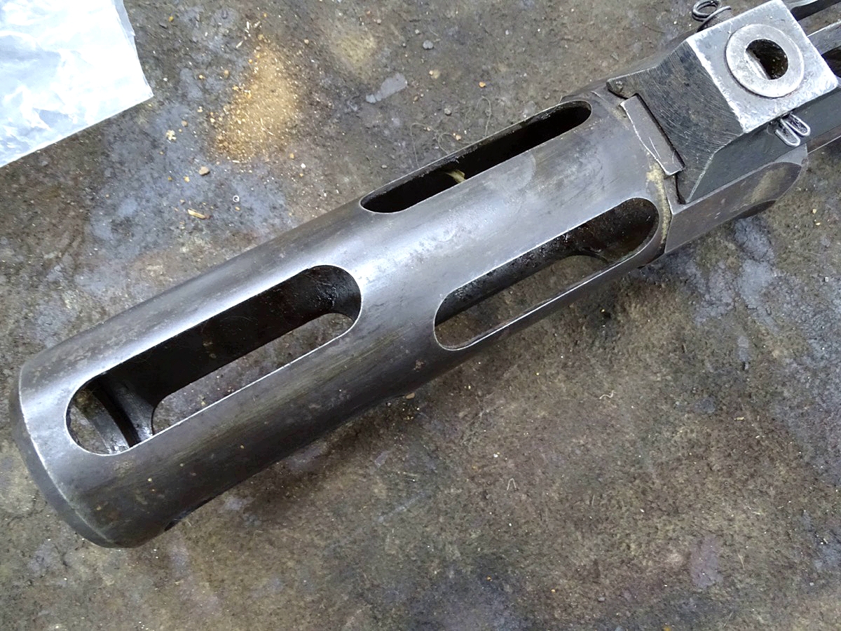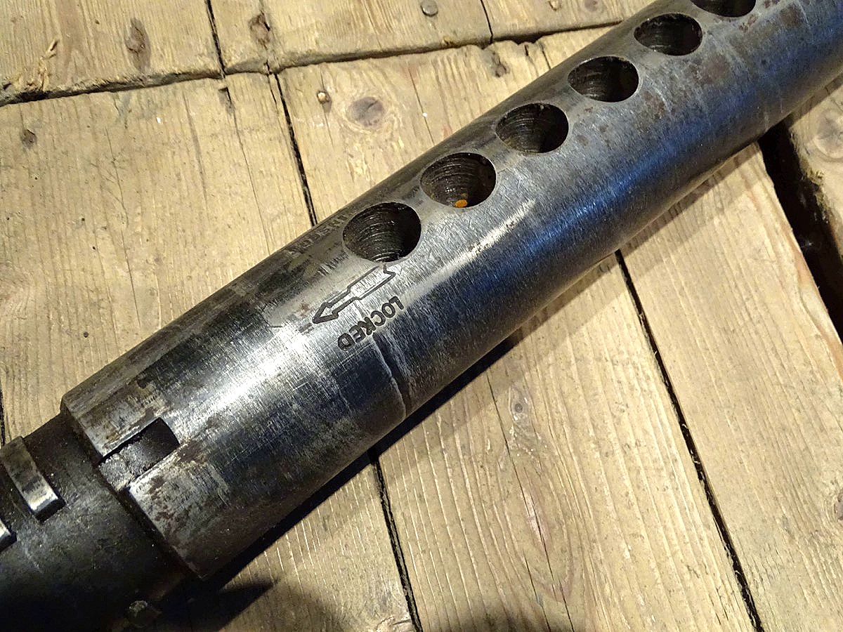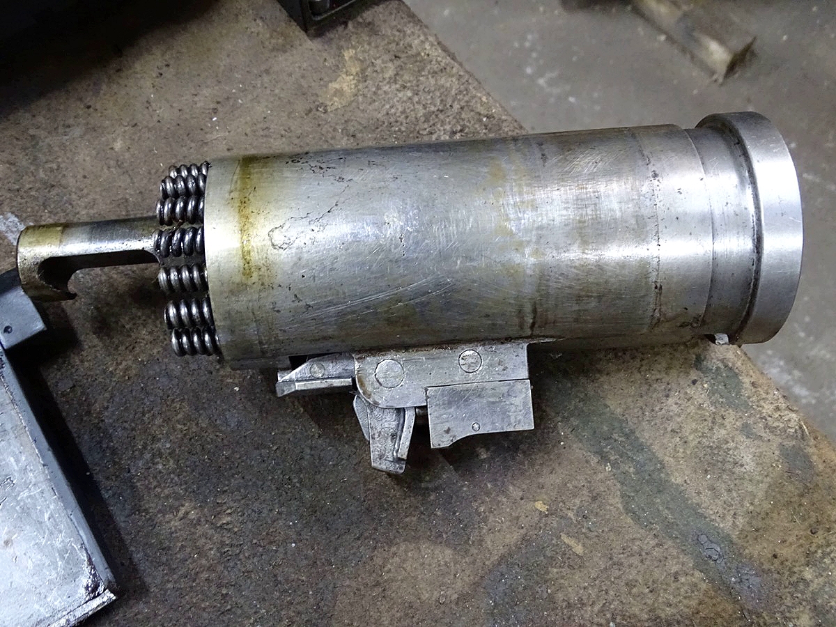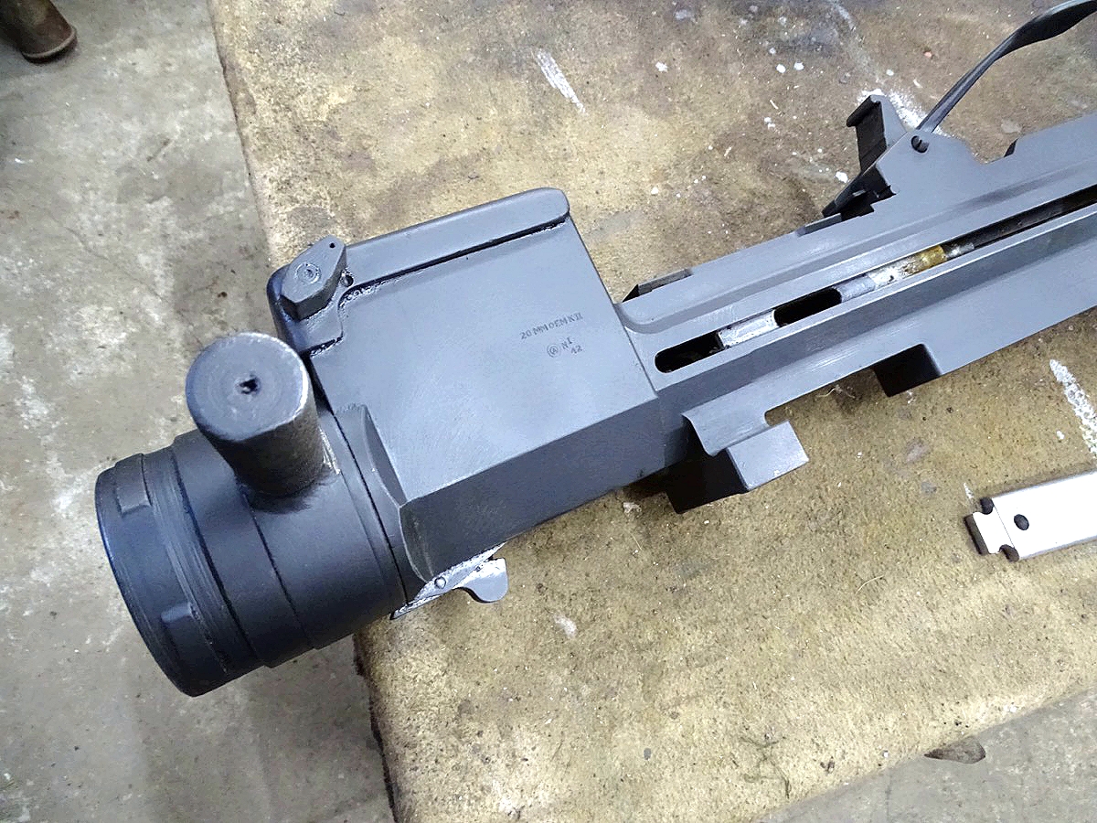 Geliefert werden die fotografierten Bauteile. Dekoumbau. Abgeändert nach den Bestimmungen des KWKG. Optisch so unauffällig wie möglich geändert. 7 kalibergroße Lochbohrungen im Lauf. In vorderster Lochbohrung ein gehärteter, kalibergroßer Stahlstift verschweißt, der den Lauf- Innendurchmesser vollständig ausfüllt. Im Patronenleger ein gehärteter, kalibergroßer Stahlstift eingesetzt und flächig verschweißt. Schlosskopf auf ca. 1 cm gekürzt, so dass der Stoßboden vollständig entfernt wurde. Schlagbolzenaustritt flächig verschweißt.