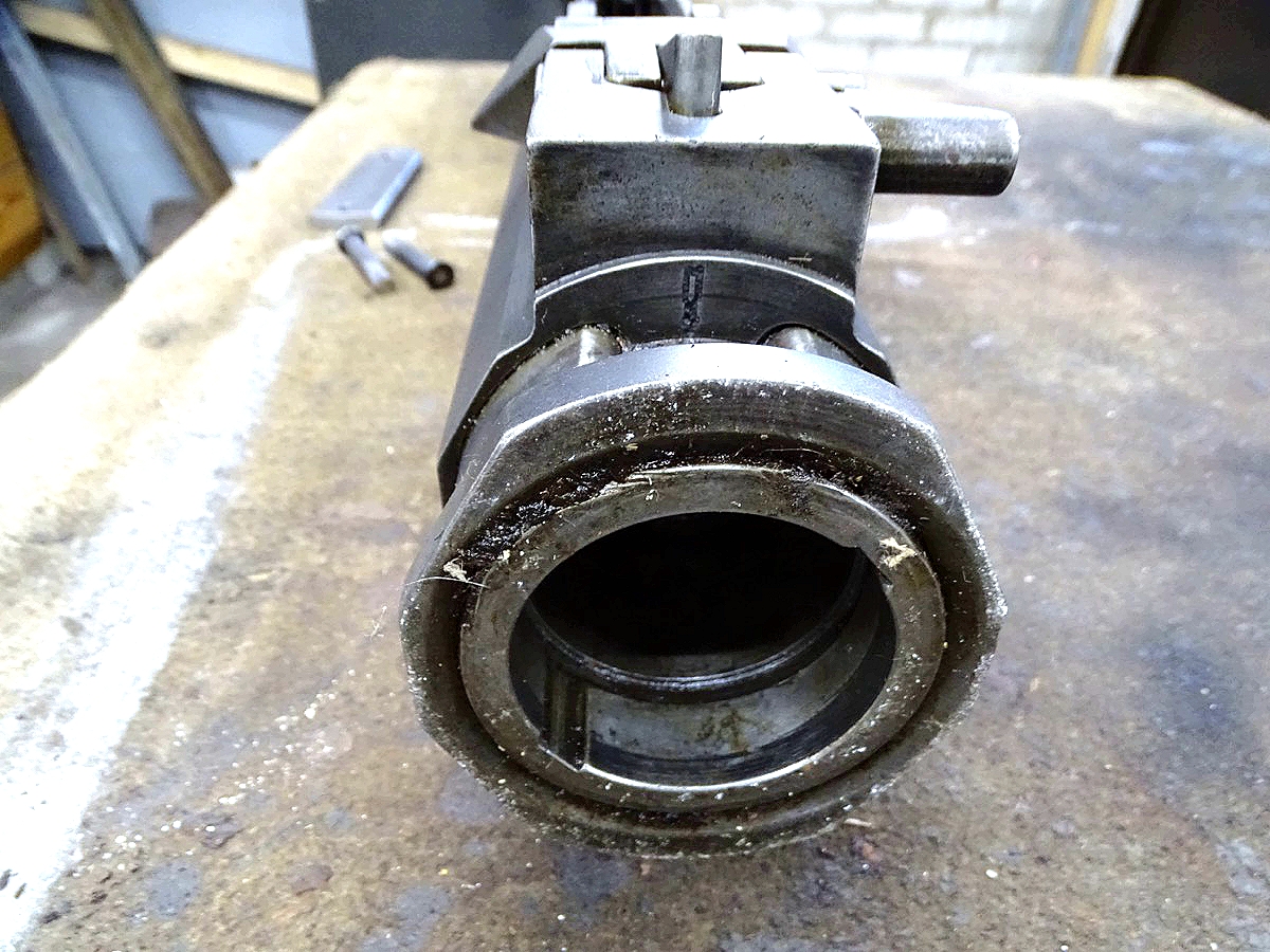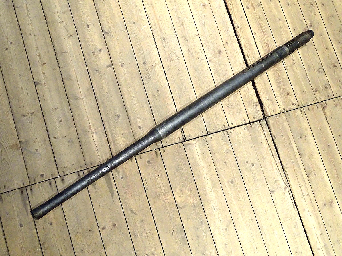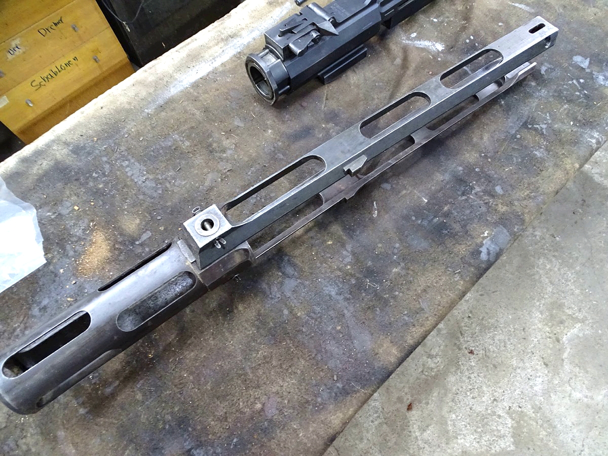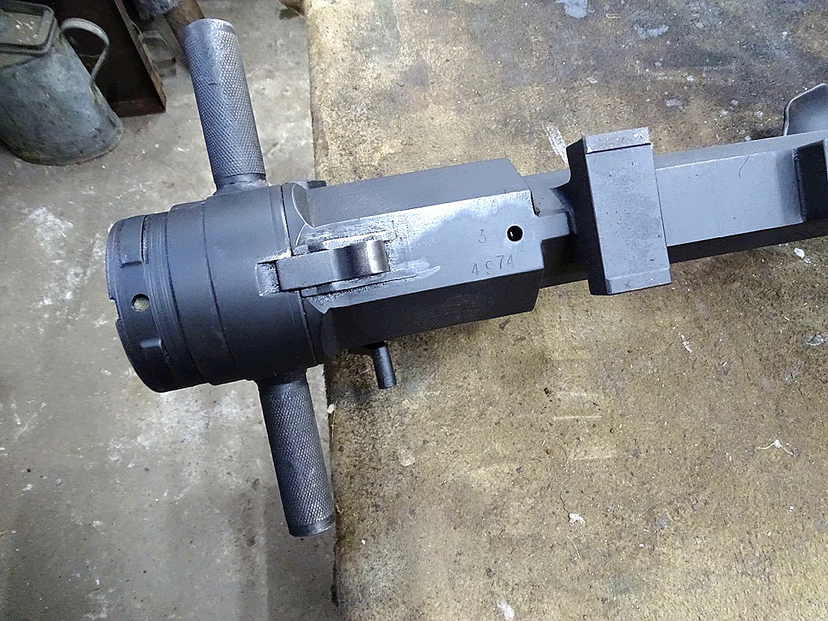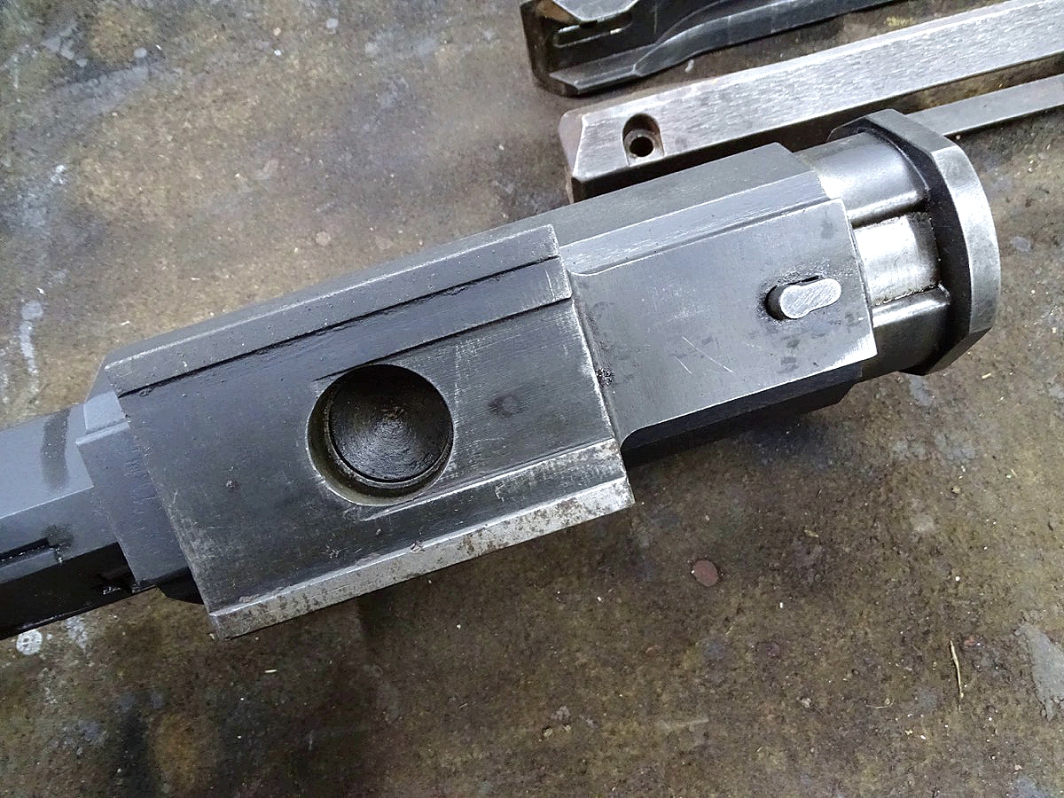 Geliefert werden die fotografierten Bauteile. Dekoumbau. Abgeändert nach den Bestimmungen des KWKG. Optisch so unauffällig wie möglich geändert. 7 kalibergroße Lochbohrungen im Lauf. In vorderster Lochbohrung ein gehärteter, kalibergroßer Stahlstift verschweißt, der den Lauf- Innendurchmesser vollständig ausfüllt. Im Patronenleger ein gehärteter, kalibergroßer Stahlstift eingesetzt und flächig verschweißt. Schlosskopf auf ca. 1 cm gekürzt, so dass der Stoßboden vollständig entfernt wurde. Schlagbolzenaustritt flächig verschweißt.