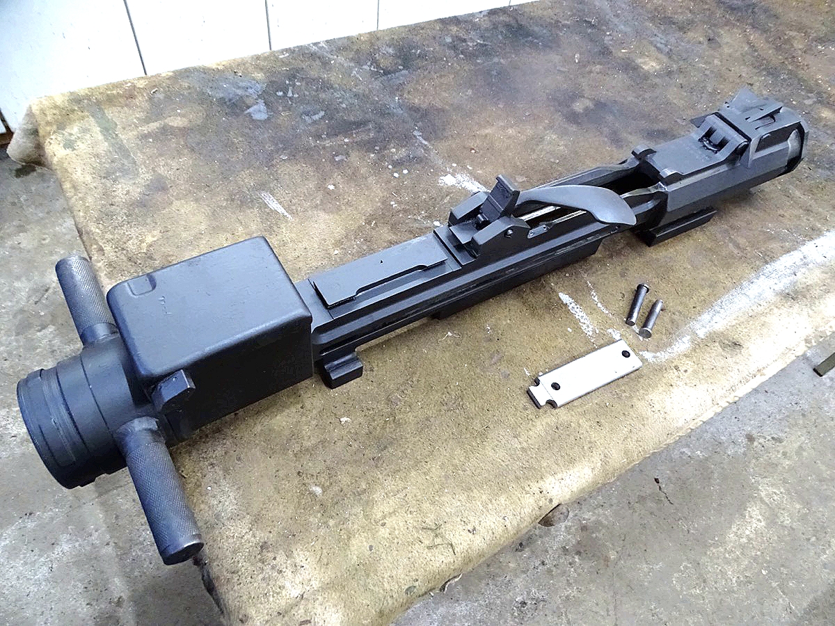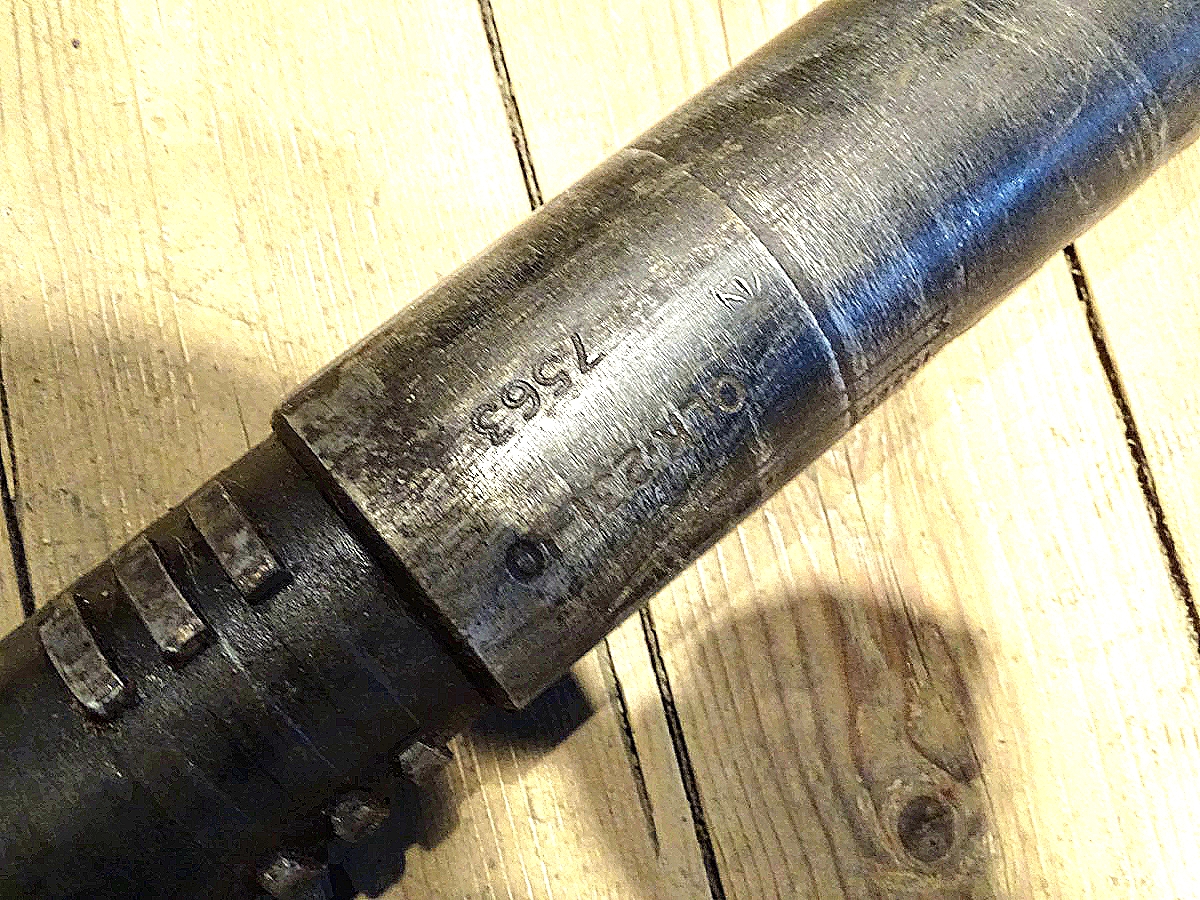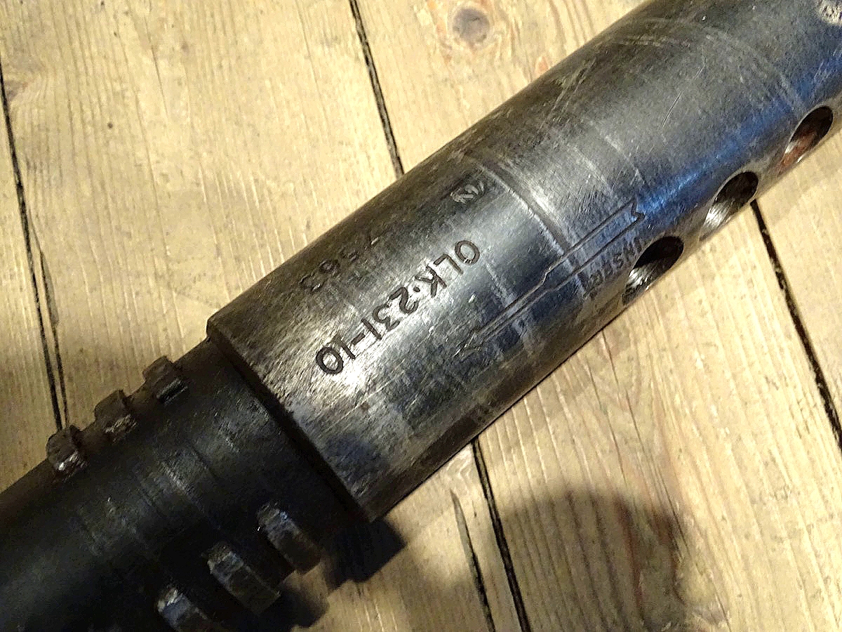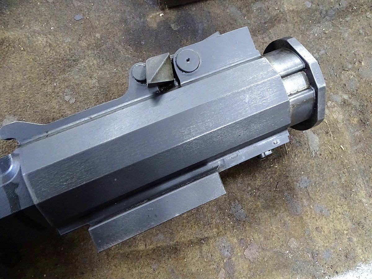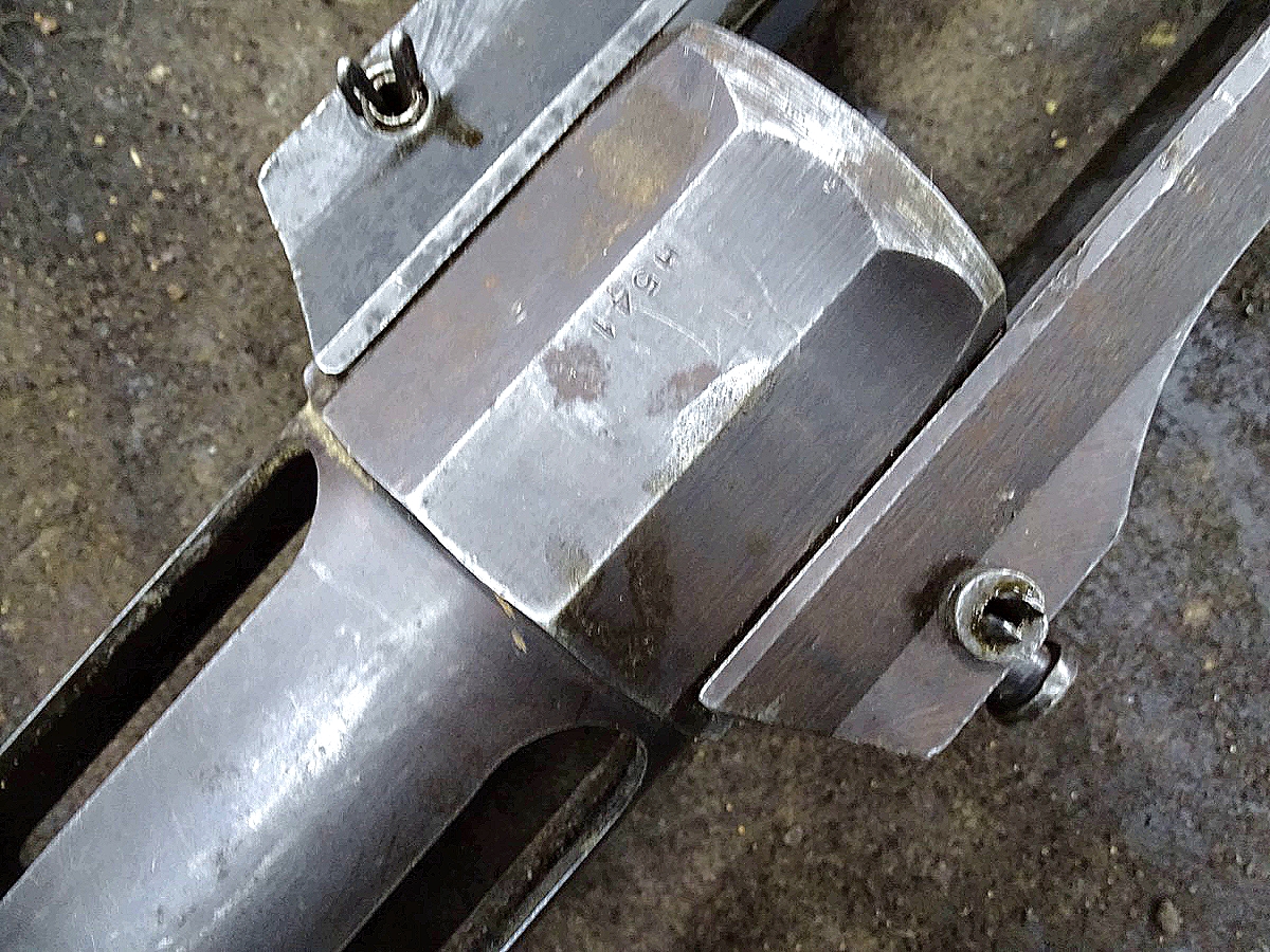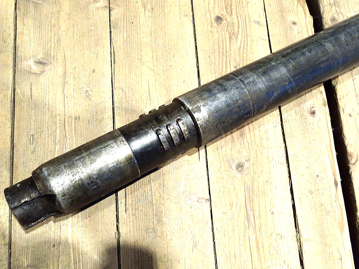 Geliefert werden die fotografierten Bauteile. Dekoumbau. Abgeändert nach den Bestimmungen des KWKG. Optisch so unauffällig wie möglich geändert. 7 kalibergroße Lochbohrungen im Lauf. In vorderster Lochbohrung ein gehärteter, kalibergroßer Stahlstift verschweißt, der den Lauf- Innendurchmesser vollständig ausfüllt. Im Patronenleger ein gehärteter, kalibergroßer Stahlstift eingesetzt und flächig verschweißt. Schlosskopf auf ca. 1 cm gekürzt, so dass der Stoßboden vollständig entfernt wurde. Schlagbolzenaustritt flächig verschweißt.