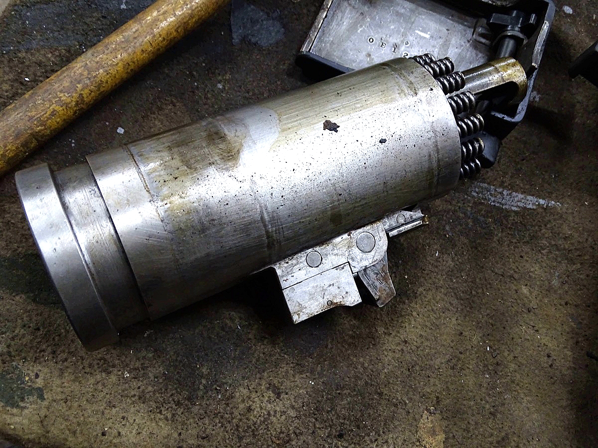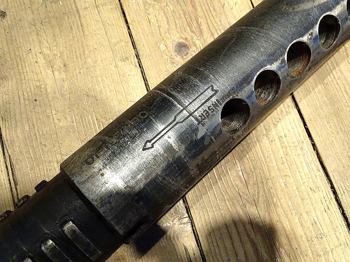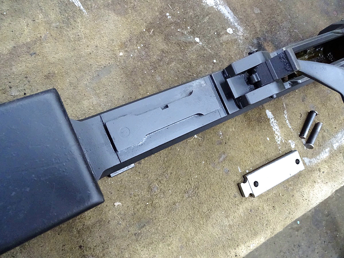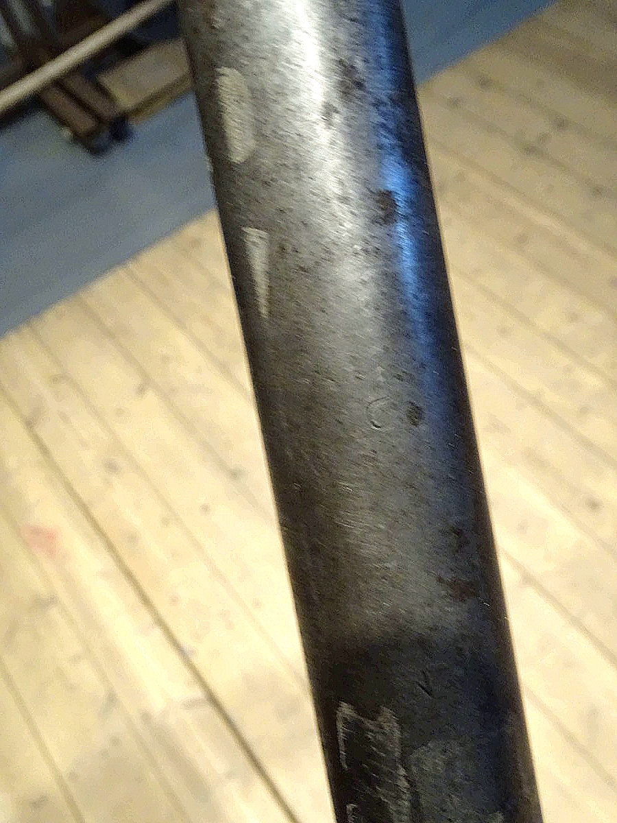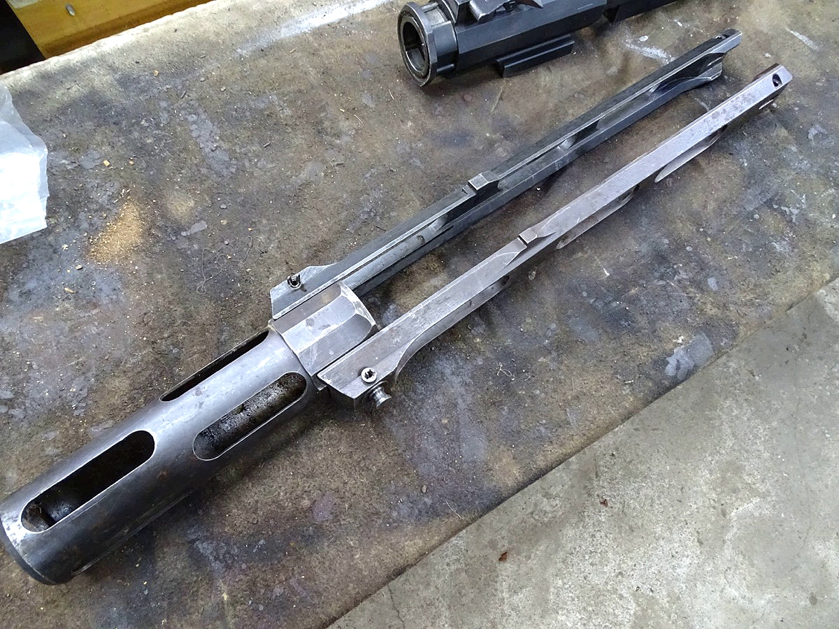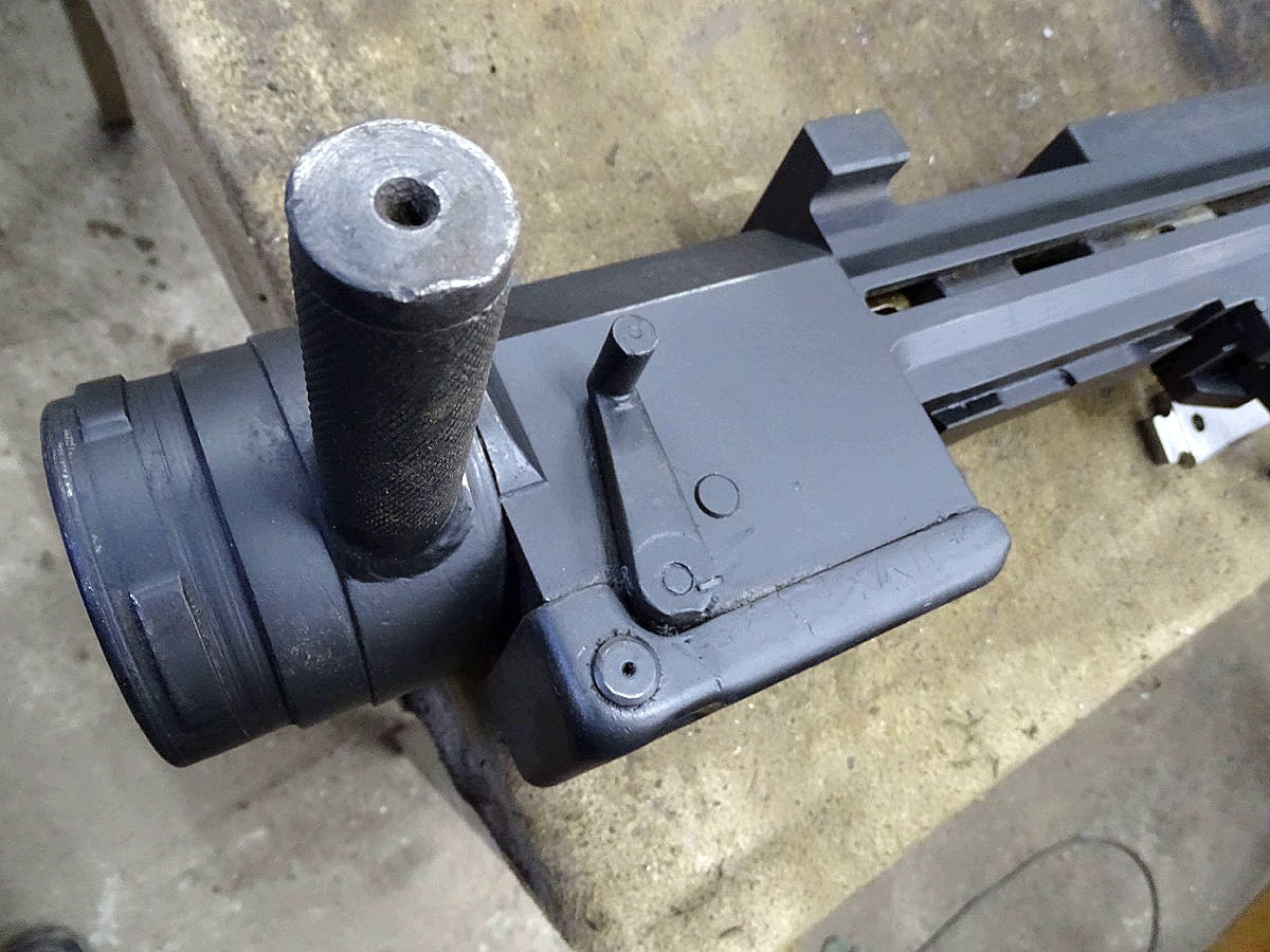 Geliefert werden die fotografierten Bauteile. Dekoumbau. Abgeändert nach den Bestimmungen des KWKG. Optisch so unauffällig wie möglich geändert. 7 kalibergroße Lochbohrungen im Lauf. In vorderster Lochbohrung ein gehärteter, kalibergroßer Stahlstift verschweißt, der den Lauf- Innendurchmesser vollständig ausfüllt. Im Patronenleger ein gehärteter, kalibergroßer Stahlstift eingesetzt und flächig verschweißt. Schlosskopf auf ca. 1 cm gekürzt, so dass der Stoßboden vollständig entfernt wurde. Schlagbolzenaustritt flächig verschweißt.