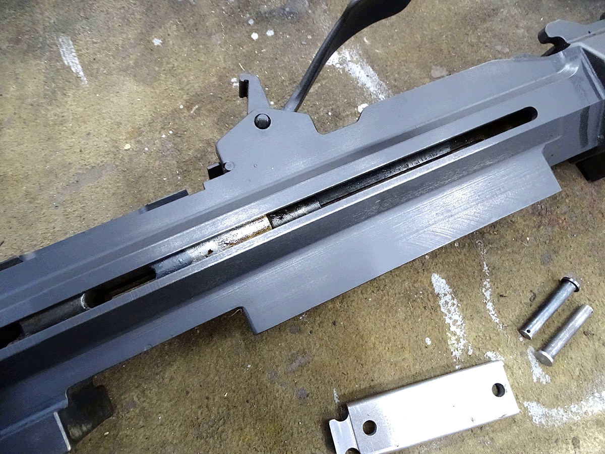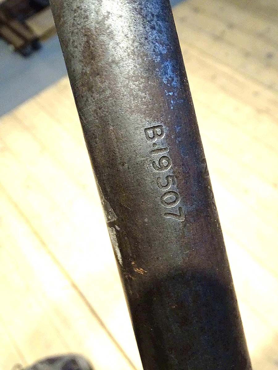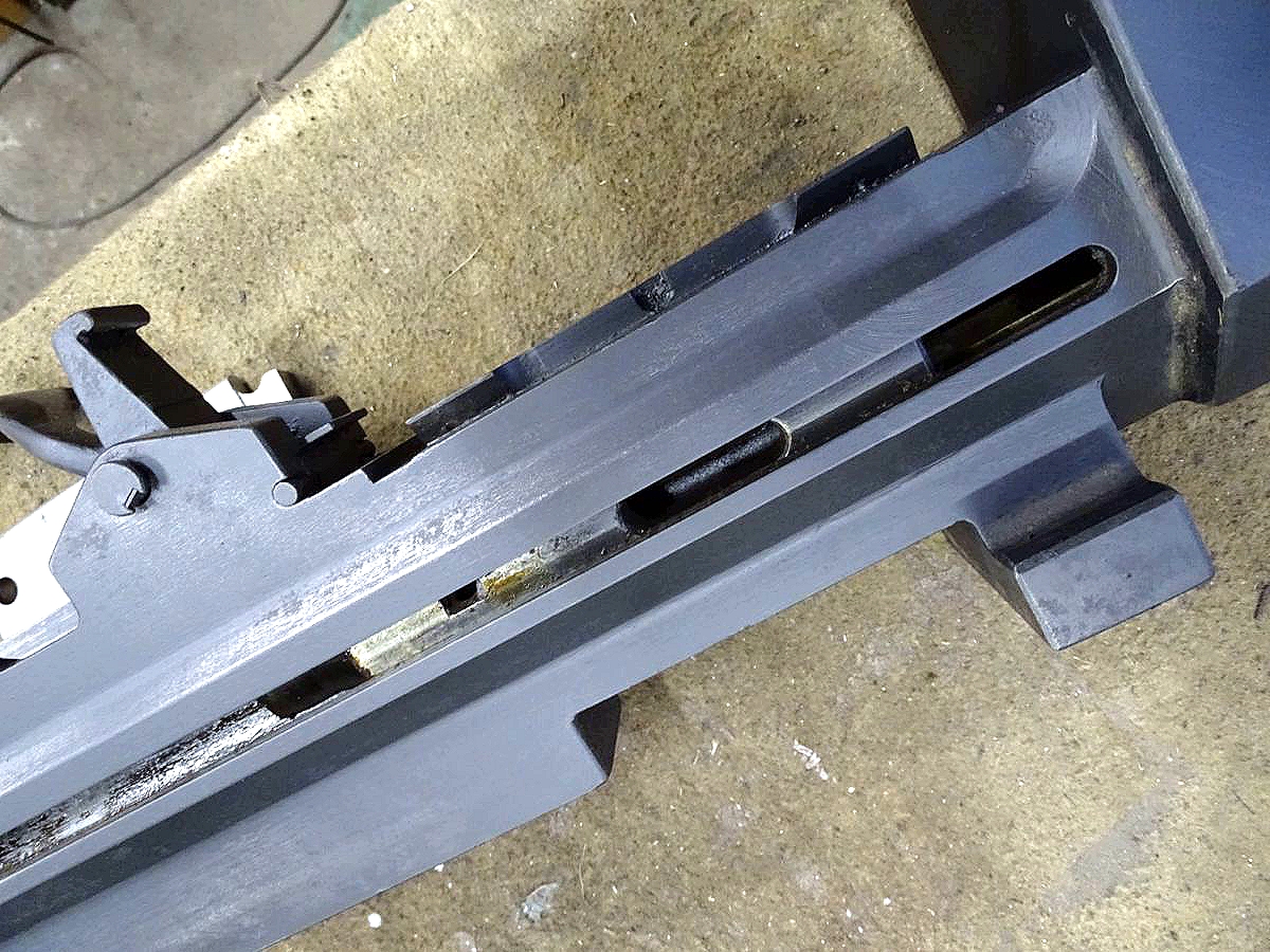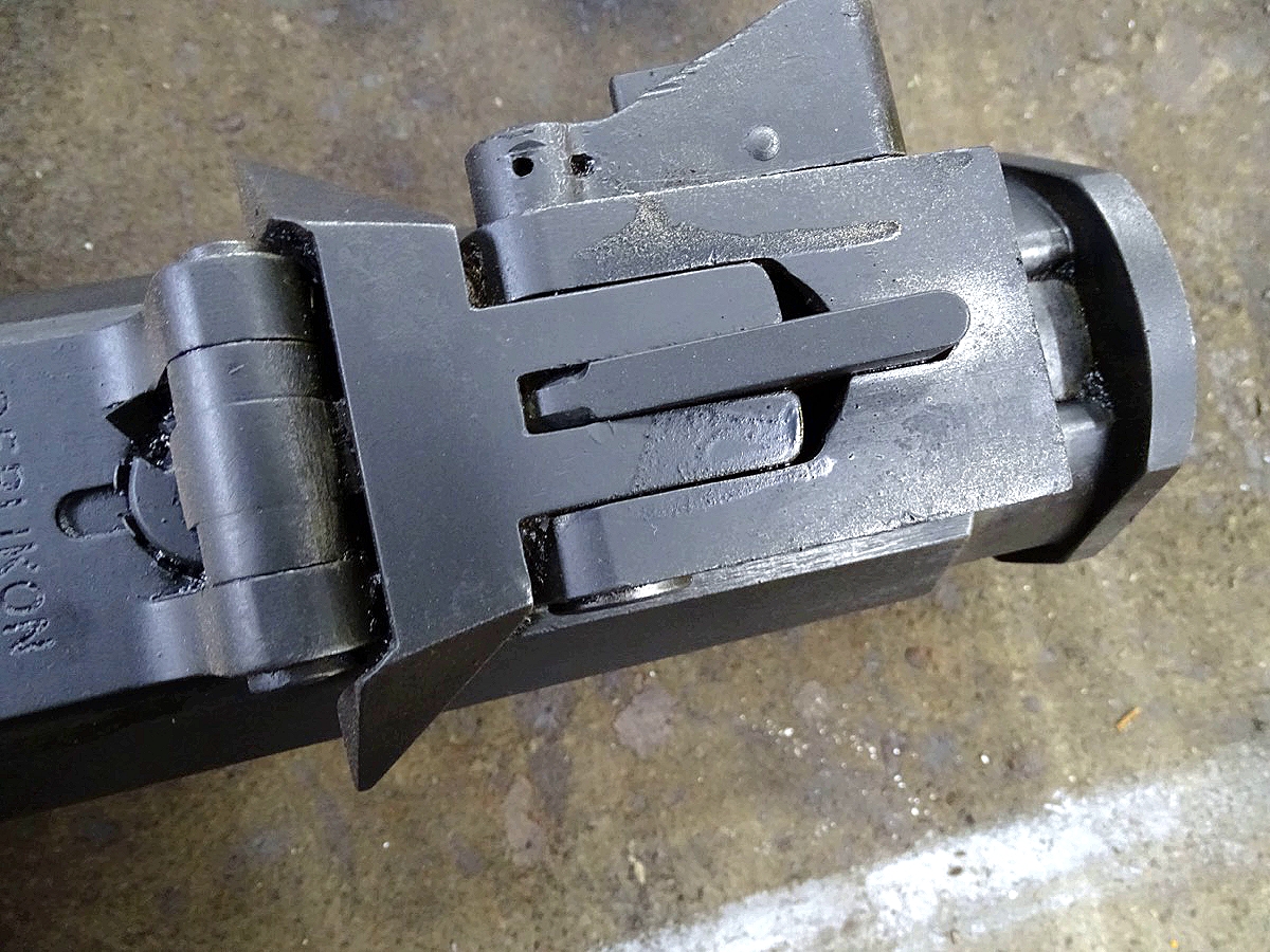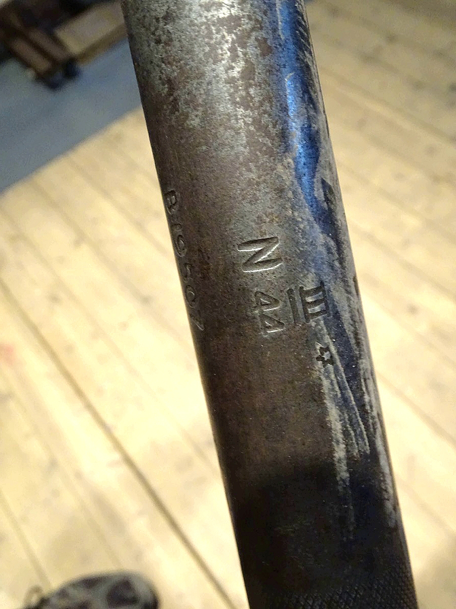Geliefert werden die fotografierten Bauteile. Dekoumbau. Abgeändert nach den Bestimmungen des KWKG. Optisch so unauffällig wie möglich geändert. 7 kalibergroße Lochbohrungen im Lauf. In vorderster Lochbohrung ein gehärteter, kalibergroßer Stahlstift verschweißt, der den Lauf- Innendurchmesser vollständig ausfüllt. Im Patronenleger ein gehärteter, kalibergroßer Stahlstift eingesetzt und flächig verschweißt. Schlosskopf auf ca. 1 cm gekürzt, so dass der Stoßboden vollständig entfernt wurde. Schlagbolzenaustritt flächig verschweißt.