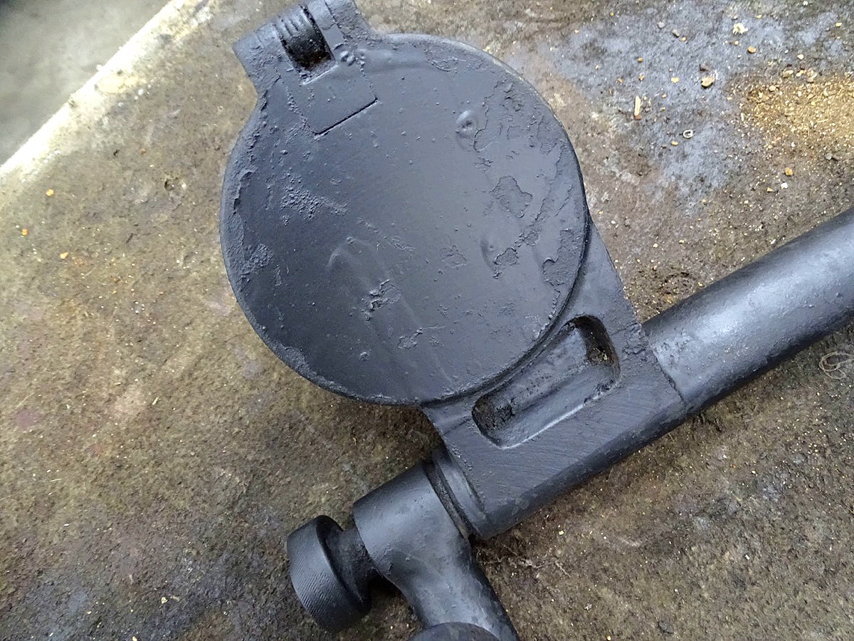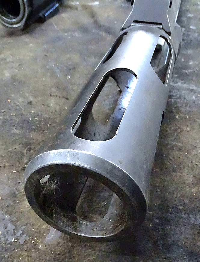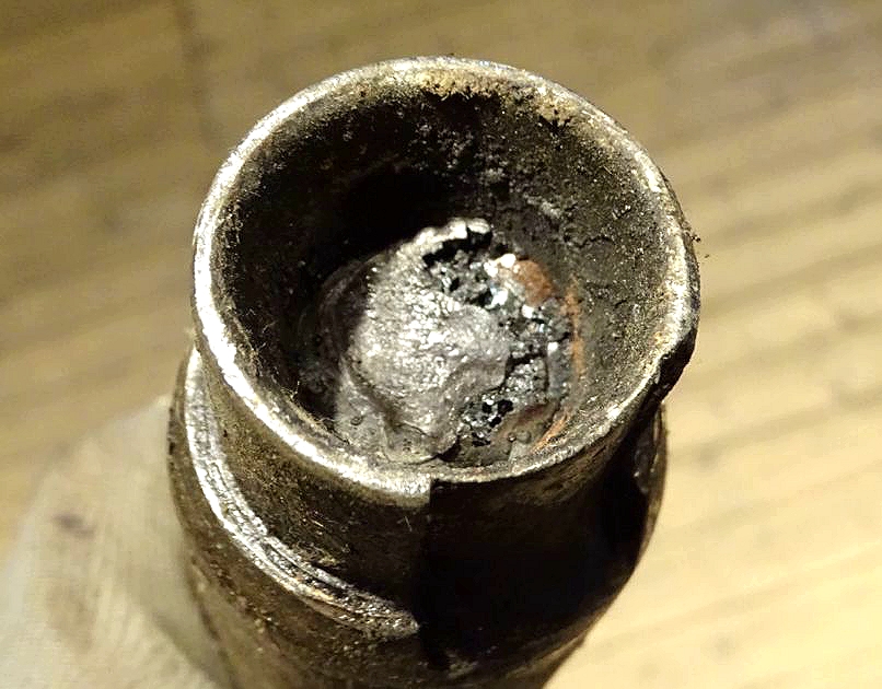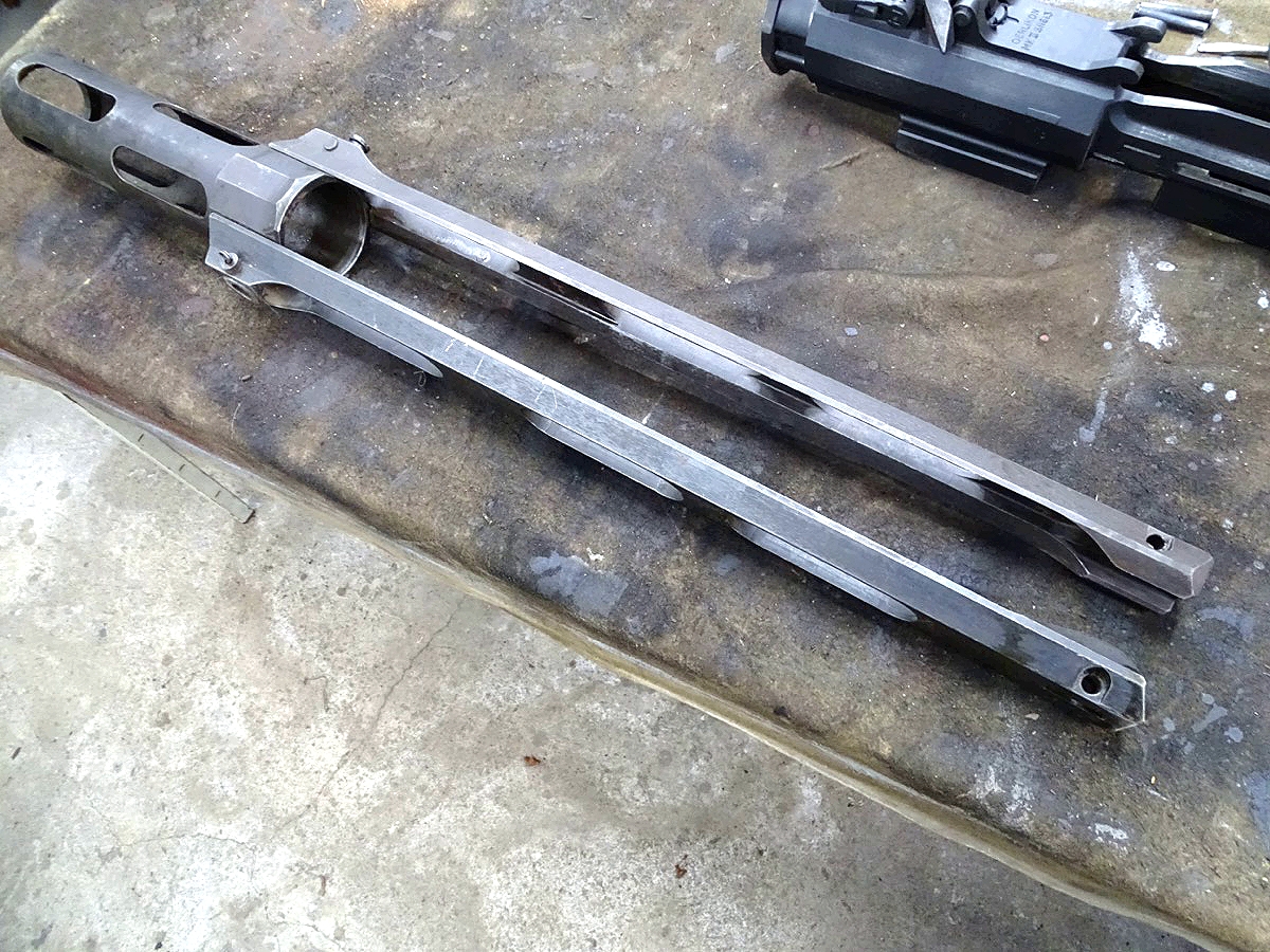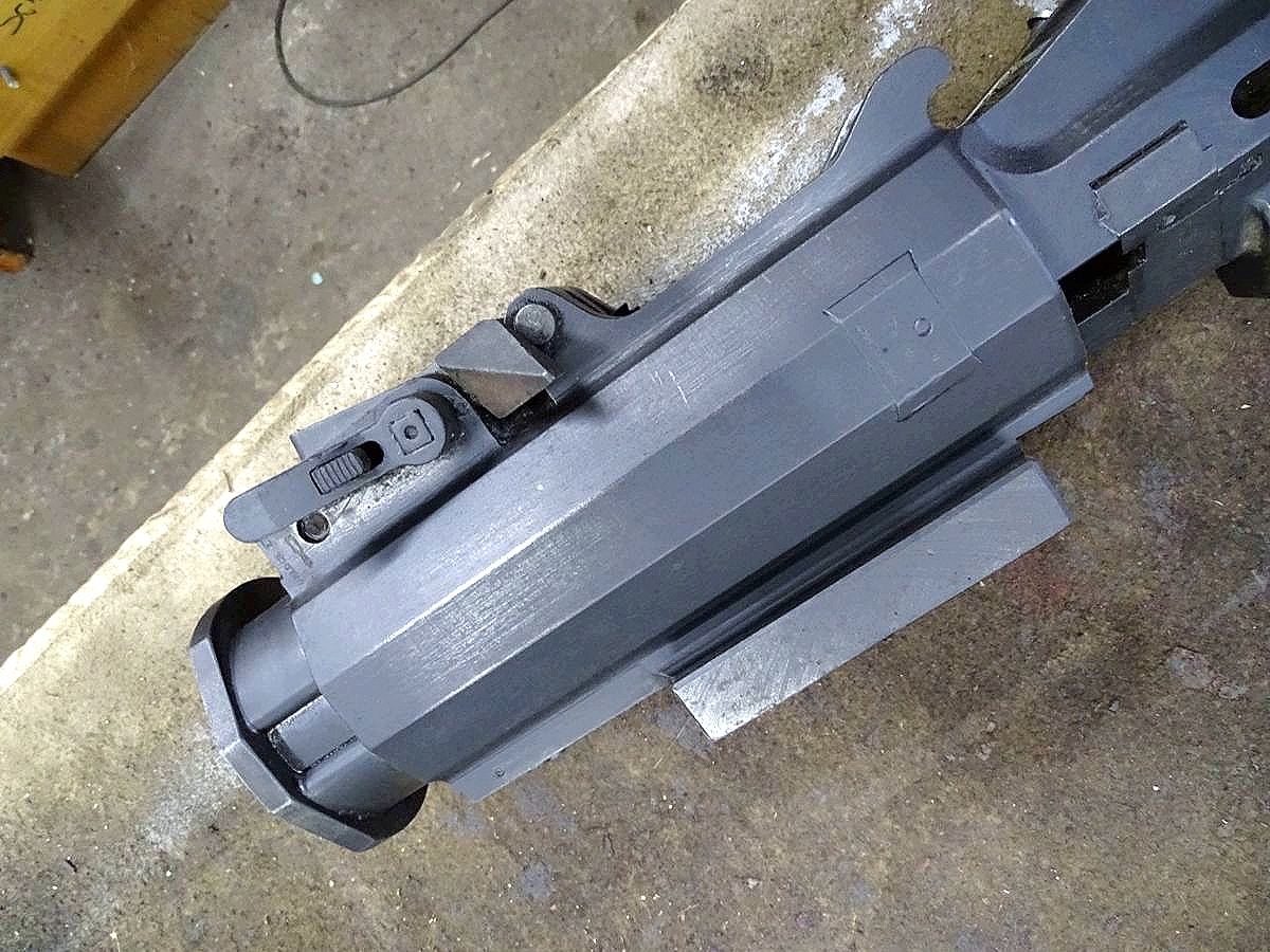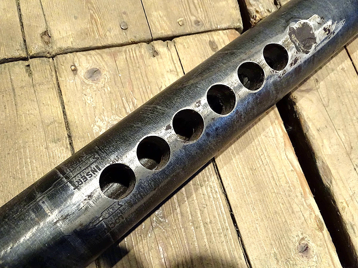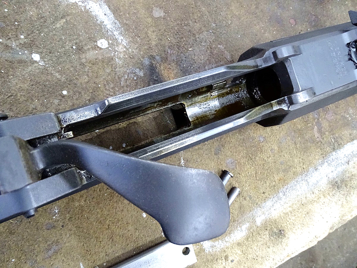 Geliefert werden die fotografierten Bauteile. Dekoumbau. Abgeändert nach den Bestimmungen des KWKG. Optisch so unauffällig wie möglich geändert. 7 kalibergroße Lochbohrungen im Lauf. In vorderster Lochbohrung ein gehärteter, kalibergroßer Stahlstift verschweißt, der den Lauf- Innendurchmesser vollständig ausfüllt. Im Patronenleger ein gehärteter, kalibergroßer Stahlstift eingesetzt und flächig verschweißt. Schlosskopf auf ca. 1 cm gekürzt, so dass der Stoßboden vollständig entfernt wurde. Schlagbolzenaustritt flächig verschweißt.
