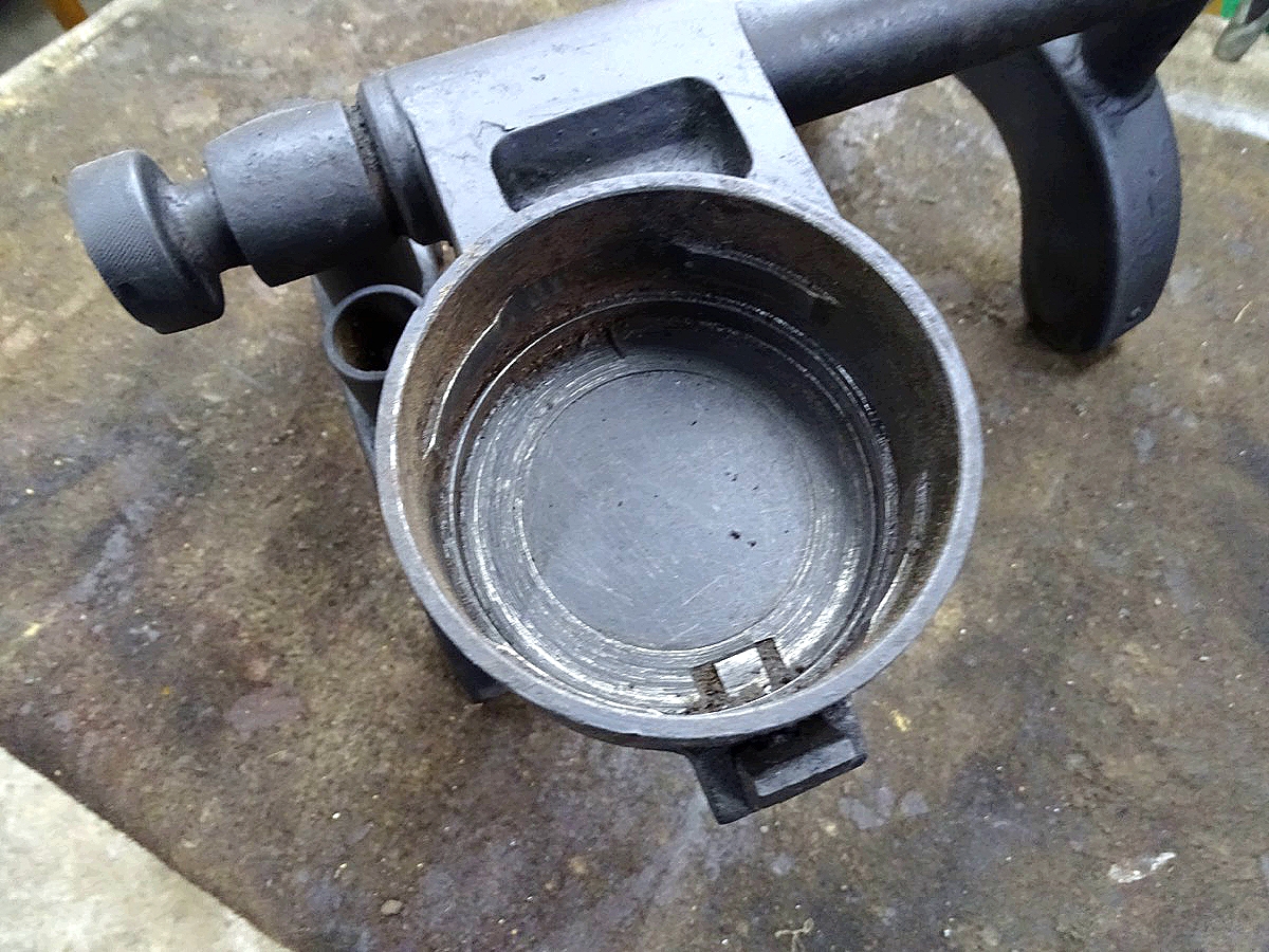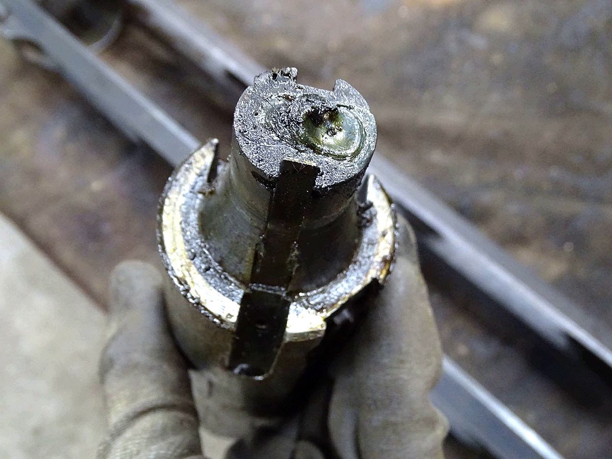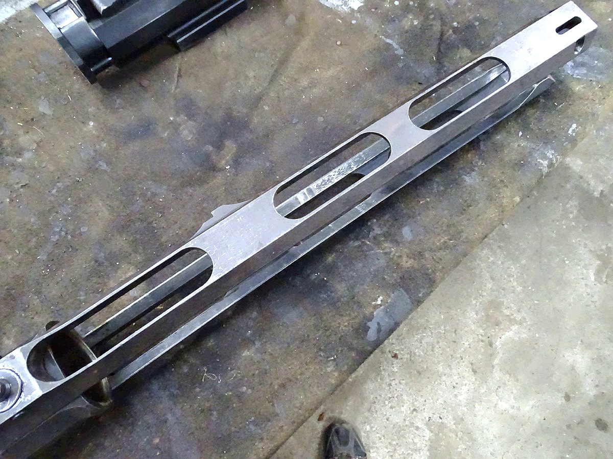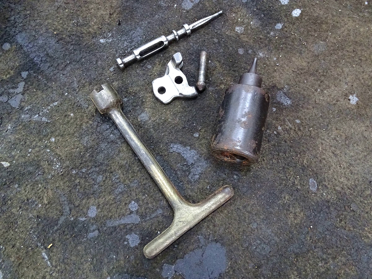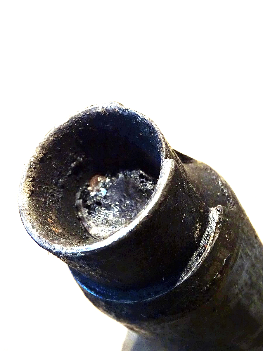 Geliefert werden die fotografierten Bauteile. Dekoumbau. Abgeändert nach den Bestimmungen des KWKG. Optisch so unauffällig wie möglich geändert. 7 kalibergroße Lochbohrungen im Lauf. In vorderster Lochbohrung ein gehärteter, kalibergroßer Stahlstift verschweißt, der den Lauf- Innendurchmesser vollständig ausfüllt. Im Patronenleger ein gehärteter, kalibergroßer Stahlstift eingesetzt und flächig verschweißt. Schlosskopf auf ca. 1 cm gekürzt, so dass der Stoßboden vollständig entfernt wurde. Schlagbolzenaustritt flächig verschweißt.