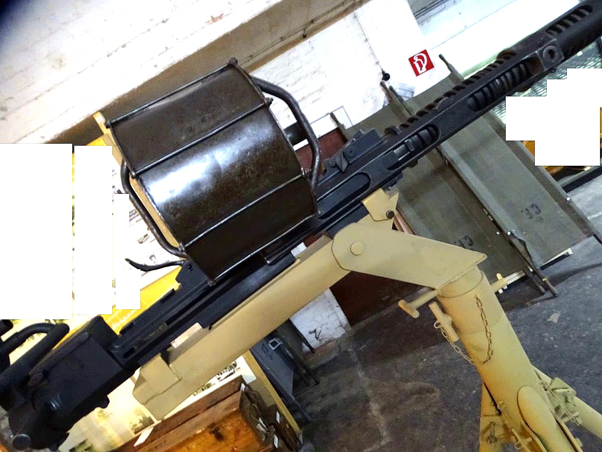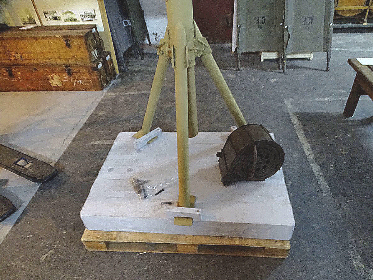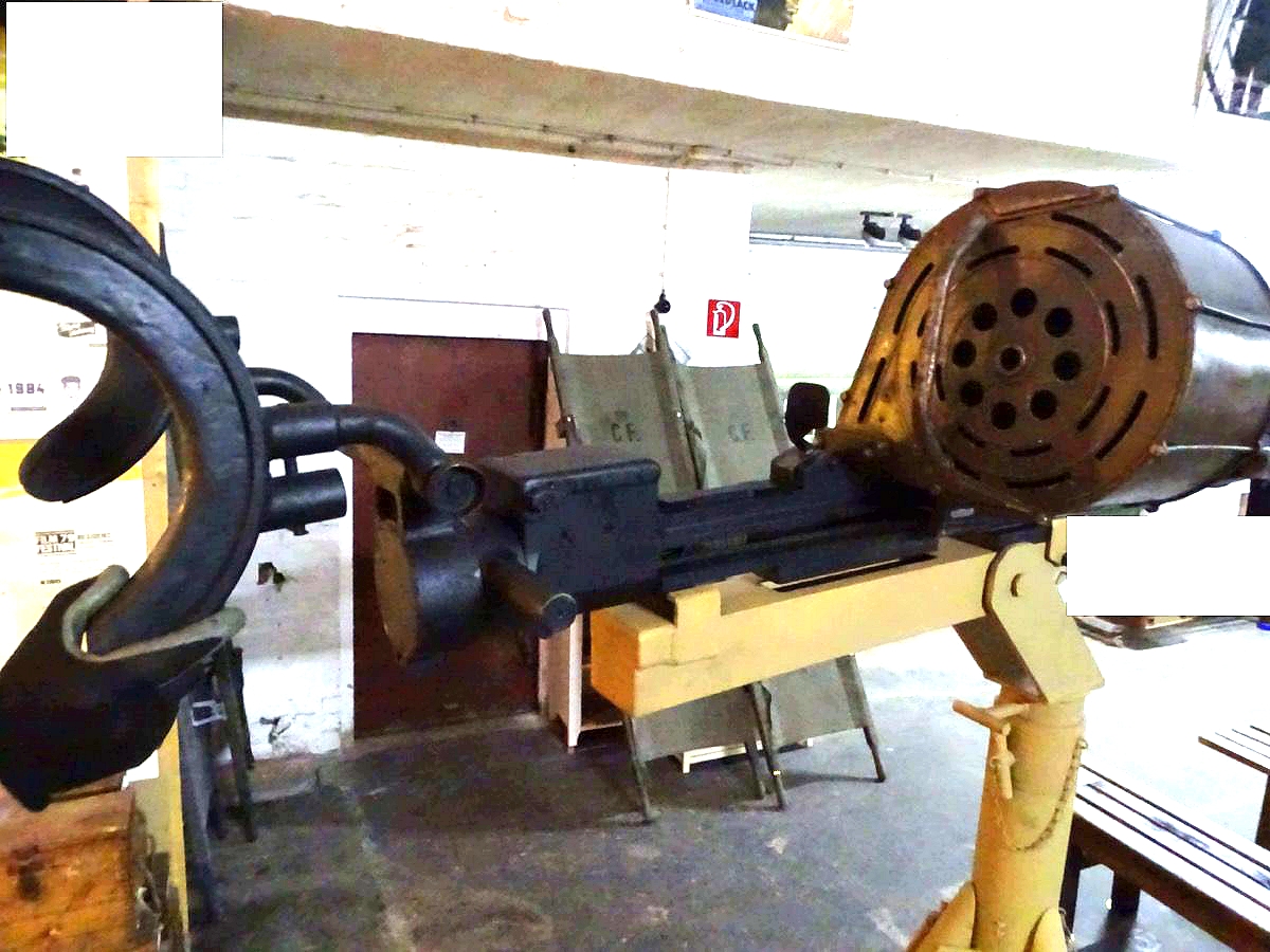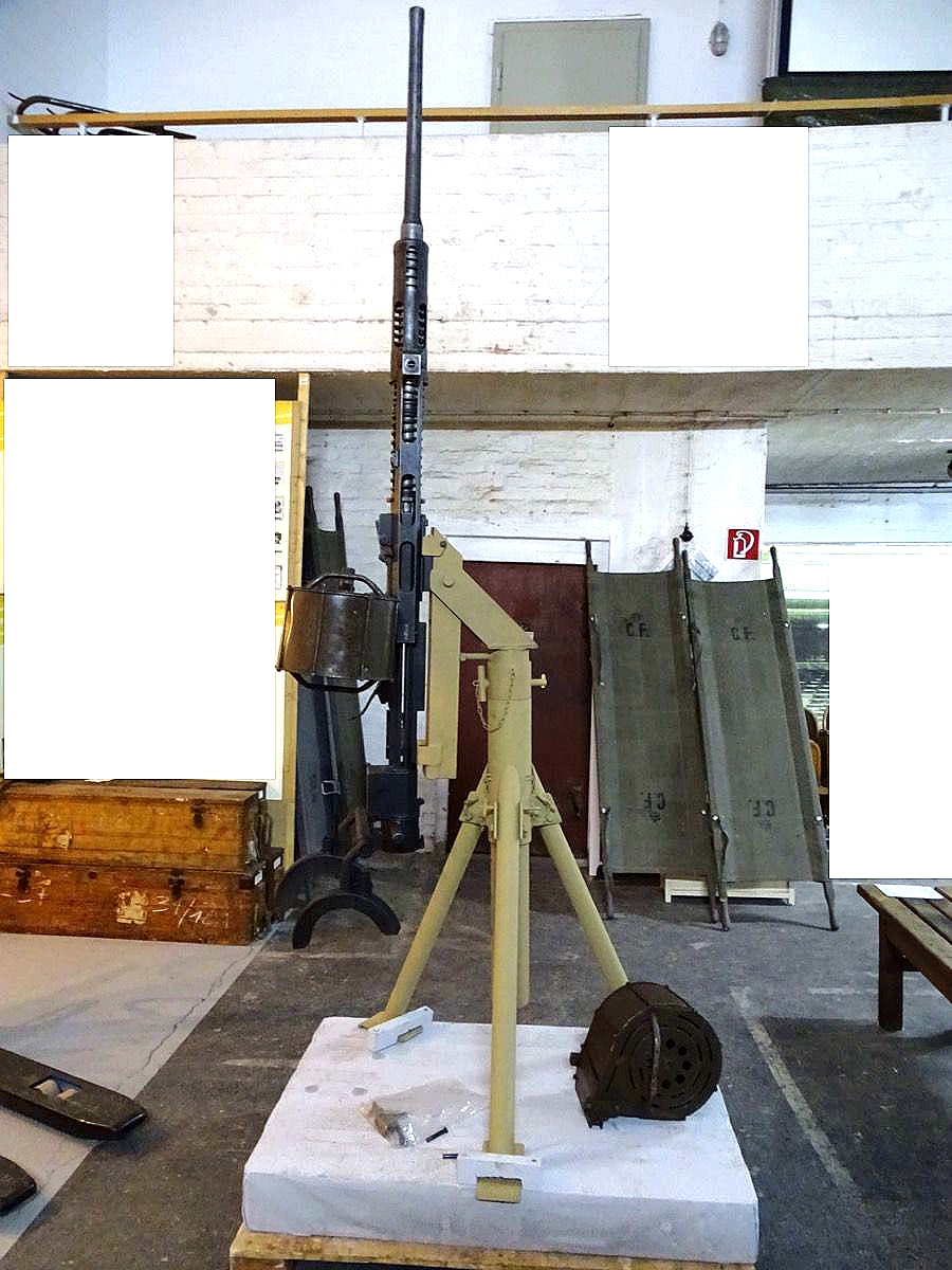 Die Behelfslafette in lehmgelb. Bei der Behelfslafette handelt es sich unserer Meinung nach um eine Nachkriegs Fertigung nach 1945. Behelfslafetten dieses Modells wurden so aber auch um 1944/45 in Deutschland für Marine, Küstenverteidigung und Front produziert. In der späten Kriegsphase baute man viele Waffen der Kriegsmarine und Luftwaffe für den Erdkampf um und vereinfachte die Fertigung von vielen Waffenteilen stark. Man kann die Beine arretieren und anklappen und die Höhe verstellen und die Waffe 360 Grad drehen und flach bis steil nach oben ausrichten. Die Lafette dürfte ca. 60 Kg wiegen, das Waffensystem ca. 100, das Magazin ca. 20, zusammen also grob 170-200 KG . Bei Aufstellung sollte das Stück auf jeden Fall -wie im Einsatz - am Boden auf dem Sockel gut befestigt werden, da die Kanone sonst durch das hohe Waffengewicht bei Bewegungen zu instabil steht und umfallen würde. Kanone aufstellen und über die Standplatten der Lafette einen Balken als Riegel an der Palette fest schrauben, alles dabei. Eine solche Lafette würde bei einer Schlosserei als Einzelanfertigung ca. 1800-2000€ kosten. Somit verbleibt bei einem Verkaufspreis von 4900€ für das Waffensystem mit den 2 Magazinen und Kleinteileset und Sockel ein reiner Kaufpreis Anteil von nur 3000€. Wir verkaufen das Waffensystem aber nicht einzeln, da wir sie mit der Lafette angekauft haben und eine einzelne Lafette für uns schwer verkäuflich ist, da kaum einer einzelne Waffen dazu besitzt.