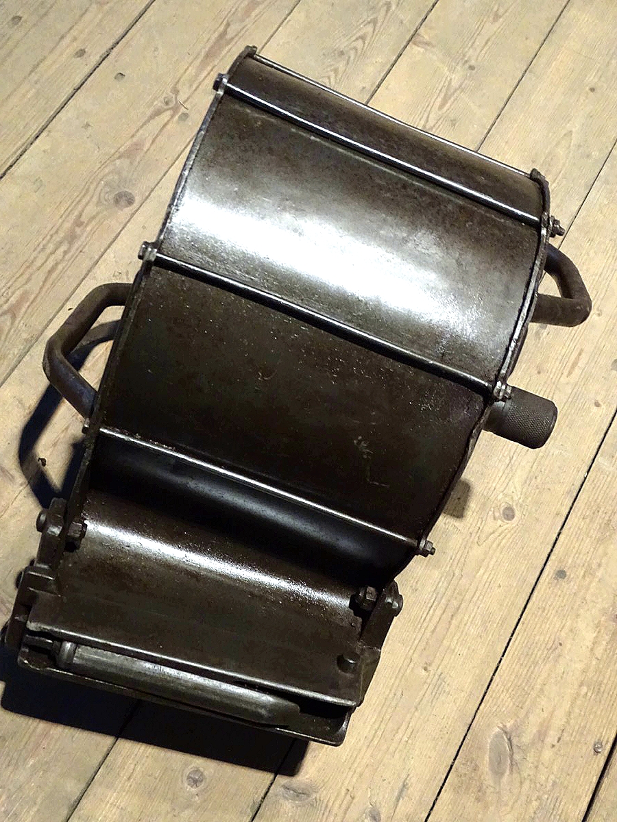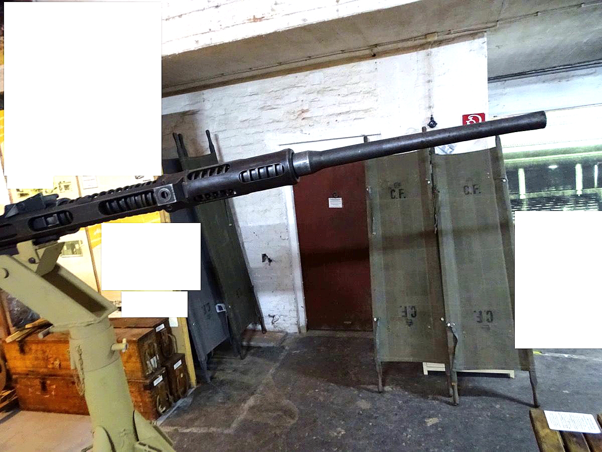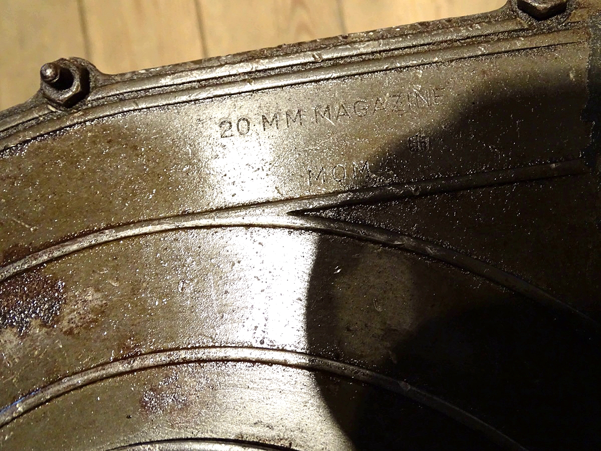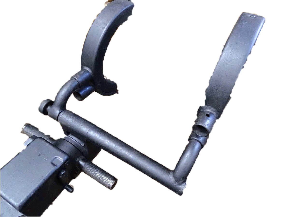 Die Behelfslafette in lehmgelb. Bei der Behelfslafette handelt es sich unserer Meinung nach um eine Nachkriegs Fertigung nach 1945. Behelfslafetten dieses Modells wurden so aber auch um 1944/45 in Deutschland für Marine, Küstenverteidigung und Front produziert. In der späten Kriegsphase baute man viele Waffen der Kriegsmarine und Luftwaffe für den Erdkampf um und vereinfachte die Fertigung von vielen Waffenteilen stark. Man kann die Beine arretieren und anklappen und die Höhe verstellen und die Waffe 360 Grad drehen und flach bis steil nach oben ausrichten. Die Lafette dürfte ca. 60 Kg wiegen, das Waffensystem ca. 100, das Magazin ca. 20, zusammen also grob 170-200 KG . Bei Aufstellung sollte das Stück auf jeden Fall -wie im Einsatz - am Boden auf dem Sockel gut befestigt werden, da die Kanone sonst durch das hohe Waffengewicht bei Bewegungen zu instabil steht und umfallen würde. Kanone aufstellen und über die Standplatten der Lafette einen Balken als Riegel an der Palette fest schrauben, alles dabei. Eine solche Lafette würde bei einer Schlosserei als Einzelanfertigung ca. 1800-2000€ kosten. Somit verbleibt bei einem Verkaufspreis von 4900€ für das Waffensystem mit den 2 Magazinen und Kleinteileset und Sockel ein reiner Kaufpreis Anteil von nur 3000€. Wir verkaufen das Waffensystem aber nicht einzeln, da wir sie mit der Lafette angekauft haben und eine einzelne Lafette für uns schwer verkäuflich ist, da kaum einer einzelne Waffen dazu besitzt.
