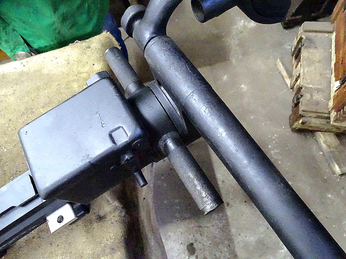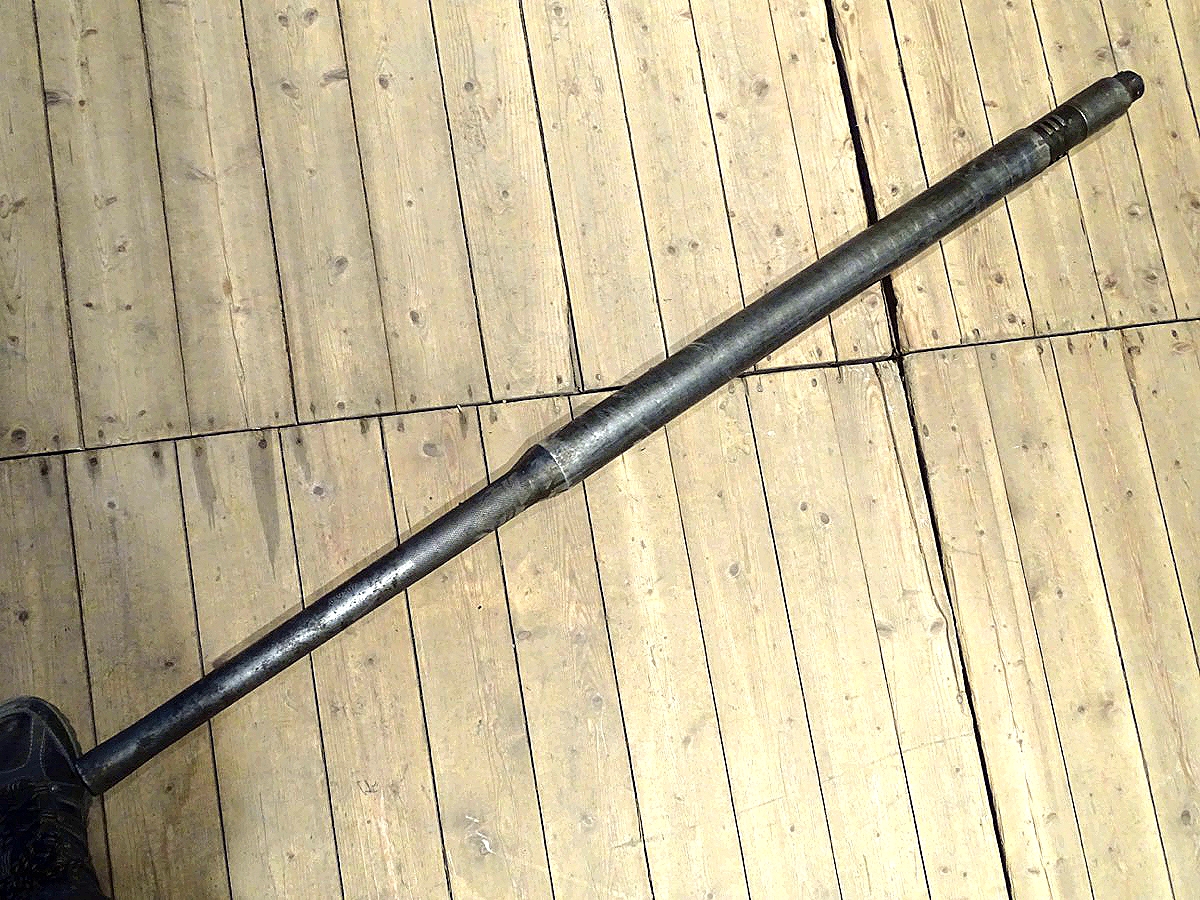 Platzbedarf: Das Rohr mit Waffensystem und Schulterstütze ist ca. 2,50 m lang. Auf dem Foto ist das Rohr nur lose ins System gesteckt. Im Gehäuse arretiert müßte die Waffe also noch etwas kürzer werden.
