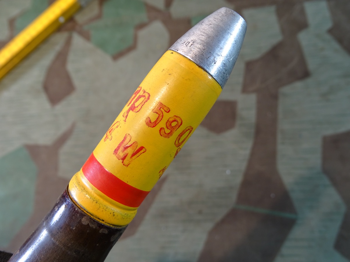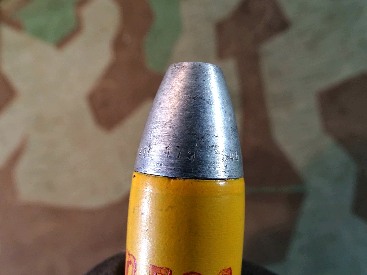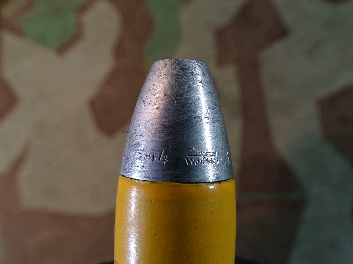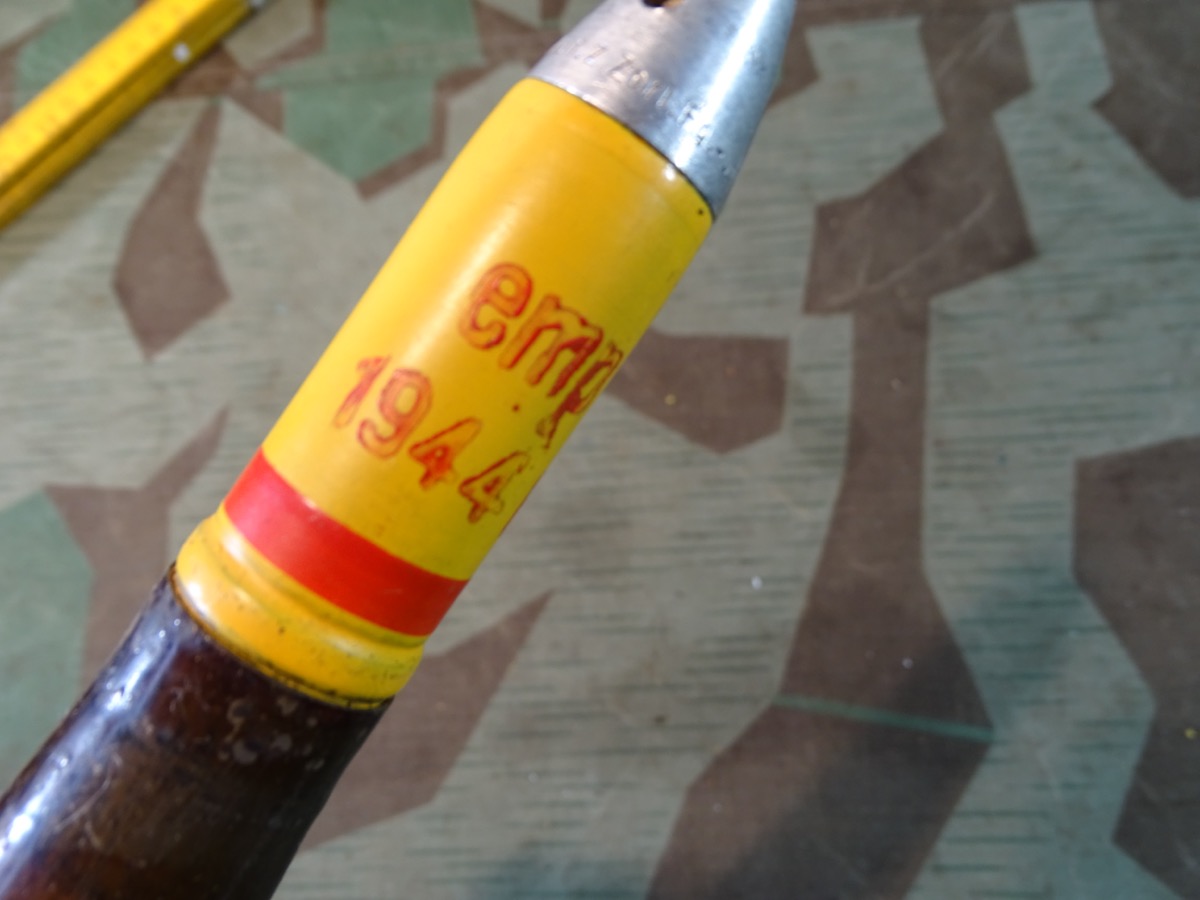 Wehrmacht, 2. Weltkrieg Flak. Gute Erhaltung, kompl. mit Deko-Sprenggranate, diese mit wahrscheinlich mal vor längerer Zeit authentisch erneuerter, gelber Lackierung. Sehr gut gemacht.