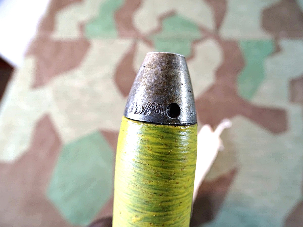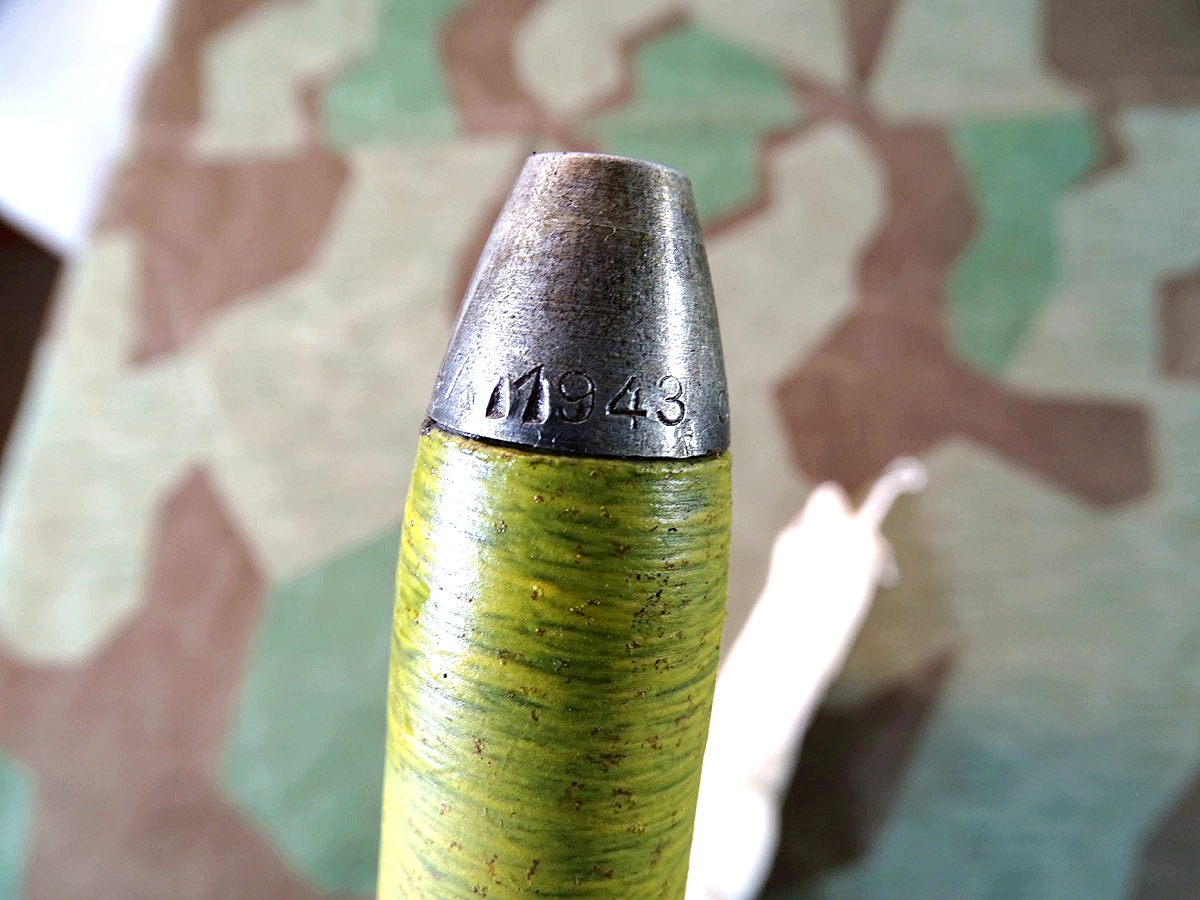 Wehrmacht, 2. Weltkrieg Flak. Gute Erhaltung, kompl. mit Deko-Sprenggranate, diese mit wahrscheinlich mal vor längerer Zeit authentisch erneuerter, gelber Lackierung. Gut gemacht.