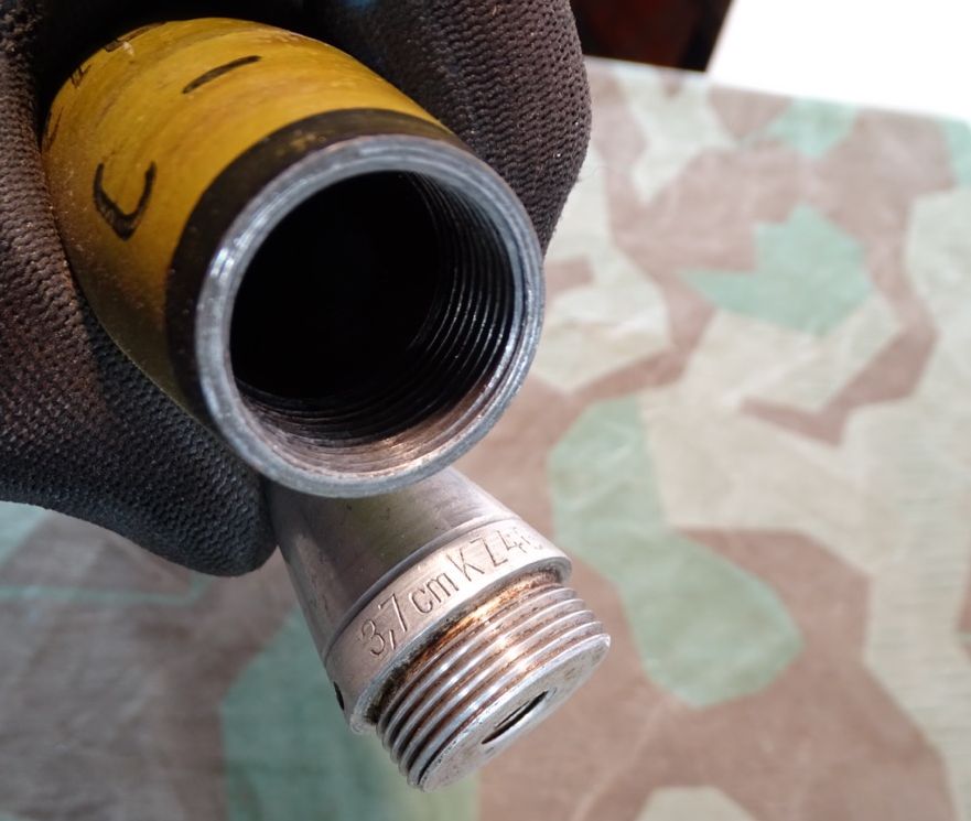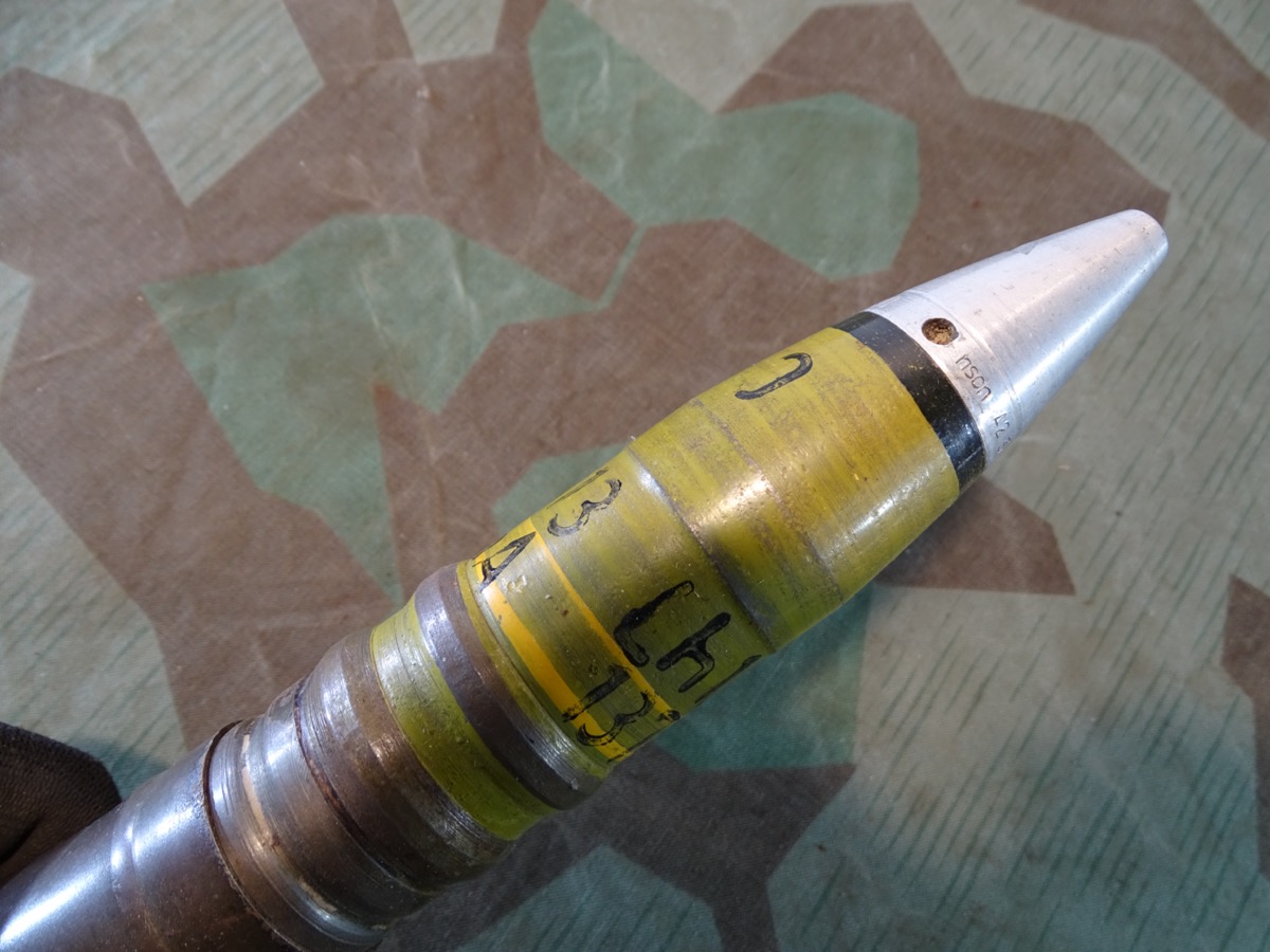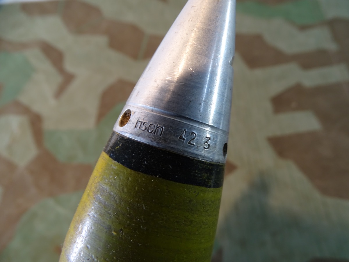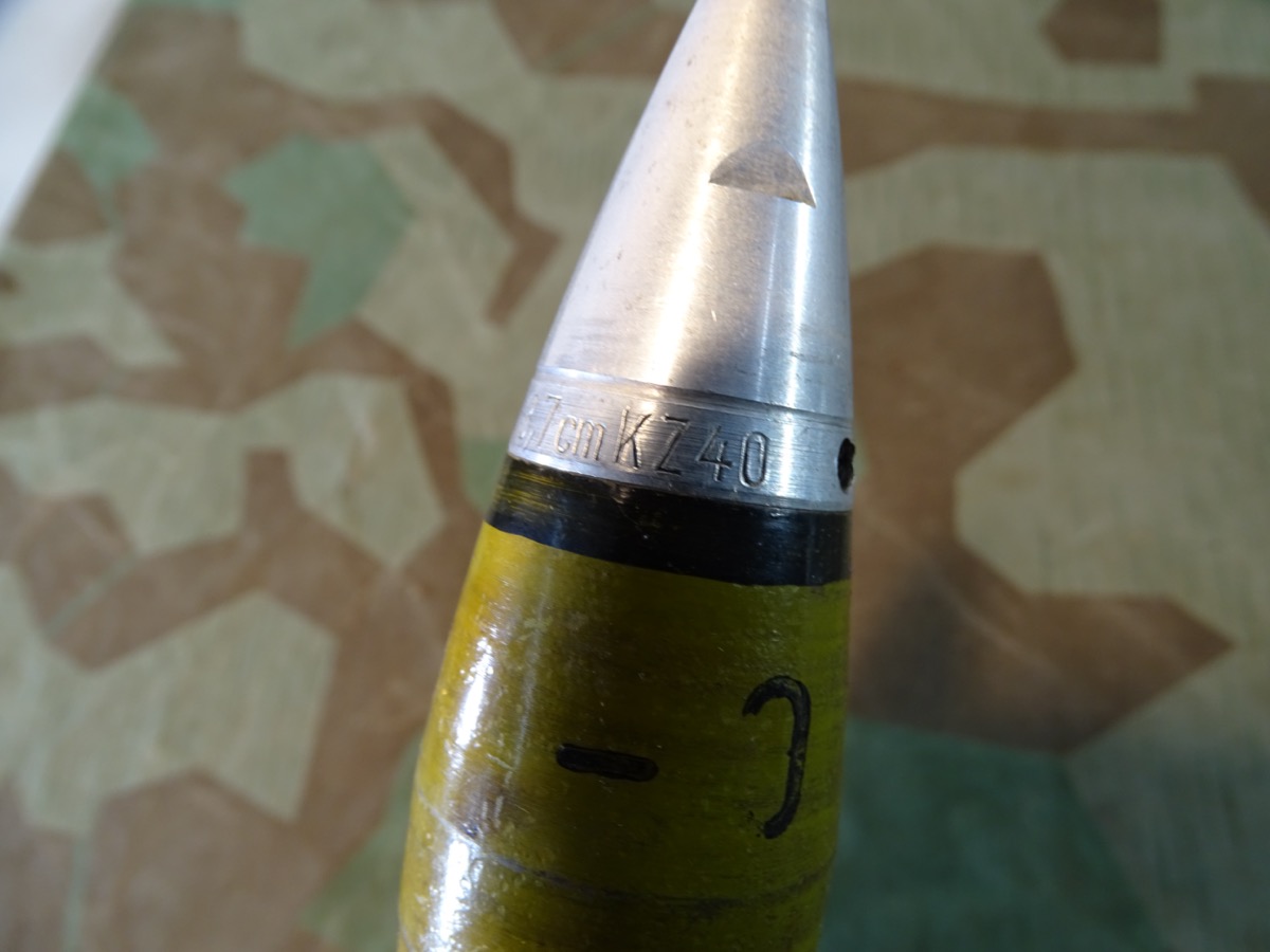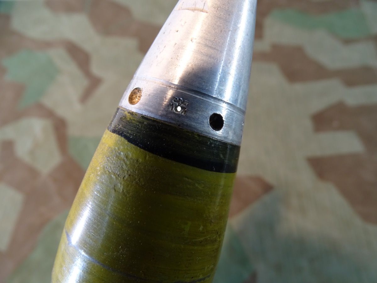 Sehr gut erhaltener 3,7 cm KZ 40- Kopfzünder 40 mit deutlicher Marine Abnahme. Alle Gewinde leichtgängig und gut erhalten. Leuchtspureinsatz des Geschosses gut erhalten. Geschoss mit glatter Metalloberfläche und noch einigen lesbaren Schlagstempeln. Gelbe Farbe und Beschriftung könnten mal vor längerer Zeit erneuert worden sein, wobei die gelbe Farbe durchaus authentisch aussieht. Hülse schön glatt und in Originalfinnish erhalten, Bodenplatte teils narbig. Kein Versand ins Ausland , NO Shipping to foreign countrys possible.