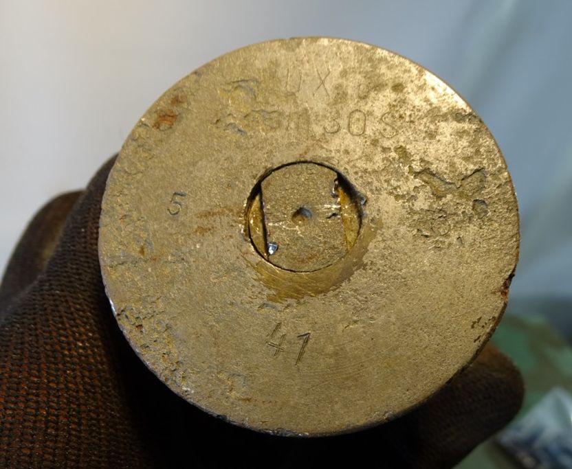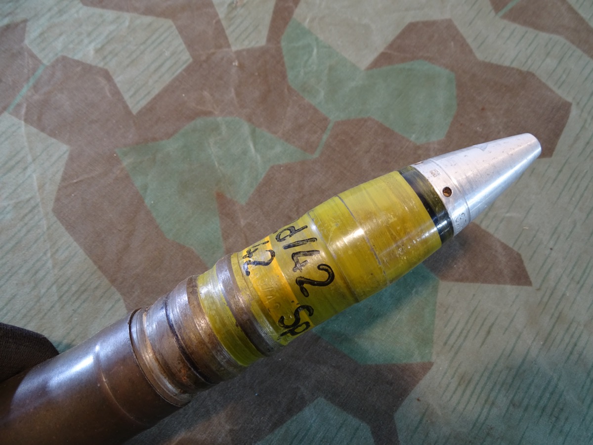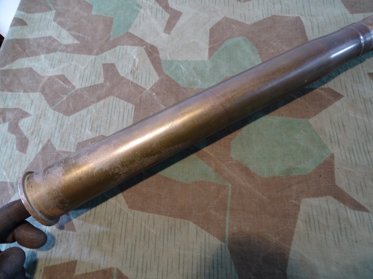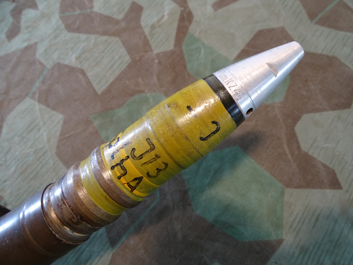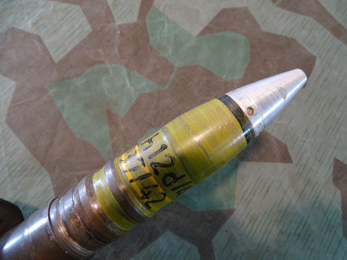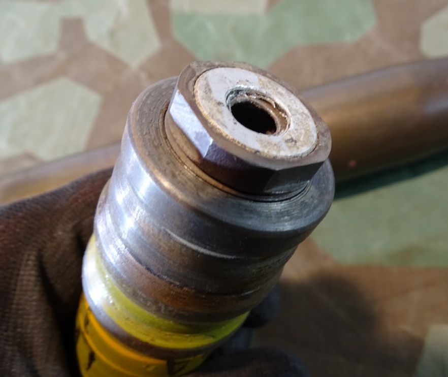 Sehr gut erhaltener 3,7 cm KZ 40- Kopfzünder 40 mit deutlicher Marine Abnahme. Alle Gewinde leichtgängig und gut erhalten. Leuchtspureinsatz des Geschosses gut erhalten. Geschoss mit glatter Metalloberfläche und noch einigen lesbaren Schlagstempeln. Gelbe Farbe und Beschriftung könnten mal vor längerer Zeit erneuert worden sein, wobei die gelbe Farbe durchaus authentisch aussieht. Hülse schön glatt und in Originalfinnish erhalten, Bodenplatte teils narbig. Kein Versand ins Ausland , NO Shipping to foreign countrys possible.