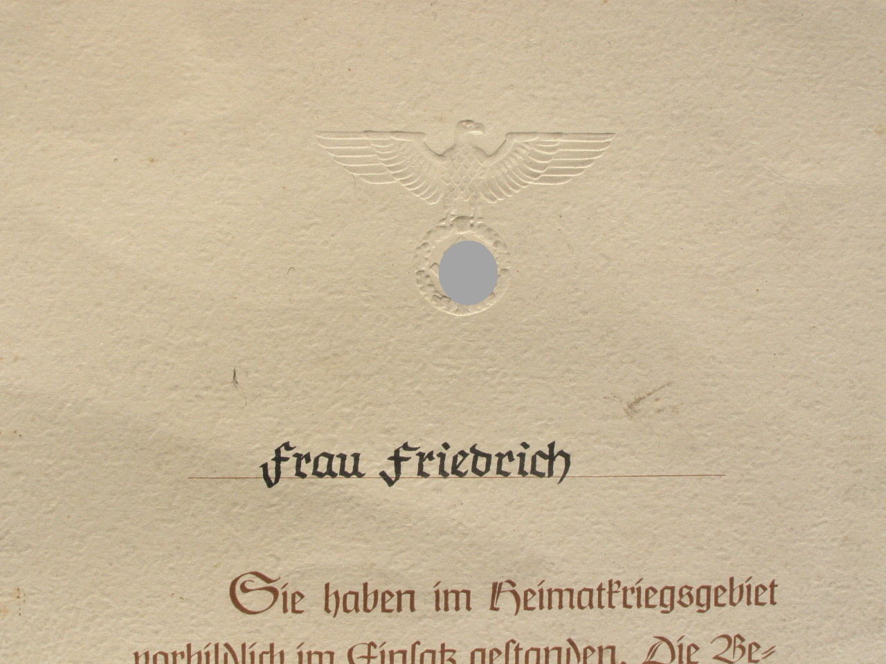 Kreis Münster / Warendorf für den vorbildlichen Einsatz im Heimatkriegsgebiet im Kriegsjahr 1942 für Frau Freidrich. Originalunterschriften Kreisfrauenschaftsleiterein und Kreisleiter.