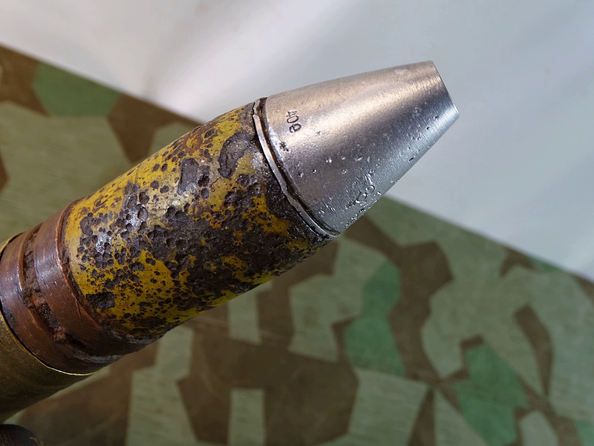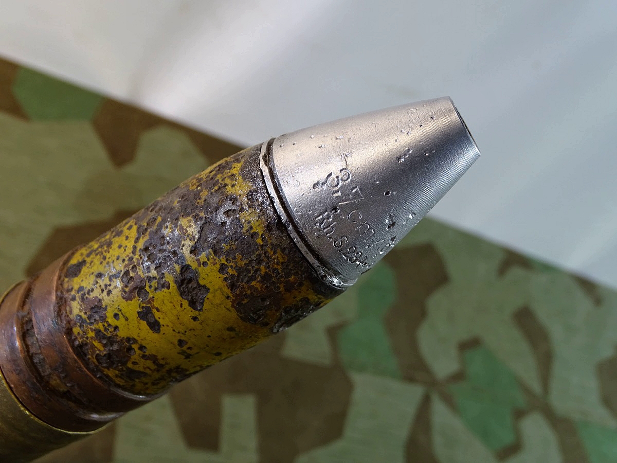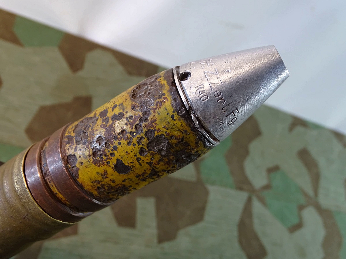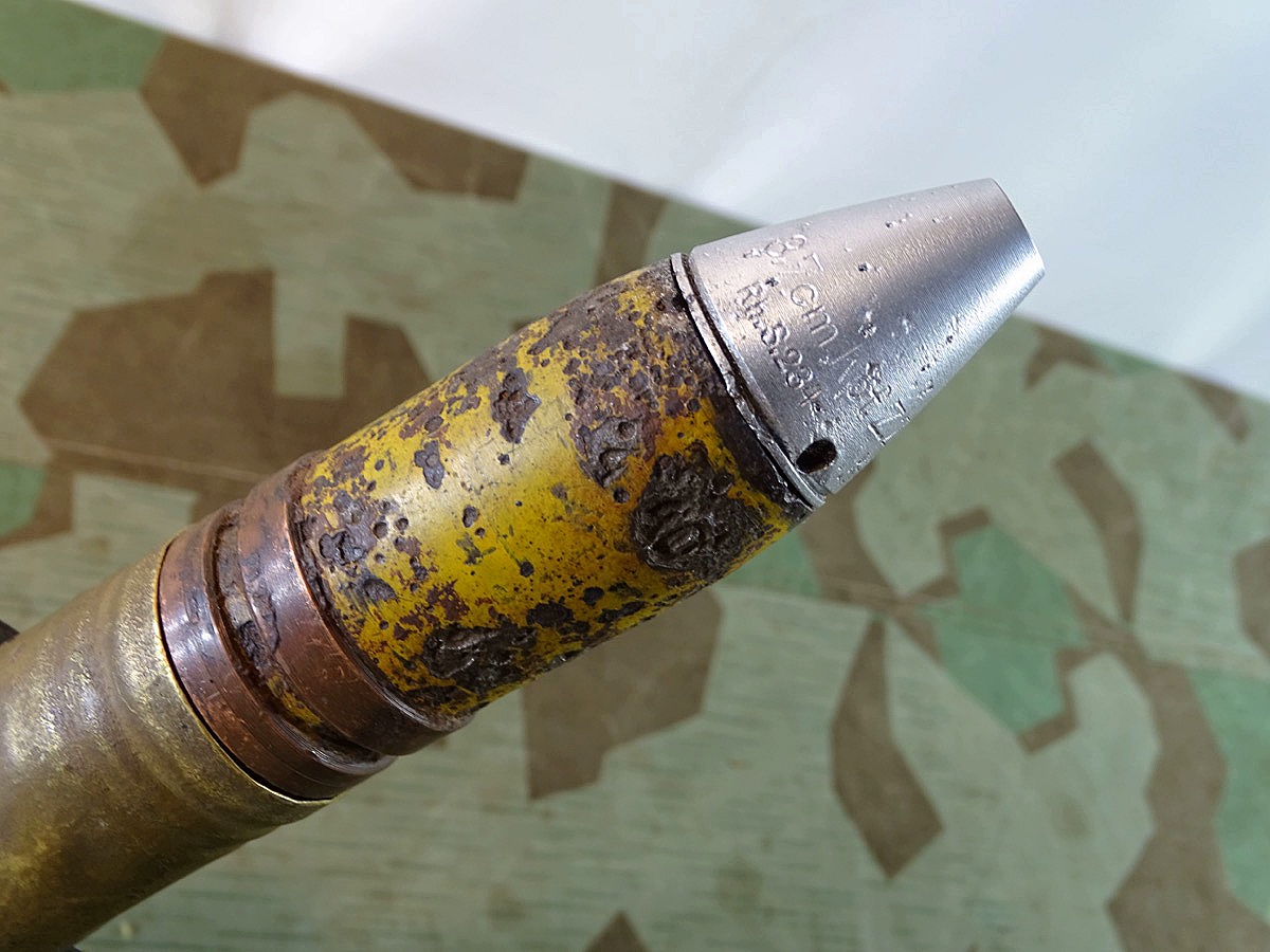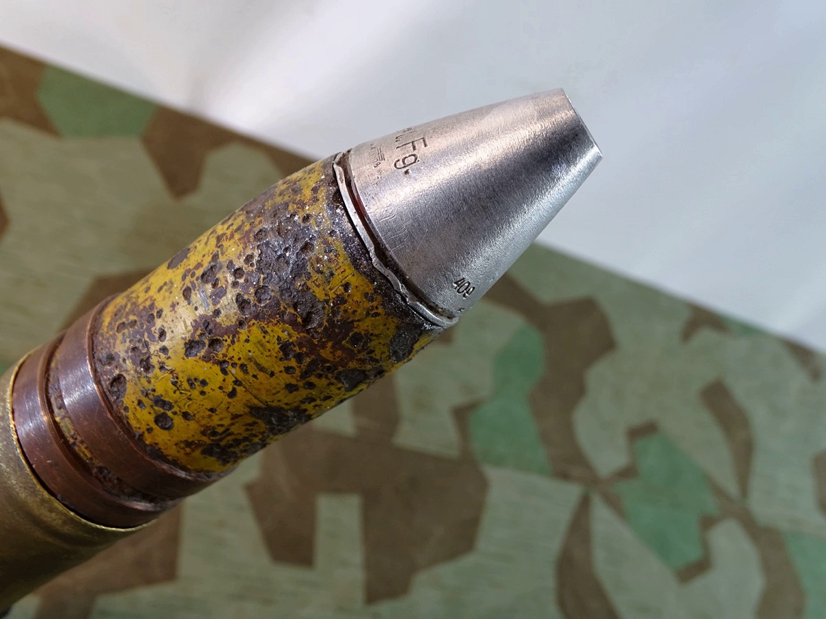 Geschoss genau passend zu Hülse mit 2 dicken, frühen Kupfer Führungsringen. Im Geschoss noch die Alu Einfassung der Sprengstoffladung erhalten.  Beide Gewinde gut erhalten, sauber und gängig. Geschoss etwas narbig aber noch ca. 50 % der Originalfarbe erhalten. Für Geschoss Unterseite die einschraubbare Leuchtspurhülse mit dabei, ungereinigt. Wenn man sie reinigt findet man vielleicht auch noch Stempel.