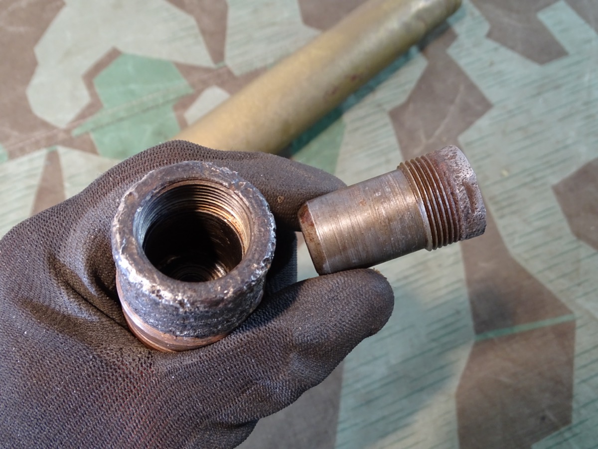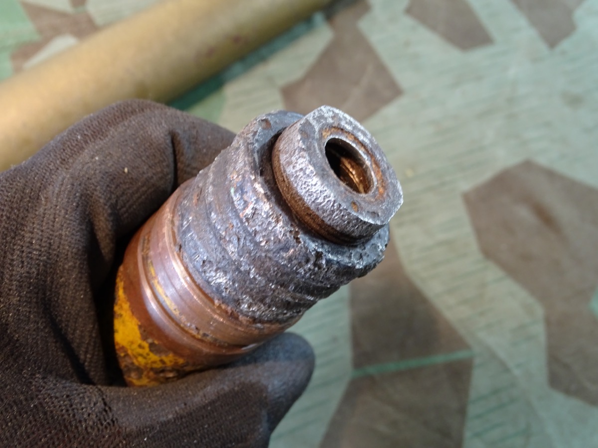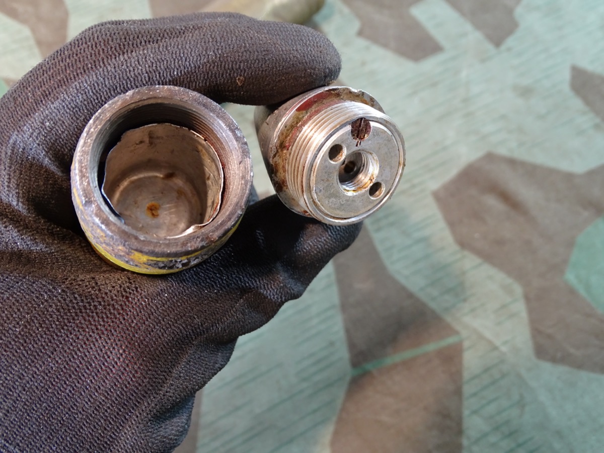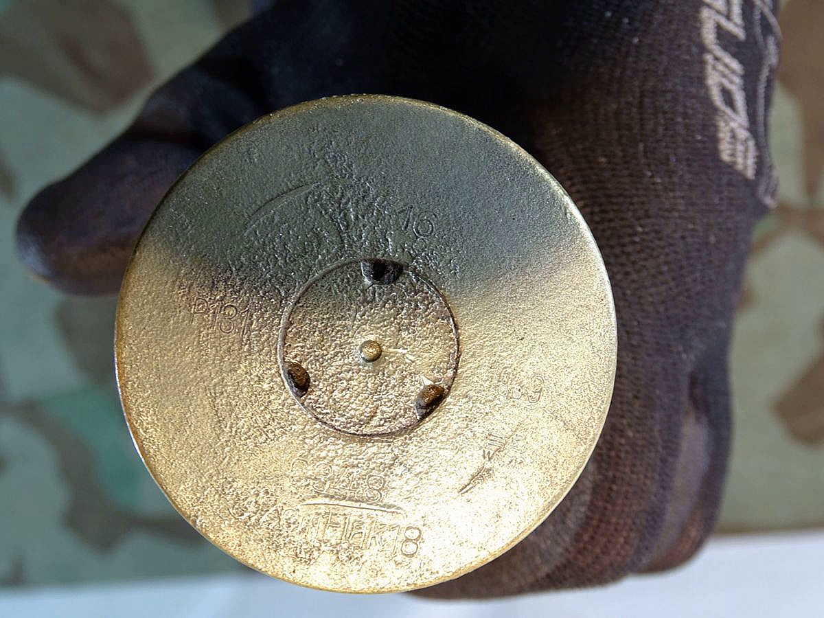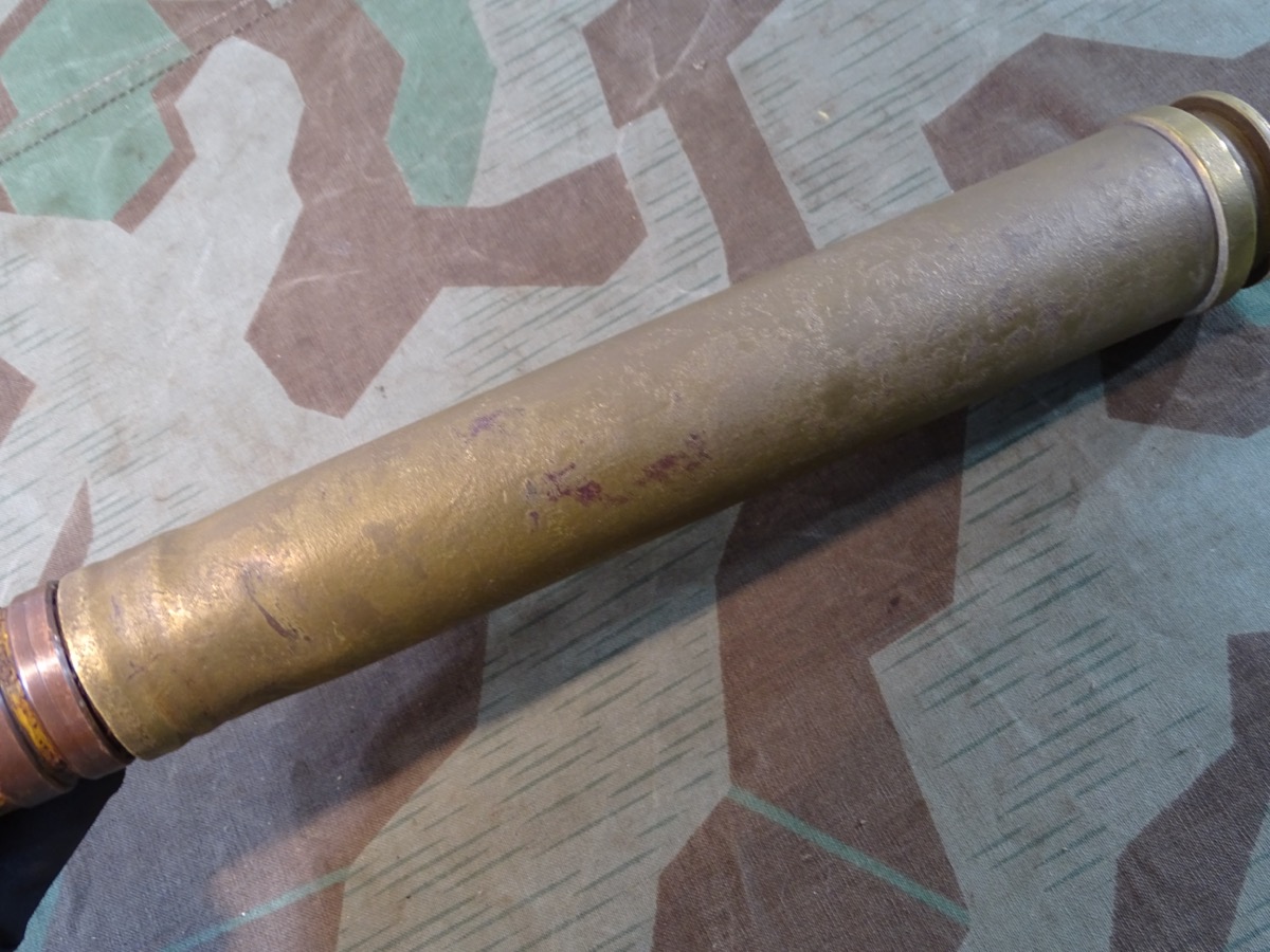 Geschoss genau passend zu Hülse mit 2 dicken, frühen Kupfer Führungsringen. Im Geschoss noch die Alu Einfassung der Sprengstoffladung erhalten.  Beide Gewinde gut erhalten, sauber und gängig. Geschoss etwas narbig aber noch ca. 50 % der Originalfarbe erhalten. Für Geschoss Unterseite die einschraubbare Leuchtspurhülse mit dabei, ungereinigt. Wenn man sie reinigt findet man vielleicht auch noch Stempel.