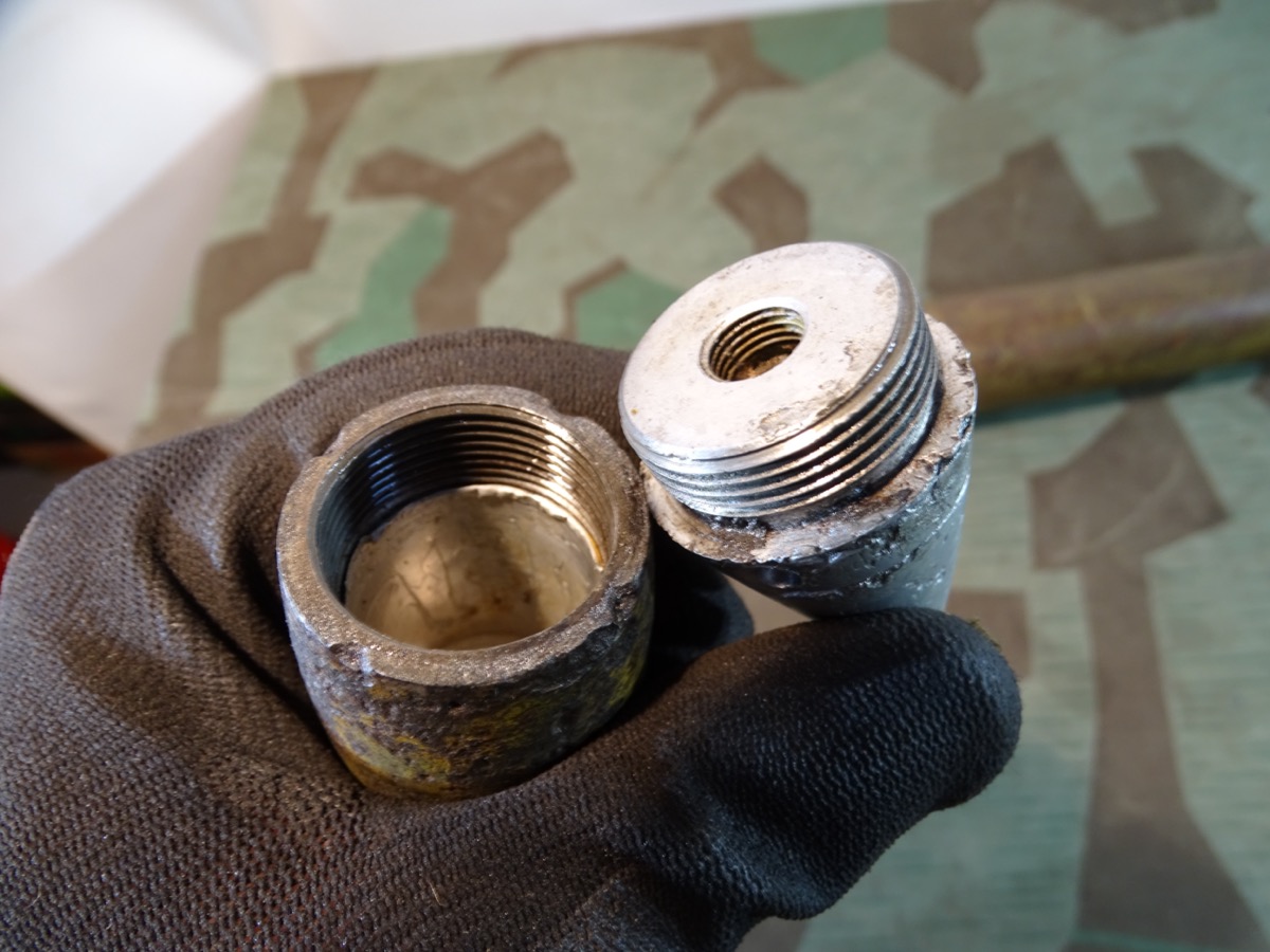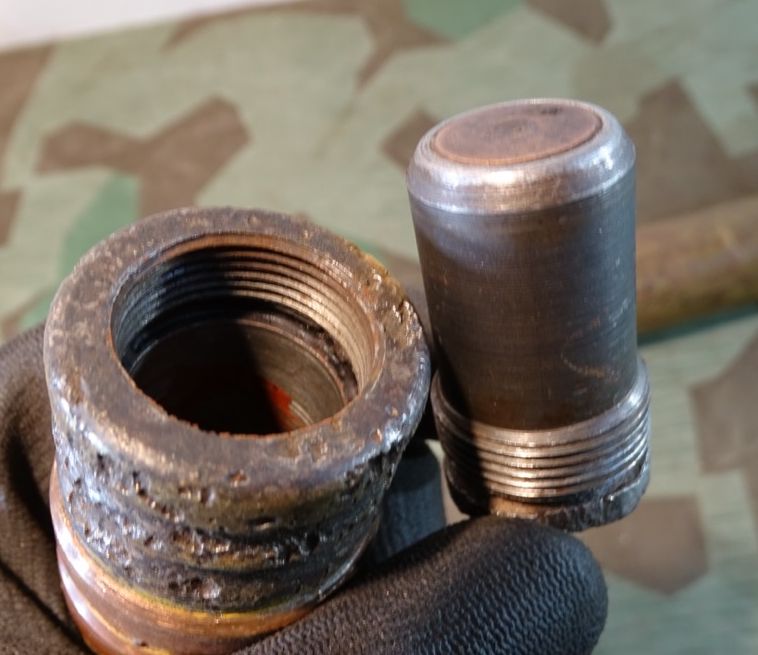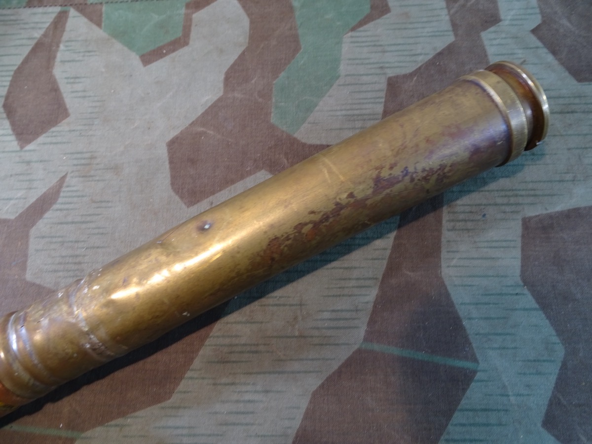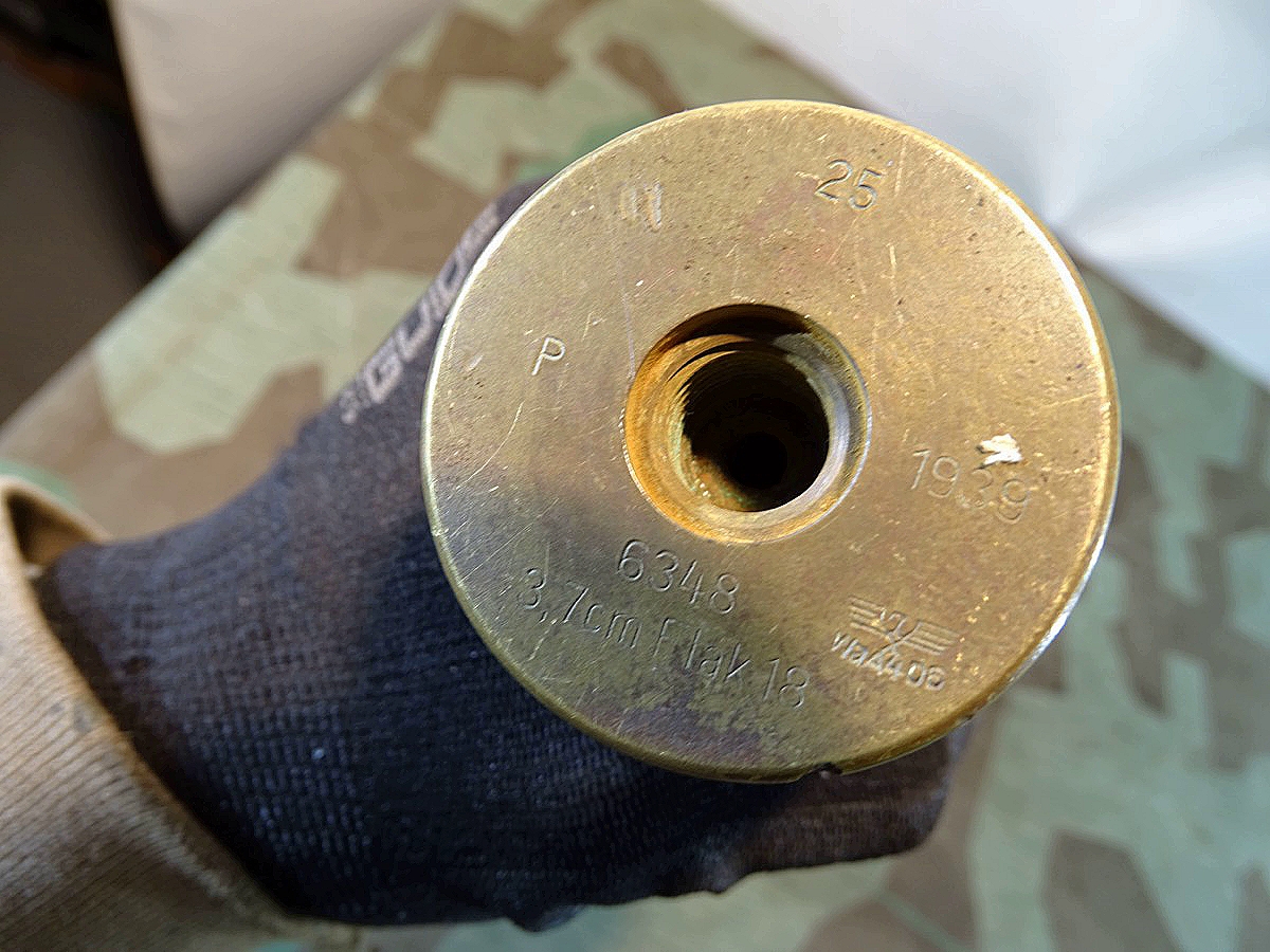 Komplett zusammengehöriges Stück, alles frühe Bauteile um 1938/39. Frühe Messinghülse. Hülse angelaufen, oberer Rand etwas geweitet von Deaktivierung. Seitlich mit mehreren Beulen und einem Splittertreffer. Bodenstempel noch schön und gut leserlich erhalten: 3,7 cm Flak 18, Herstellercode P 25 mit WaA Adler und Jahreszahl 1939.