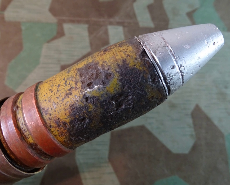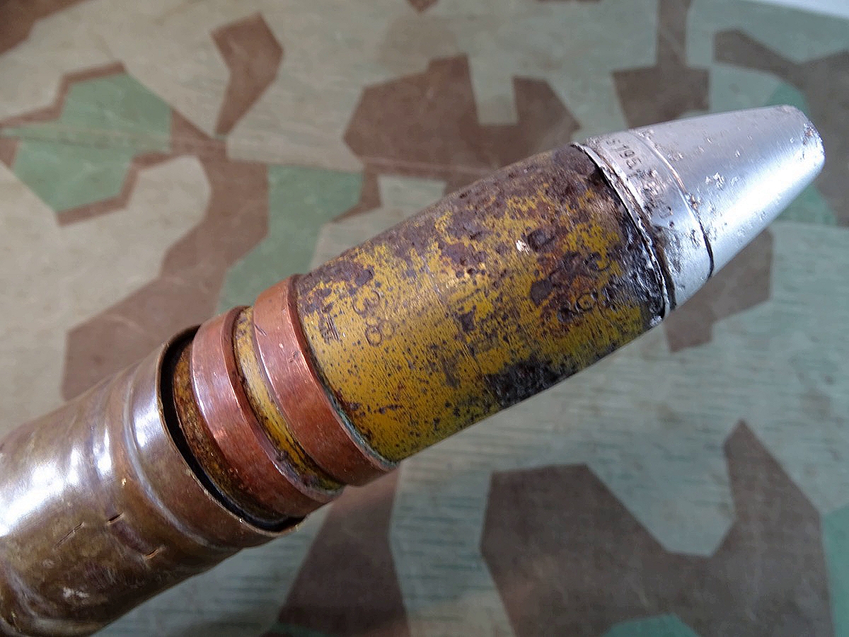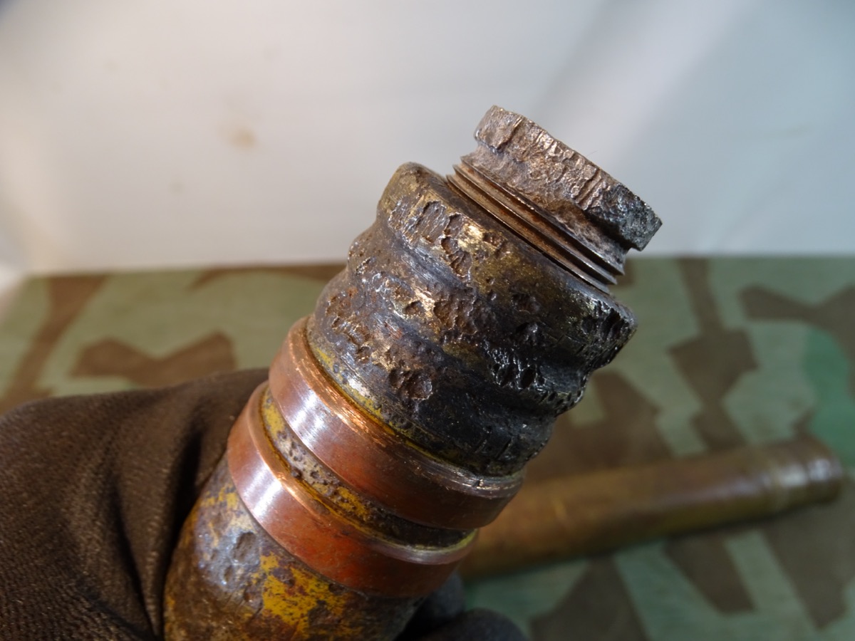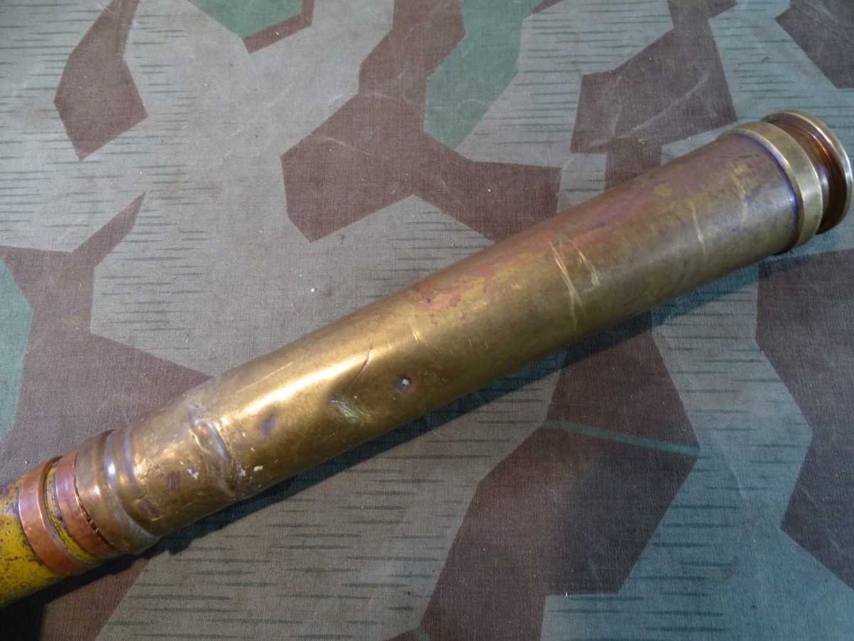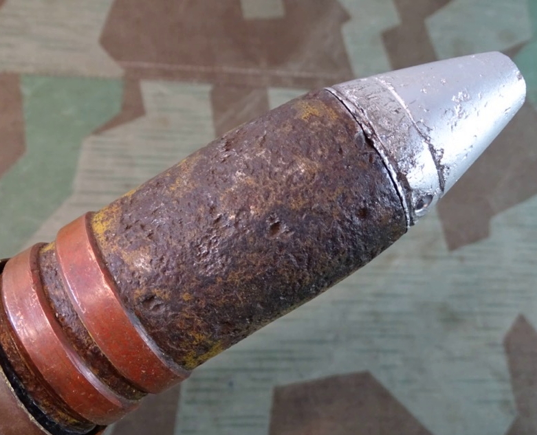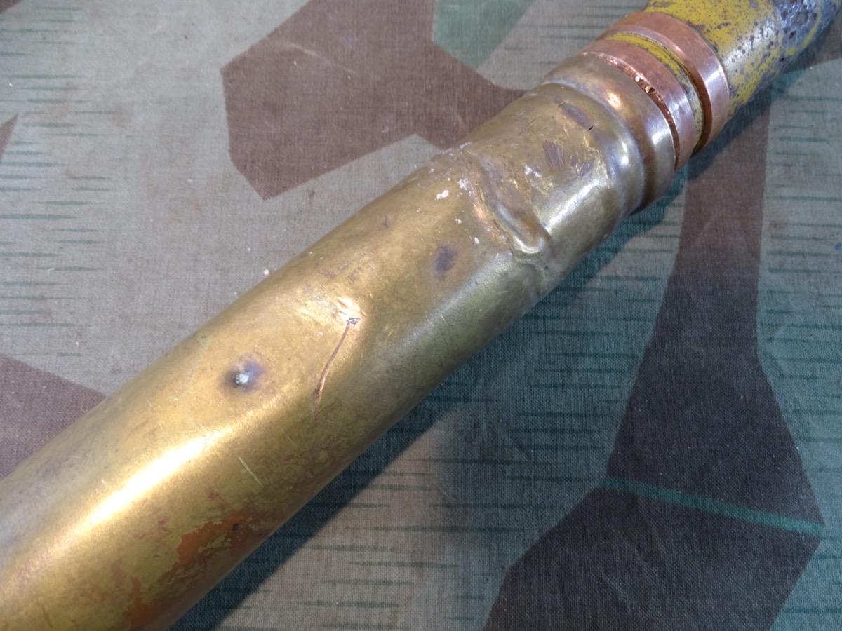 Geschoss genau passend zu Hülse mit 2 dicken frühen Kupfer Führungsringen. Gewinde gut erhalten, sauber und gängig. Geschoss gereinigt, narbig aber noch ca. 50 % der Originalfarbe erhalten. Für Geschoss Unterseite die einschraubbare Leuchtspurhülse mit dabei, ungereinigt. Früher Aluzünder. Beschriftung des Zünders außen noch praktisch komplett lesbar. Der Zünder wurde mal dünn silbern überlackiert, wahrscheinlich als Korrosionsschutz oder bei einer Restaurierung. Die Patrone ist Komplett leer, ohne brennbare oder explosive Stoffe. Bei Bestellung bitte Altersnachweis senden oder mailen ( Kopie vom Personalausweis)