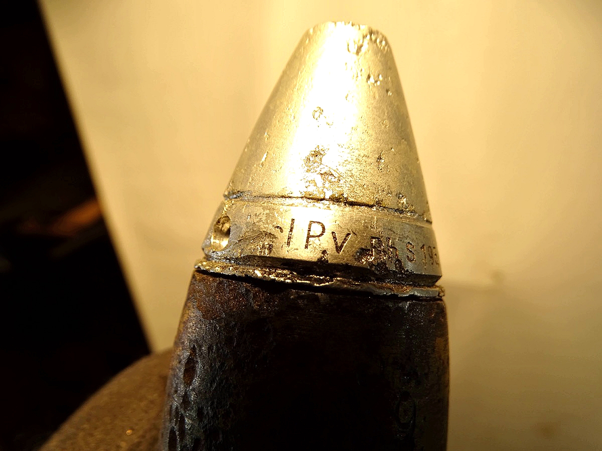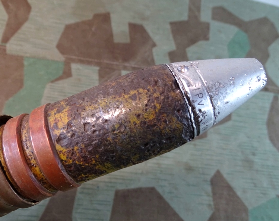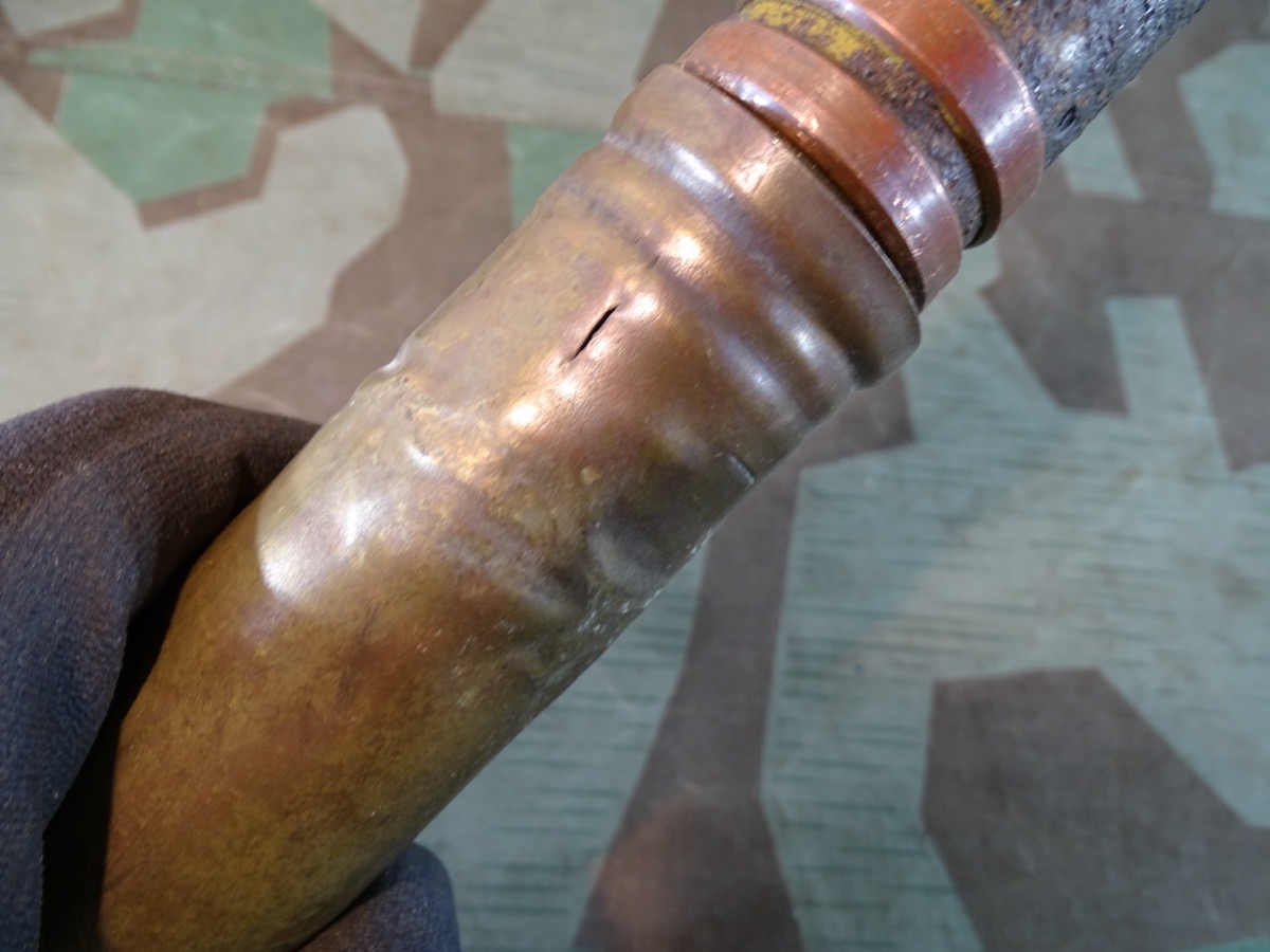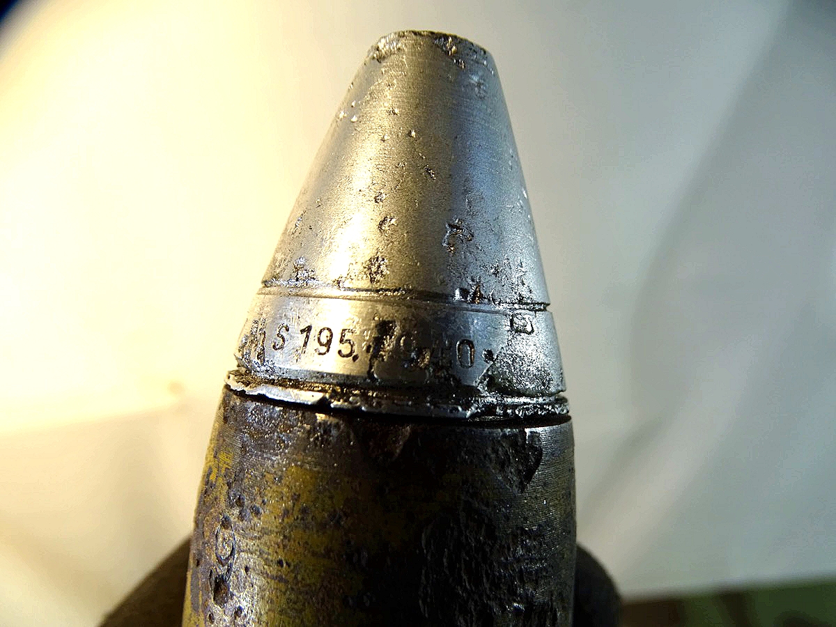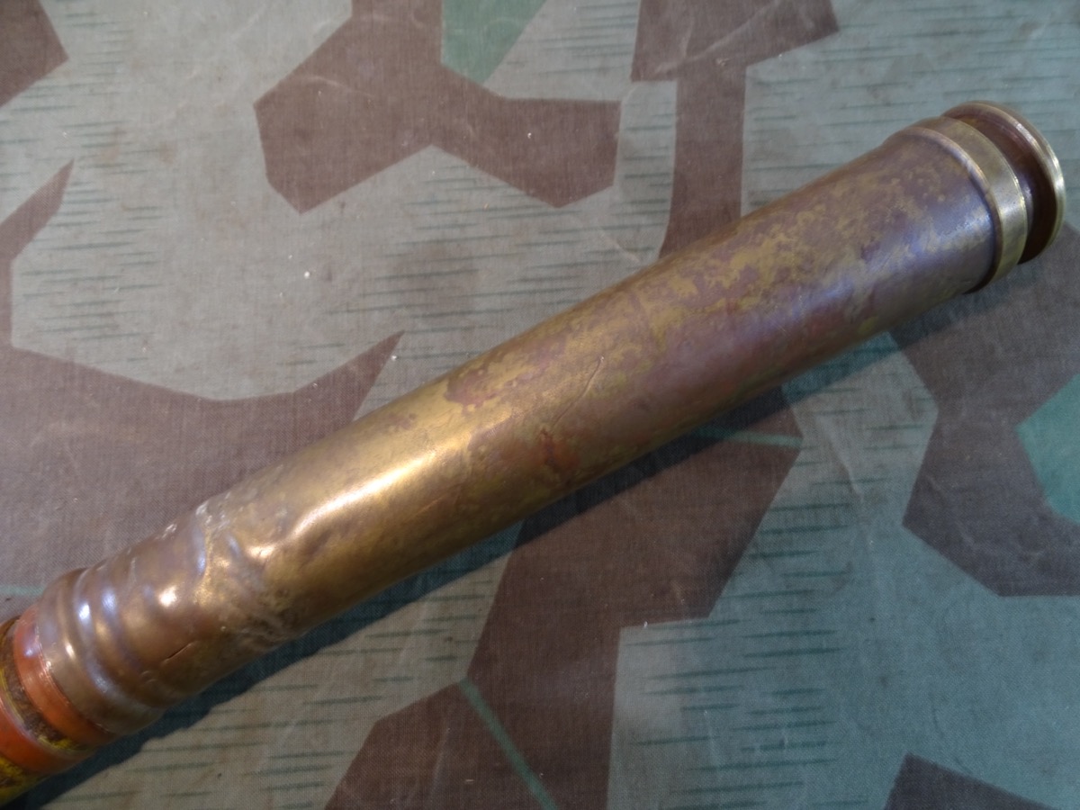 Geschoss genau passend zu Hülse mit 2 dicken frühen Kupfer Führungsringen. Gewinde gut erhalten, sauber und gängig. Geschoss gereinigt, narbig aber noch ca. 50 % der Originalfarbe erhalten. Für Geschoss Unterseite die einschraubbare Leuchtspurhülse mit dabei, ungereinigt. Früher Aluzünder. Beschriftung des Zünders außen noch praktisch komplett lesbar. Der Zünder wurde mal dünn silbern überlackiert, wahrscheinlich als Korrosionsschutz oder bei einer Restaurierung. Die Patrone ist Komplett leer, ohne brennbare oder explosive Stoffe. Bei Bestellung bitte Altersnachweis senden oder mailen ( Kopie vom Personalausweis)