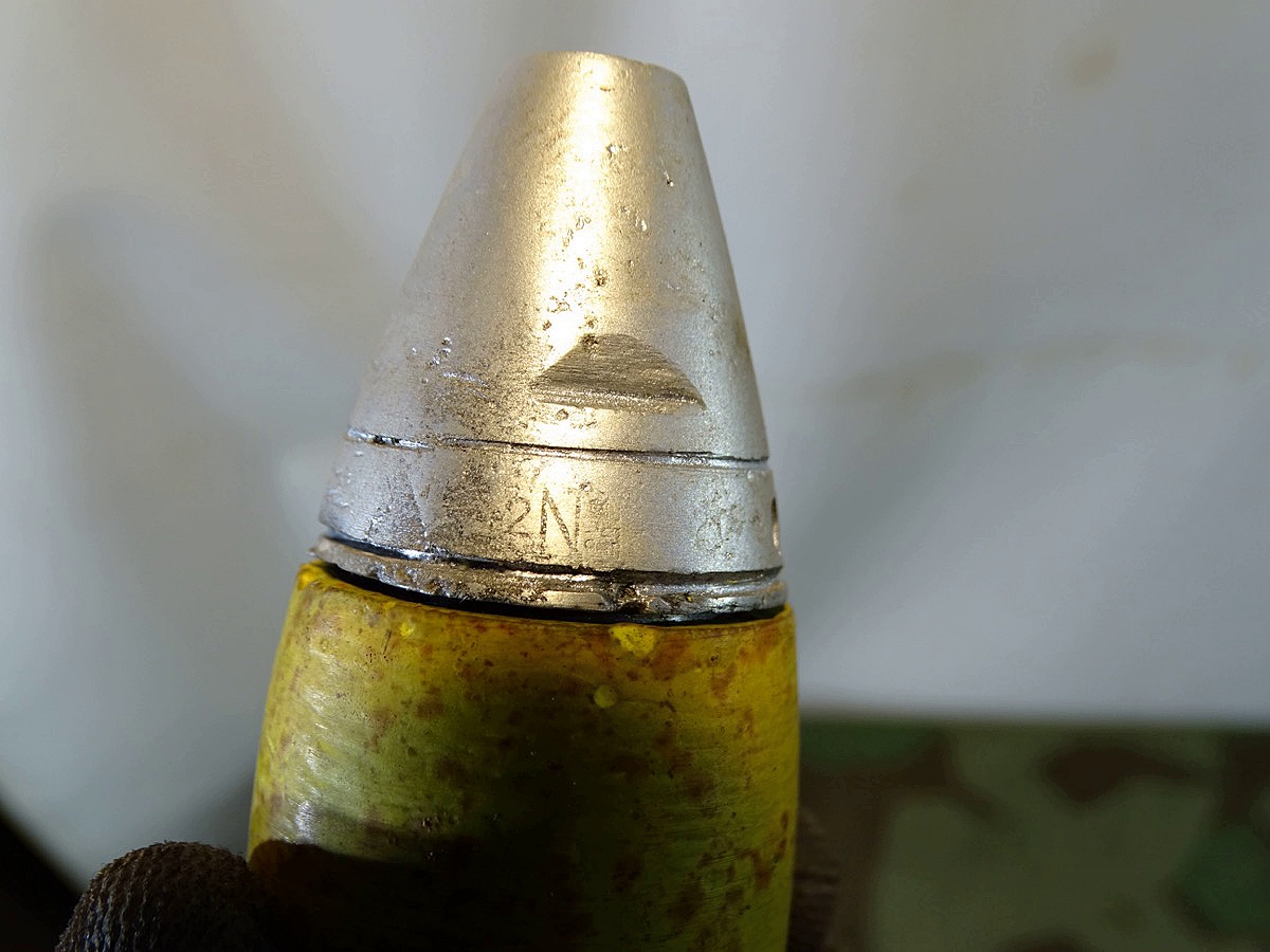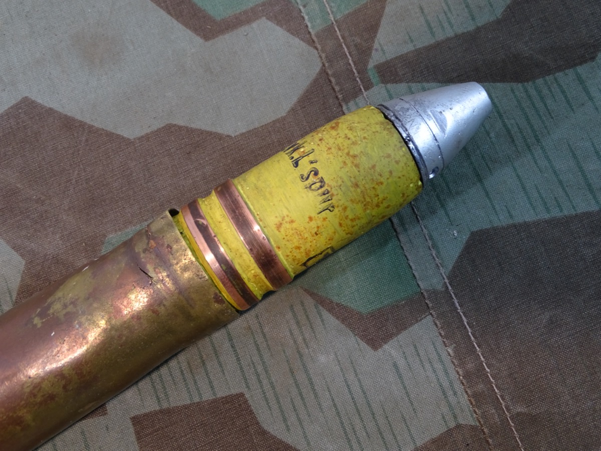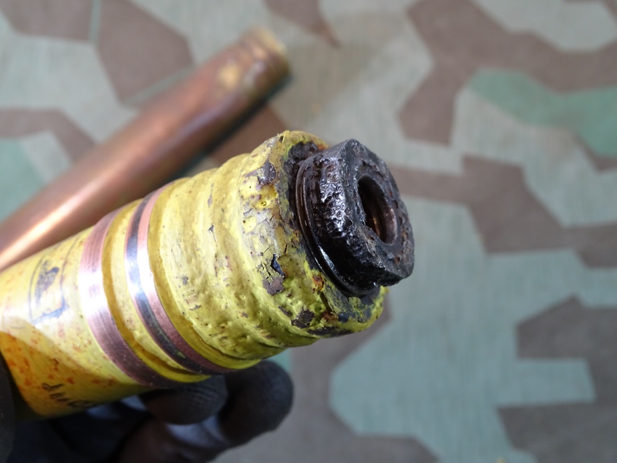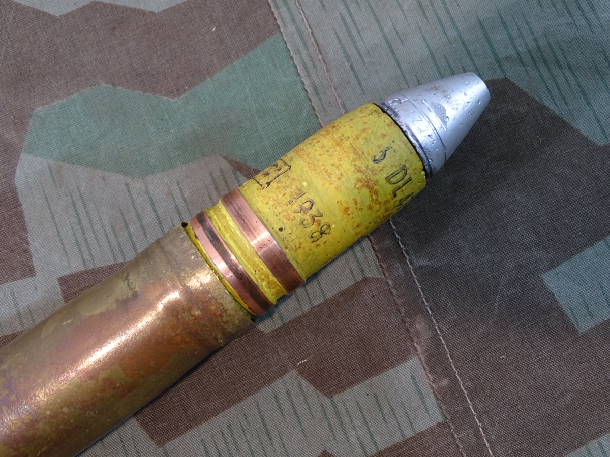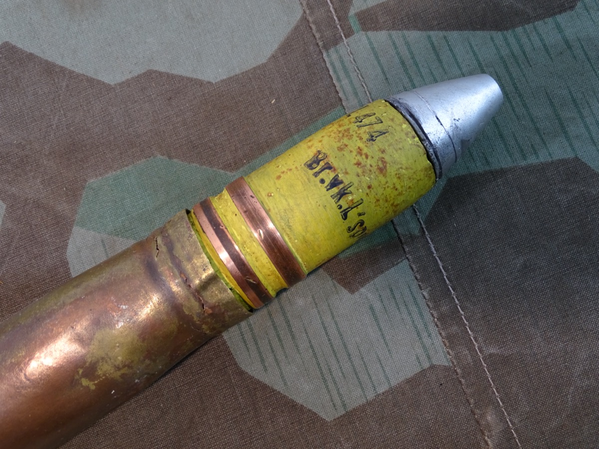 No shipping to foreign countries, Kein Versand ins Ausland. Gut erhaltene frühe Messinghülse Hülse, etwas angelaufen, oberer Rand etwas geweitet von Deaktivierung, seitlich mit einer kleineren Beule. Bodenstempel mit frühem WaA Stempel . Auch die Zündschraube ist noch erhalten. Abgeschlagen- wie es sein muss. Geschoss genau passend zu Hülse mit 2 dicken, frühen Kupfer Führungsringen. Beide Gewinde gut erhalten, sauber und gängig. Stammt aus der Auflösung eines Museum in den Ardennen. Geschoss von den Museumsrestauratoren professionell und farblich stimmig restauriert / neu lackiert und gealtert. Schön gemacht. Für Geschoss Unterseite die einschraubbare Leuchtspurhülse mit dabei, ungereinigt. Wenn man sie reinigt findet man vielleicht auch noch Stempel.