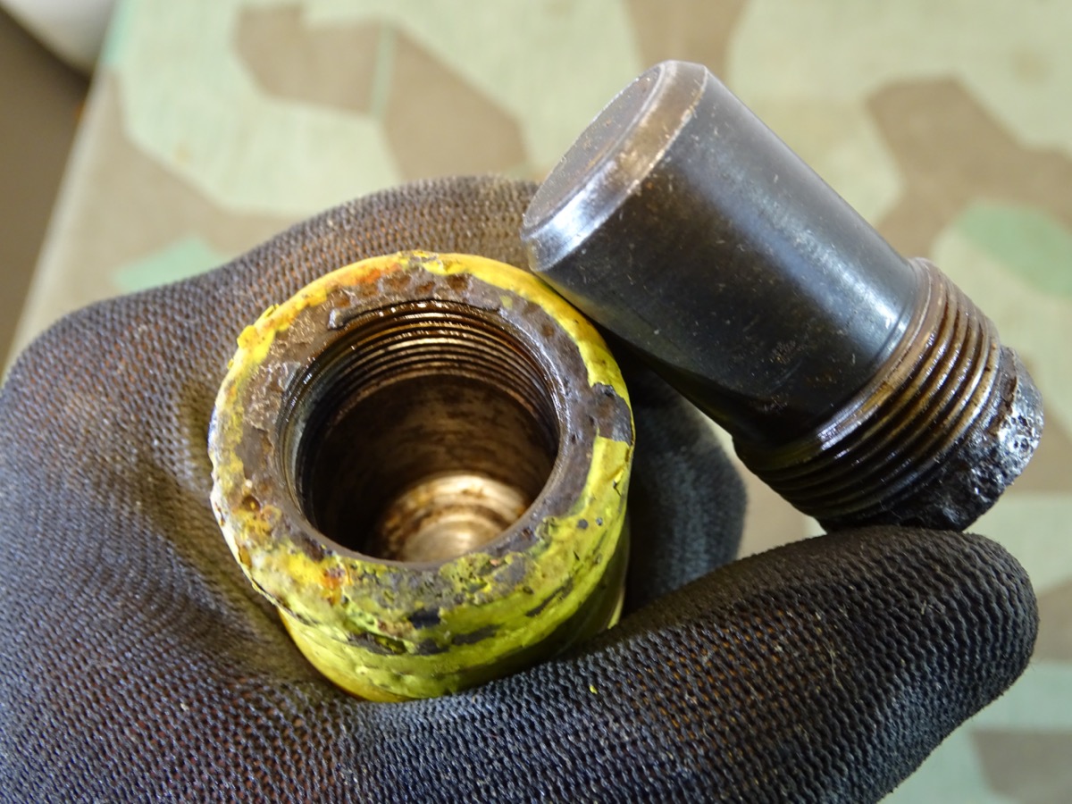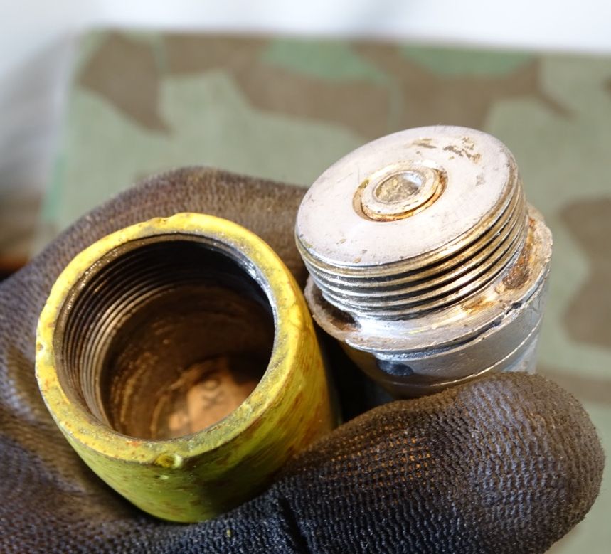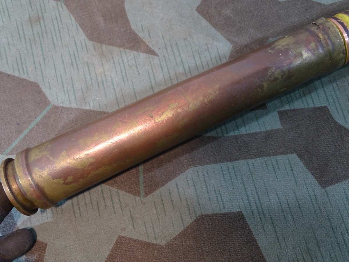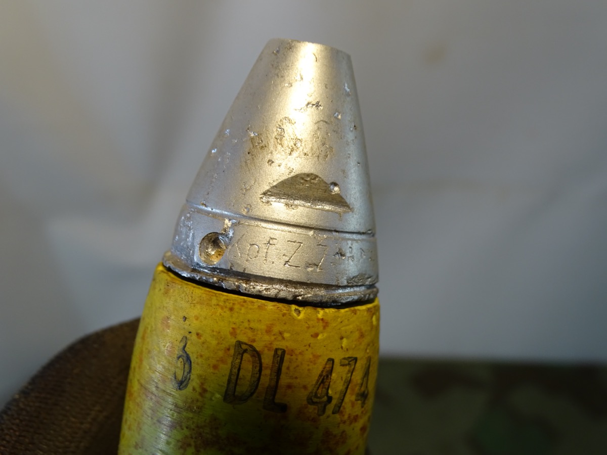 Aluzünder. Beschriftung des Zünders außen teils lesbar. Der Zünder wurde mal dünn silbern überlackiert, wahrscheinlich als Korrosionsschutz bei der Restaurierung. Die Patrone ist Komplett leer, ohne brennbare oder explosive Stoffe. Bei Bestellung bitte Altersnachweis senden oder mailen ( Kopie vom Personalausweis)
