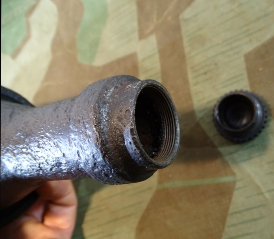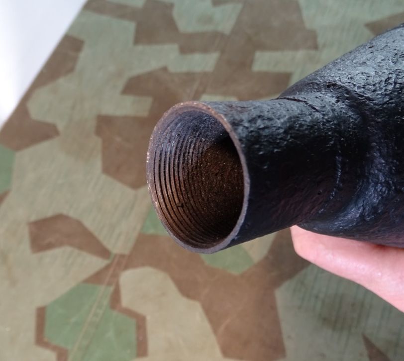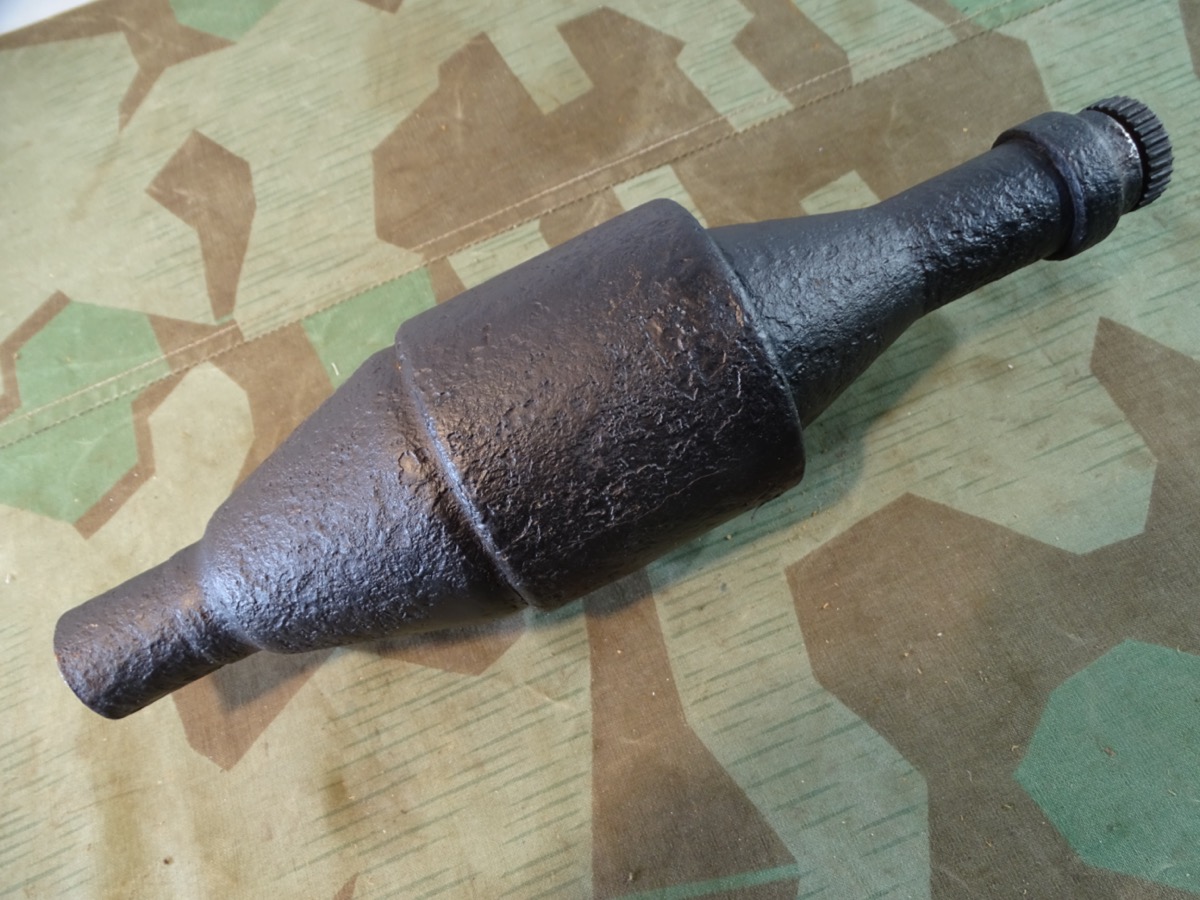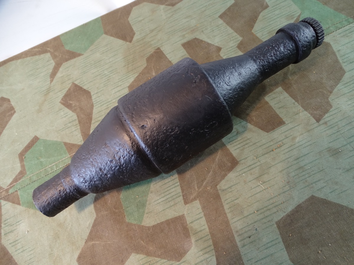 Gefechtskopf, innen leer. Vom Vorbesitzer gereinigt und schwarz lackiert. Als Zünder passt auch der von der Gewehrgranate.( Beispiel dafür - unser Artikel 18949) Generell sehr gute Substanz zur weiteren Restaurierung. Gewinde sehen noch gut aus. Sogar der dünne Kopf hat nur ein paar sehr kleine Löcher auf den Kanten.
