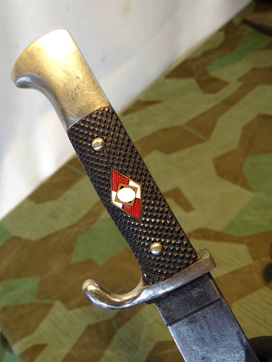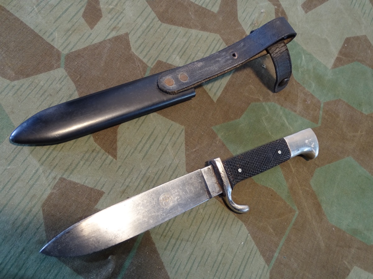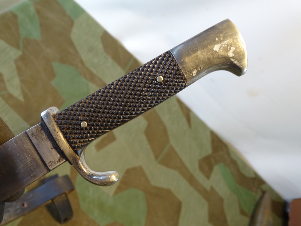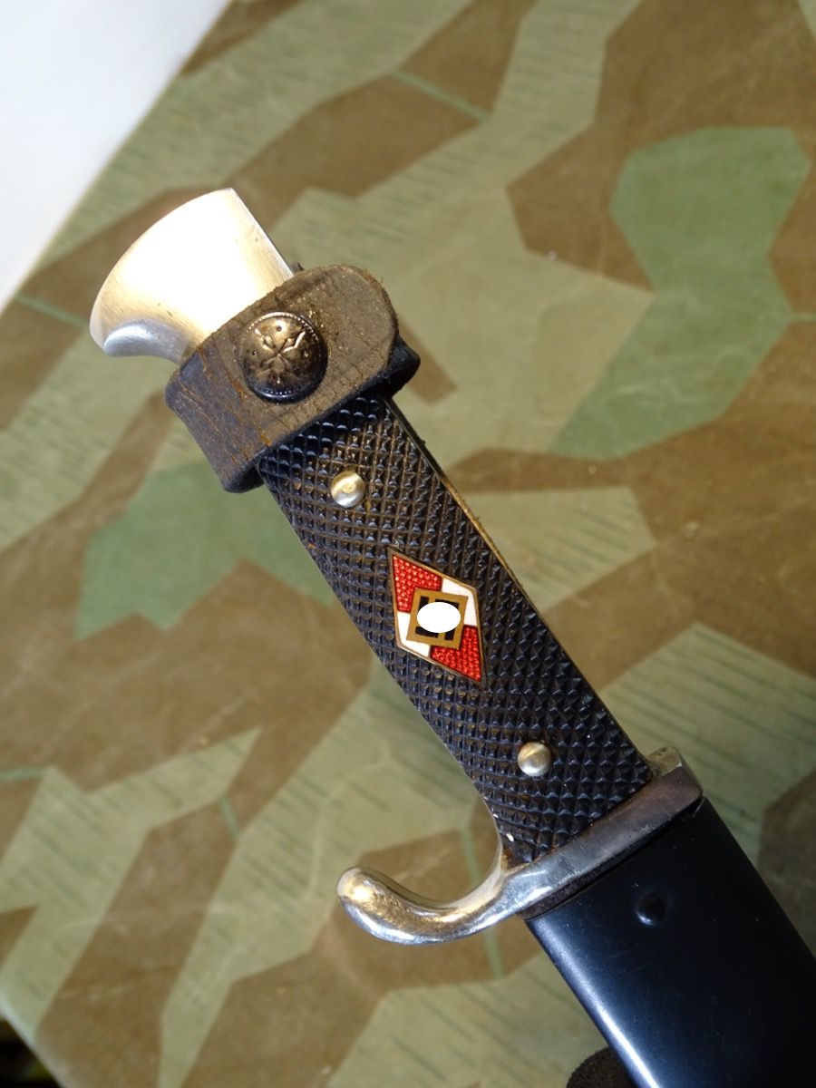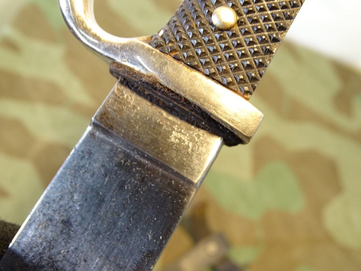 Gut erhaltenes Stück. Aus der mittleren Vorkriegs Fertigungsperiode ( 1936-38) . Tief geätzter Hersteller Stempel RZM M 7/51 mit Jahr 1936. Stoßleder noch gut erhalten. Klinge ist großtenteils blank und glatt, normale Nutzungsspuren. Noch die Devise Blut und Ehre lesbar erhalten. Gut erhaltene Griffschalen aus Bakelit mit Fischgrätenmuster in Tiefschwarz, sauber vernietet. Auf der vorderen Seite befindet sich, in der Mitte der Griffschale, das emaillierte Hitler-Jugend-Abzeichen. Es ist - wie es sein soll- leicht beweglich. HK vollständig erhalten. Einseitig gebogene Parierstange bzw. Knebel. Knauf mit ein paar narben, diese wohl vom Träger/ Vorbesitzer sauber gereinigt und mit silbernem Lack gefüllt. Die Klinge ist einschneidig, Die Scheide ist aus magnetischem, schwarz lackiertem Eisen. Lack noch praktisch komplett vorhanden. Sieht originallackiert aus, glatt, sauber, leicht glänzend. Vieleicht mal im Laufe der Nutzungszeit professionell nachlackiert worden. Die Tragevorrichtung besteht aus einer Lederschlaufe, mit einem doppelt gelegten Riemen. Verschlussriemen . Druckknopf klappt. Bei Bestellung bitte Altersnachweis senden oder mailen ( Kopie vom Personalausweis).-nicht faxen