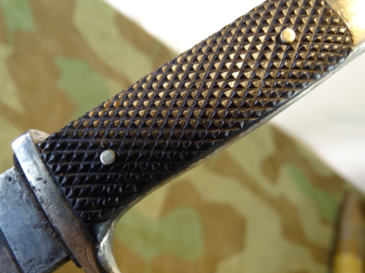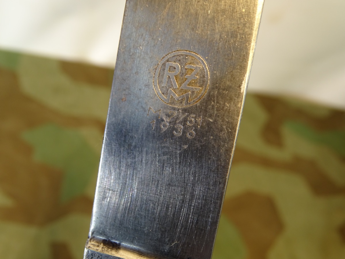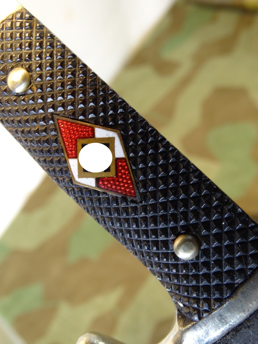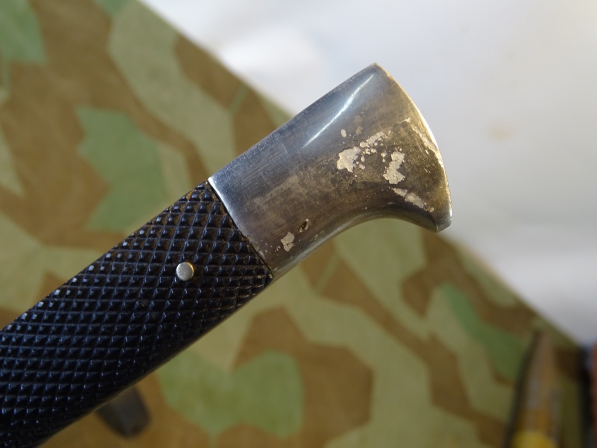 Gut erhaltenes Stück. Aus der mittleren Vorkriegs Fertigungsperiode ( 1936-38) . Tief geätzter Hersteller Stempel RZM M 7/51 mit Jahr 1936. Stoßleder noch gut erhalten. Klinge ist großtenteils blank und glatt, normale Nutzungsspuren. Noch die Devise Blut und Ehre lesbar erhalten. Gut erhaltene Griffschalen aus Bakelit mit Fischgrätenmuster in Tiefschwarz, sauber vernietet. Auf der vorderen Seite befindet sich, in der Mitte der Griffschale, das emaillierte Hitler-Jugend-Abzeichen. Es ist - wie es sein soll- leicht beweglich. HK vollständig erhalten. Einseitig gebogene Parierstange bzw. Knebel. Knauf mit ein paar narben, diese wohl vom Träger/ Vorbesitzer sauber gereinigt und mit silbernem Lack gefüllt. Die Klinge ist einschneidig, Die Scheide ist aus magnetischem, schwarz lackiertem Eisen. Lack noch praktisch komplett vorhanden. Sieht originallackiert aus, glatt, sauber, leicht glänzend. Vieleicht mal im Laufe der Nutzungszeit professionell nachlackiert worden. Die Tragevorrichtung besteht aus einer Lederschlaufe, mit einem doppelt gelegten Riemen. Verschlussriemen . Druckknopf klappt. Bei Bestellung bitte Altersnachweis senden oder mailen ( Kopie vom Personalausweis).-nicht faxen