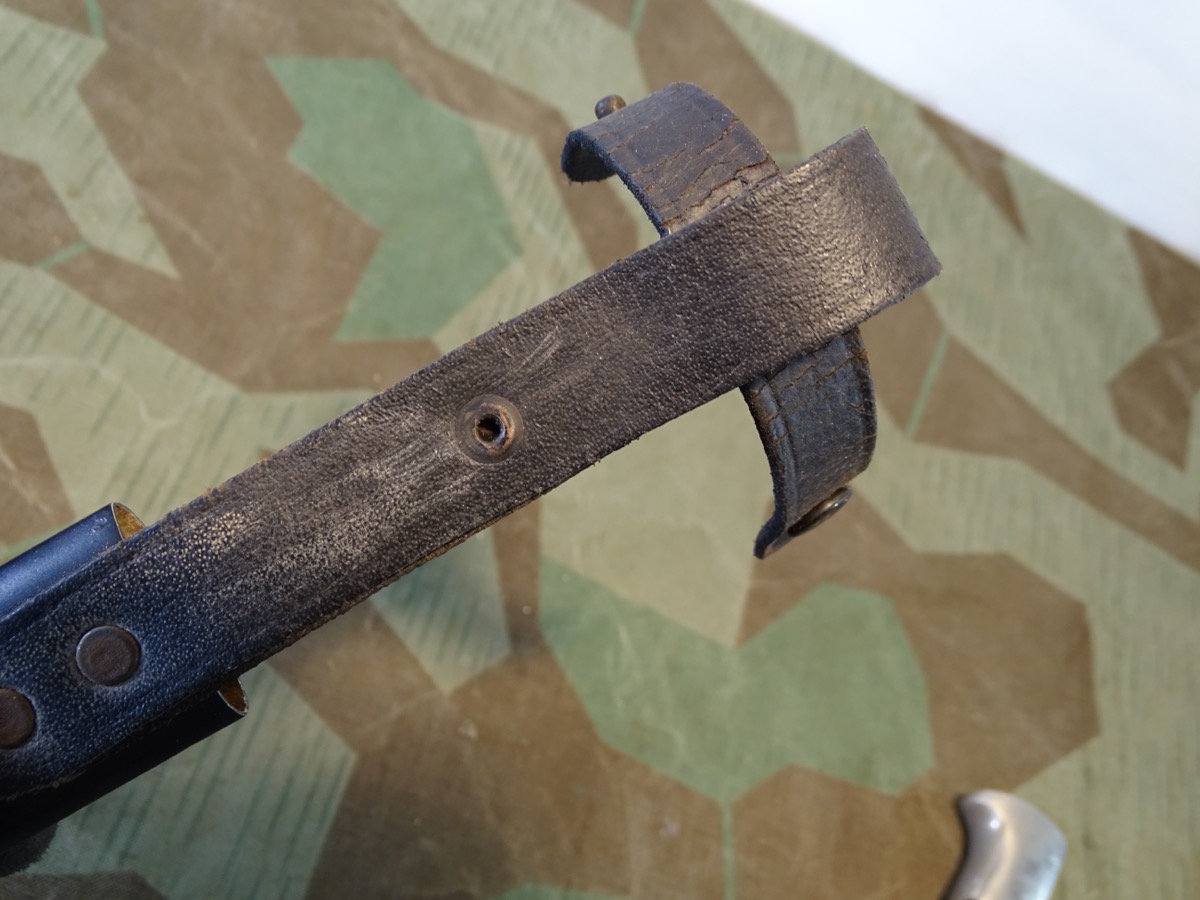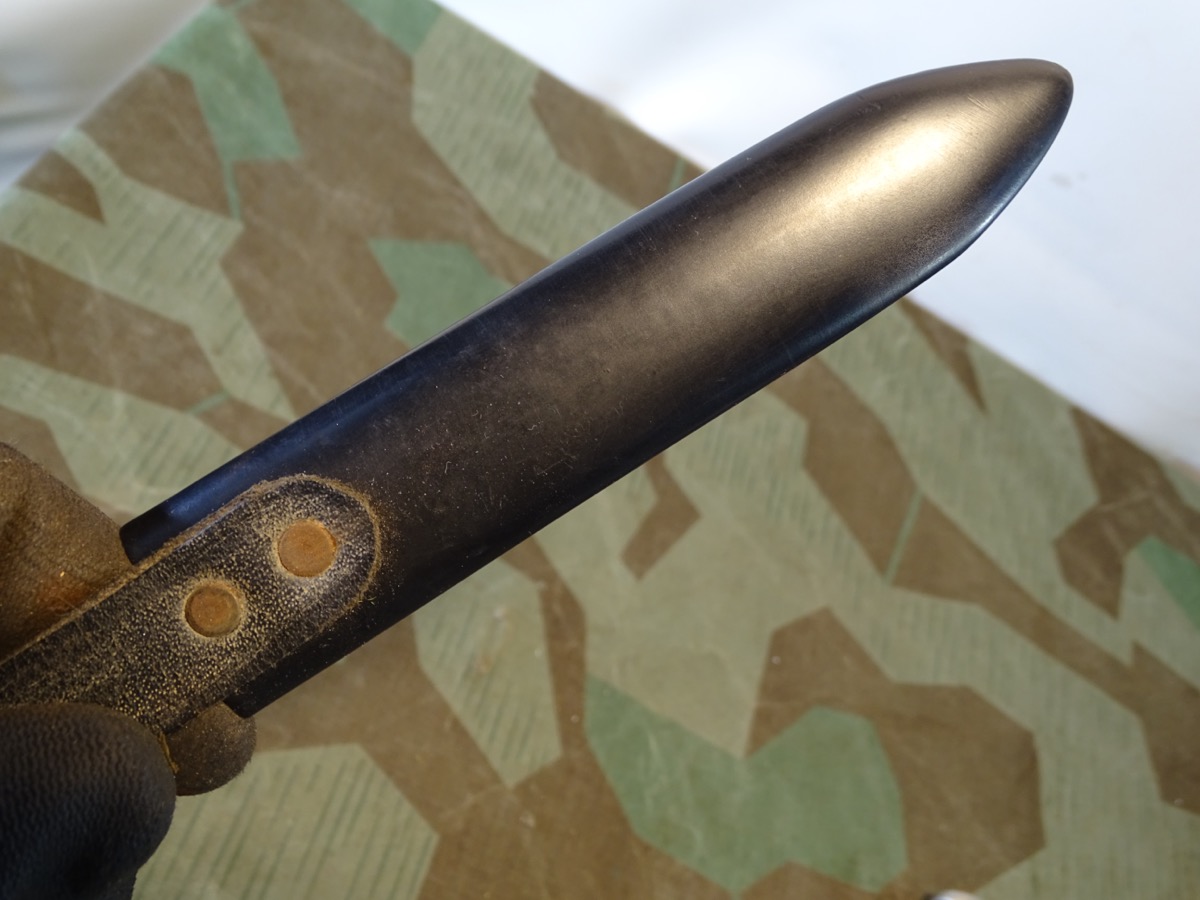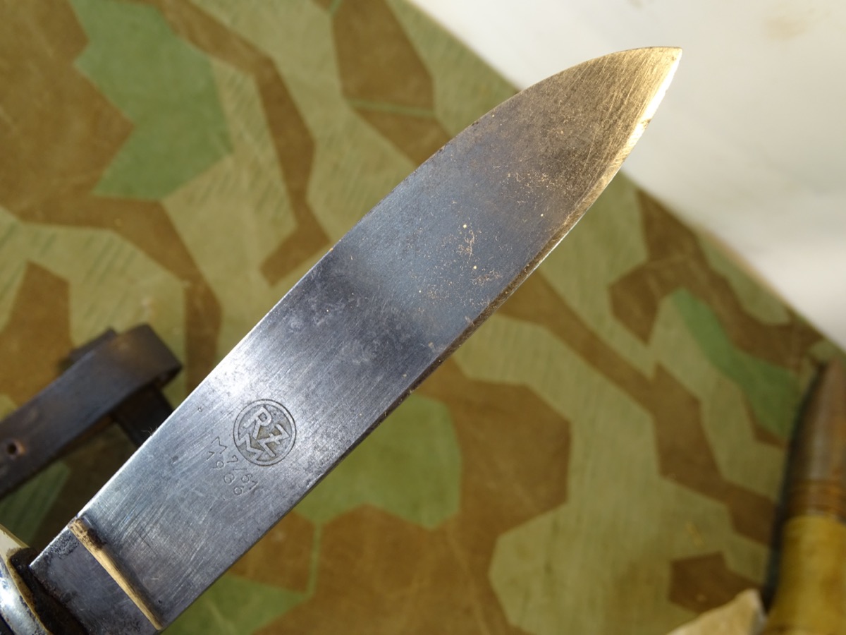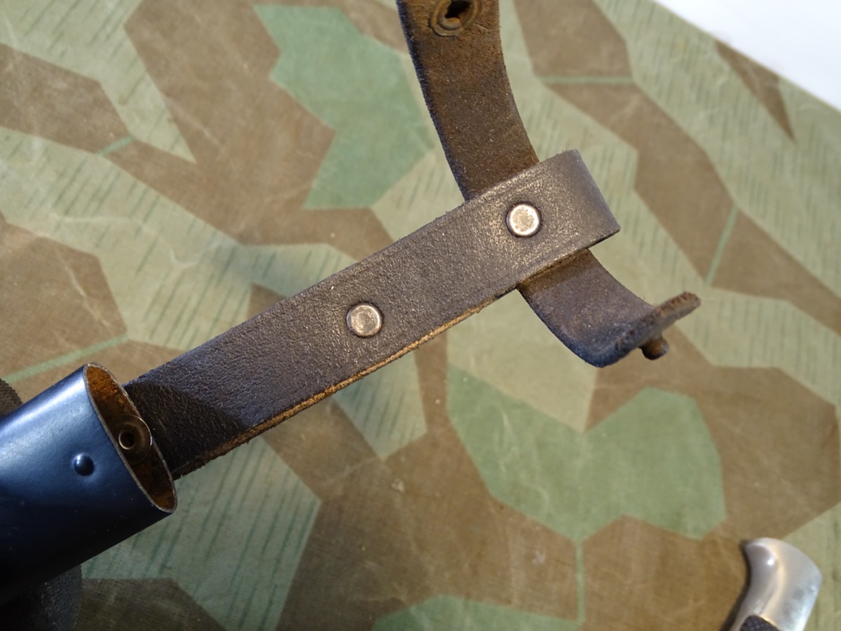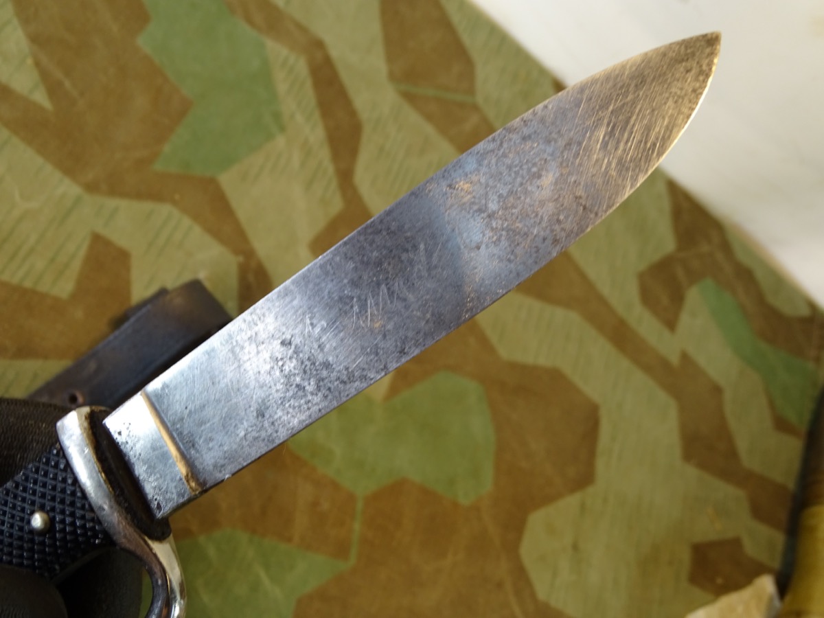 Gut erhaltenes Stück. Aus der mittleren Vorkriegs Fertigungsperiode ( 1936-38) . Tief geätzter Hersteller Stempel RZM M 7/51 mit Jahr 1936. Stoßleder noch gut erhalten. Klinge ist großtenteils blank und glatt, normale Nutzungsspuren. Noch die Devise Blut und Ehre lesbar erhalten. Gut erhaltene Griffschalen aus Bakelit mit Fischgrätenmuster in Tiefschwarz, sauber vernietet. Auf der vorderen Seite befindet sich, in der Mitte der Griffschale, das emaillierte Hitler-Jugend-Abzeichen. Es ist - wie es sein soll- leicht beweglich. HK vollständig erhalten. Einseitig gebogene Parierstange bzw. Knebel. Knauf mit ein paar narben, diese wohl vom Träger/ Vorbesitzer sauber gereinigt und mit silbernem Lack gefüllt. Die Klinge ist einschneidig, Die Scheide ist aus magnetischem, schwarz lackiertem Eisen. Lack noch praktisch komplett vorhanden. Sieht originallackiert aus, glatt, sauber, leicht glänzend. Vieleicht mal im Laufe der Nutzungszeit professionell nachlackiert worden. Die Tragevorrichtung besteht aus einer Lederschlaufe, mit einem doppelt gelegten Riemen. Verschlussriemen . Druckknopf klappt. Bei Bestellung bitte Altersnachweis senden oder mailen ( Kopie vom Personalausweis).-nicht faxen