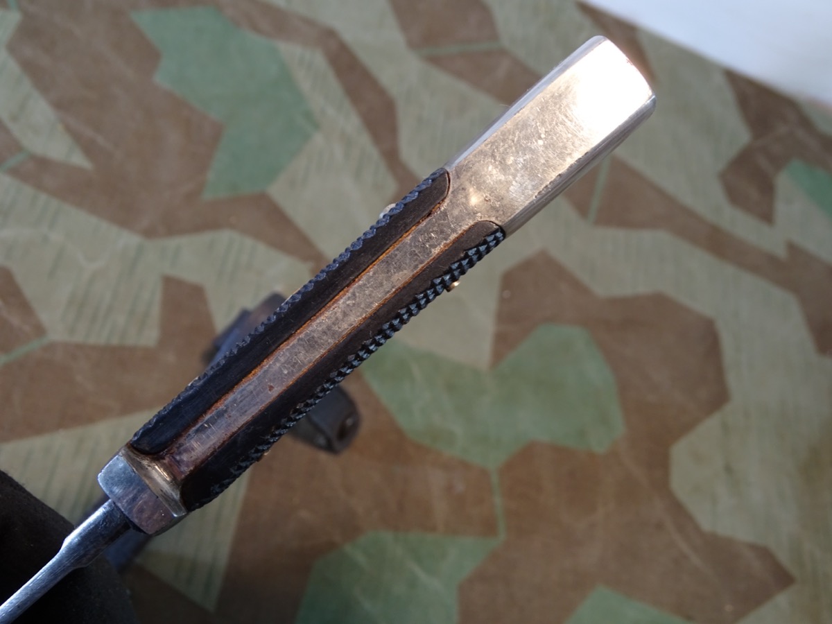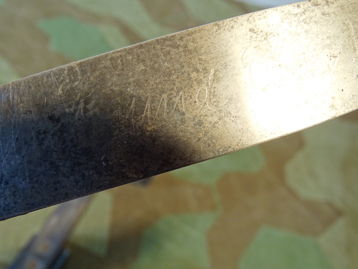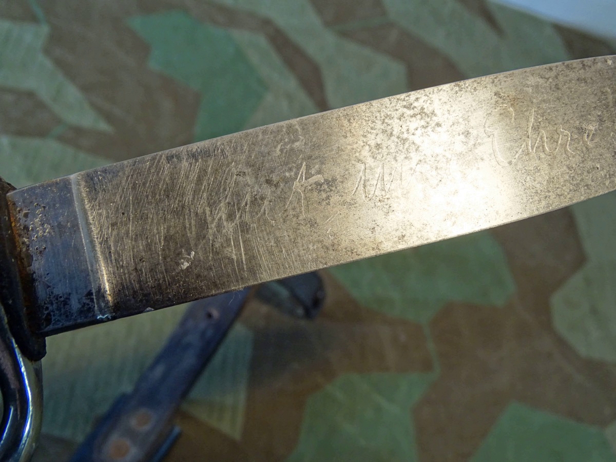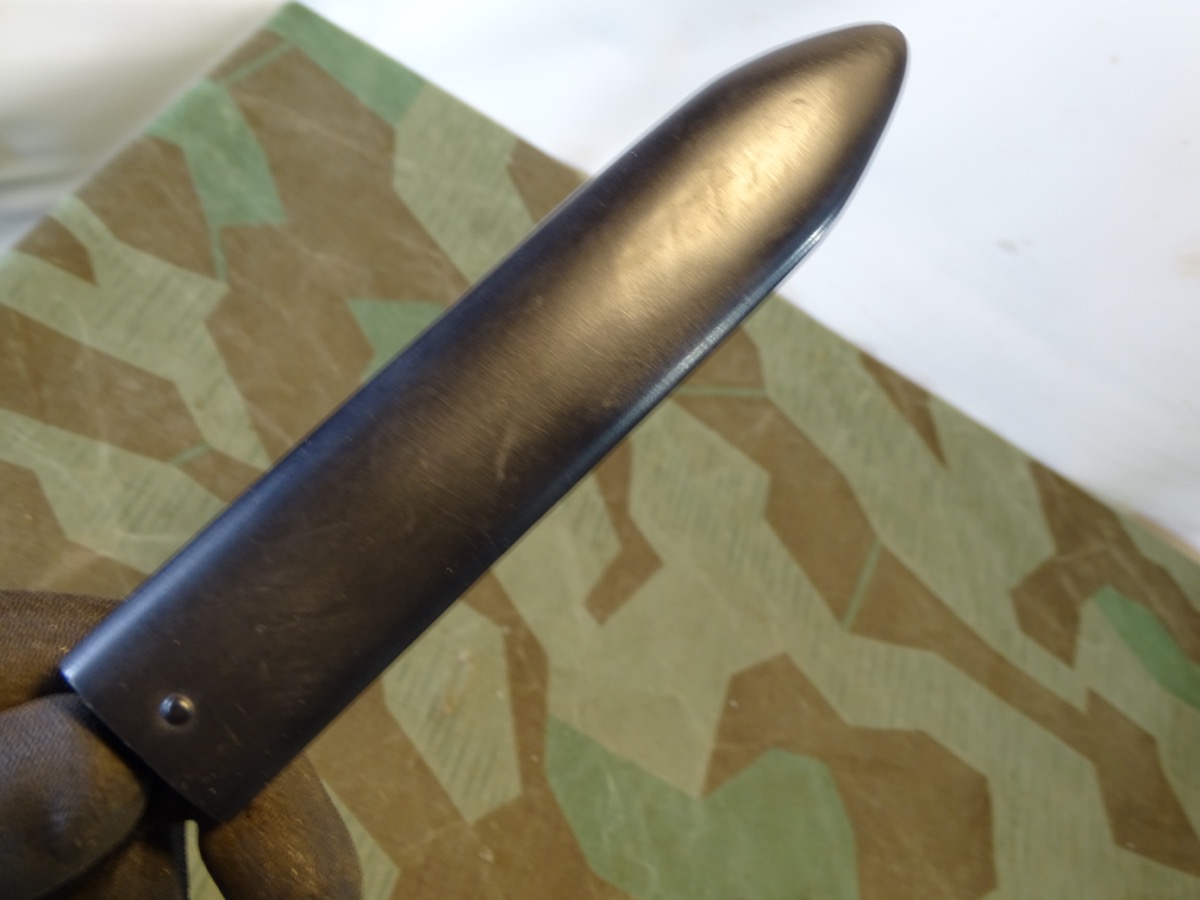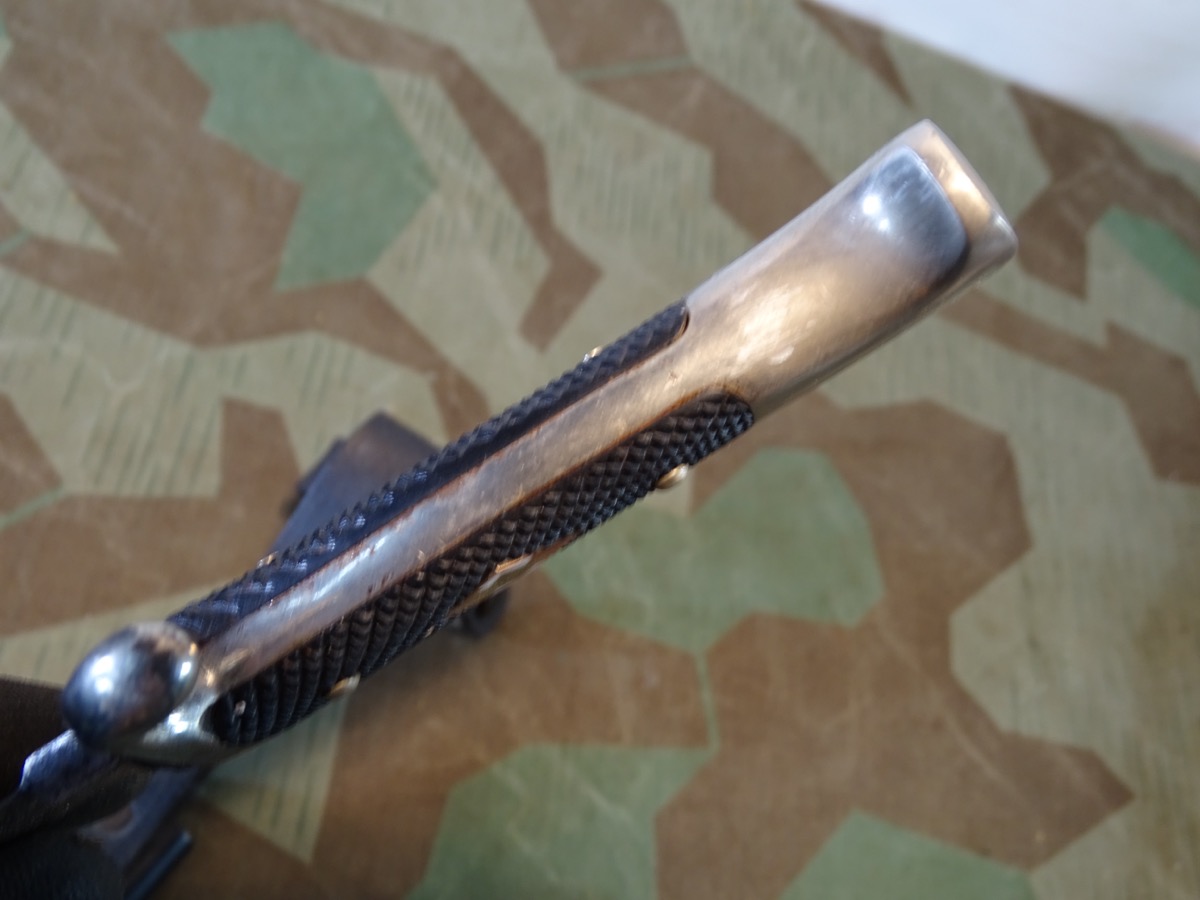 Gut erhaltenes Stück. Aus der mittleren Vorkriegs Fertigungsperiode ( 1936-38) . Tief geätzter Hersteller Stempel RZM M 7/51 mit Jahr 1936. Stoßleder noch gut erhalten. Klinge ist großtenteils blank und glatt, normale Nutzungsspuren. Noch die Devise Blut und Ehre lesbar erhalten. Gut erhaltene Griffschalen aus Bakelit mit Fischgrätenmuster in Tiefschwarz, sauber vernietet. Auf der vorderen Seite befindet sich, in der Mitte der Griffschale, das emaillierte Hitler-Jugend-Abzeichen. Es ist - wie es sein soll- leicht beweglich. HK vollständig erhalten. Einseitig gebogene Parierstange bzw. Knebel. Knauf mit ein paar narben, diese wohl vom Träger/ Vorbesitzer sauber gereinigt und mit silbernem Lack gefüllt. Die Klinge ist einschneidig, Die Scheide ist aus magnetischem, schwarz lackiertem Eisen. Lack noch praktisch komplett vorhanden. Sieht originallackiert aus, glatt, sauber, leicht glänzend. Vieleicht mal im Laufe der Nutzungszeit professionell nachlackiert worden. Die Tragevorrichtung besteht aus einer Lederschlaufe, mit einem doppelt gelegten Riemen. Verschlussriemen . Druckknopf klappt. Bei Bestellung bitte Altersnachweis senden oder mailen ( Kopie vom Personalausweis).-nicht faxen