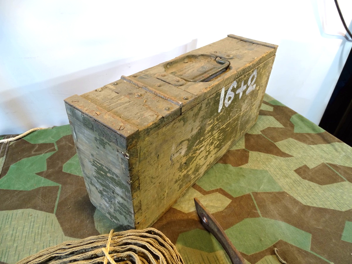 Patronenkasten der deutschen kaiserlichen Truppen im I. Weltkrieg. Vorne mit typischem runden Messing Drücker. Gute Erhaltung. Verschluss klappt. Mit altem 250er Stoffgurt. Der Gurt kann auch für ein anderes MG dieser Zeit sein, war aber bei Ankauf im Kasten und passt gut dazu. Teils wurden im MG 08/15 auch Beutegurte verwendet. Auf dem Foto fehlen seitlich ein paar Holzschrauben für den Bandbeschlag. Diese ersetzen wir vor Lieferung noch so unauffällig wie möglich mit historischen Holzschrauben. So wird das nicht mehr auffallen. Zustand siehe Fotos.