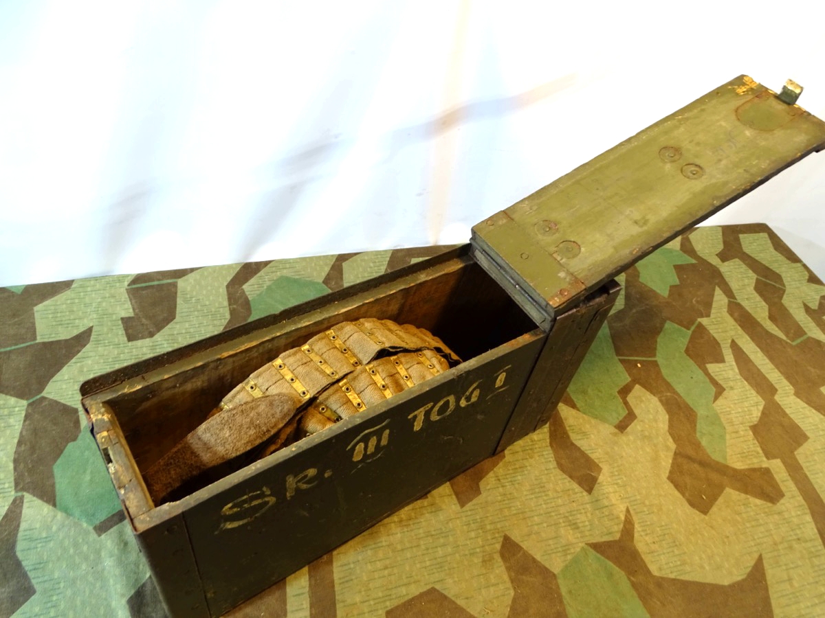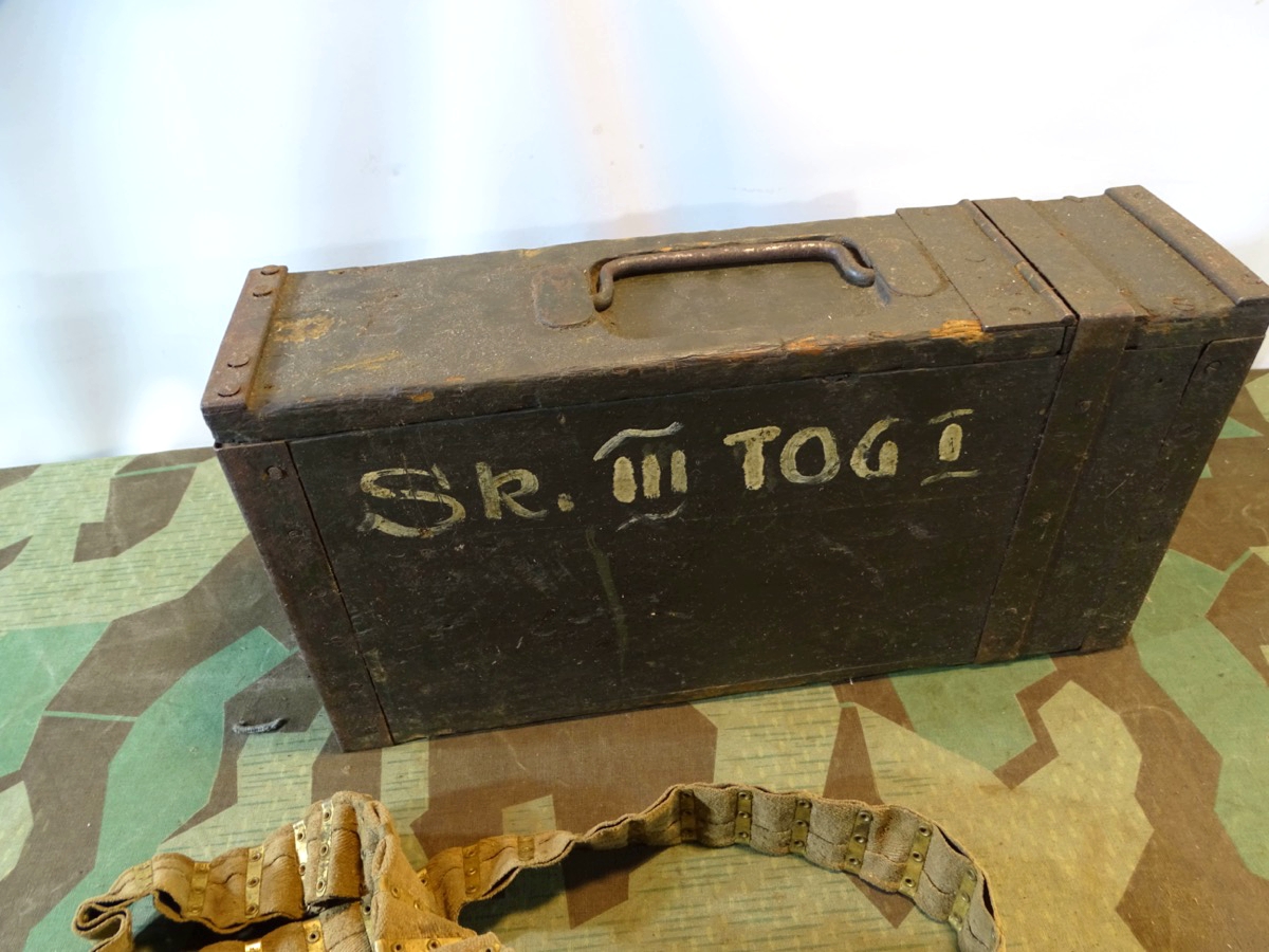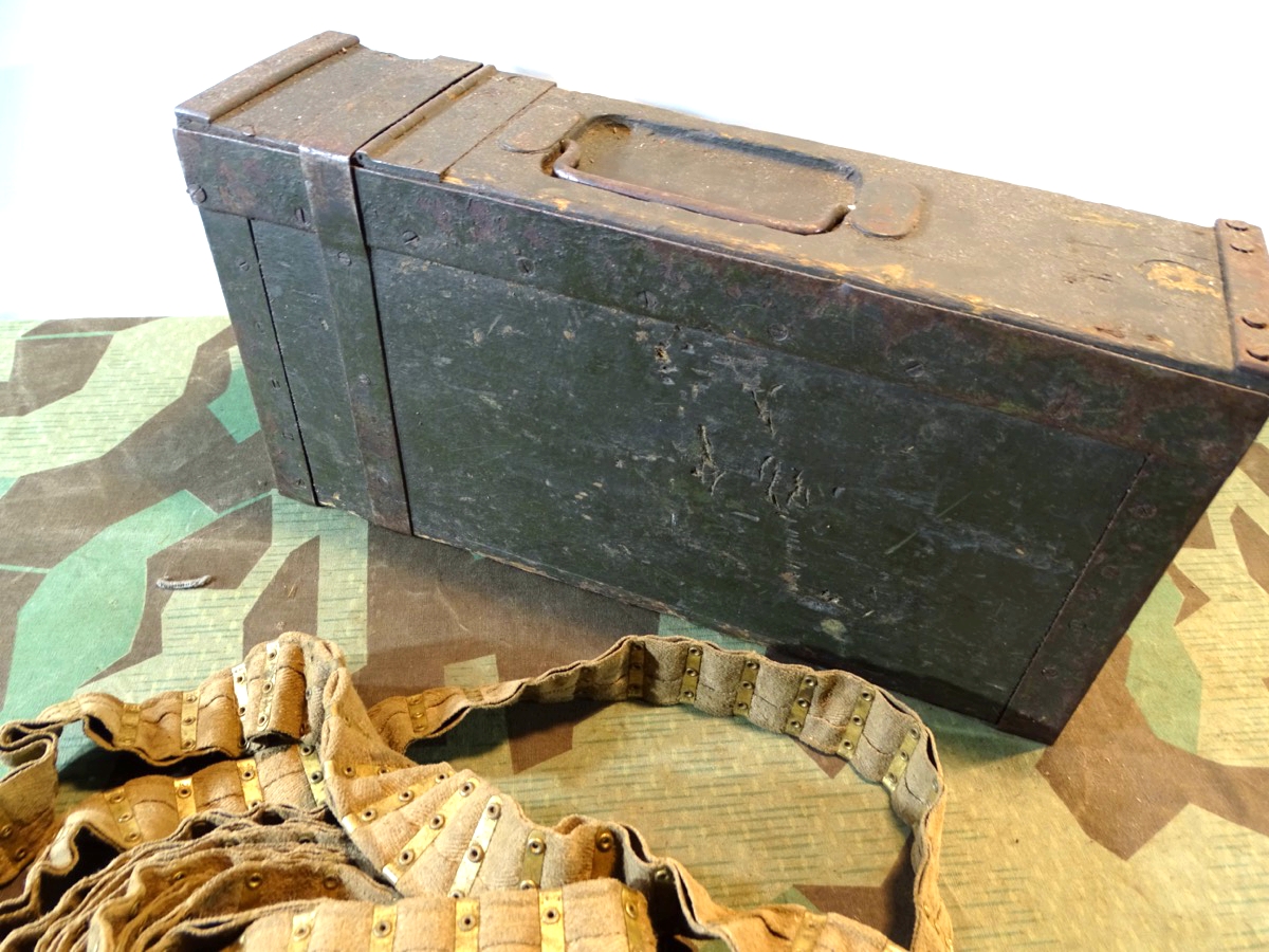 Patronenkasten der deutschen kaiserlichen Truppen im I. Weltkrieg. Vorne mit typischem runden Messing Drücker. Gute Erhaltung. Verschluss klappt. Mit altem 250er Stoffgurt. Der Gurt kann auch für ein anderes MG dieser Zeit sein, war aber bei Ankauf im Kasten und passt gut dazu. Teils wurden im MG 08/15 auch Beutegurte verwendet. Zustand siehe Fotos.