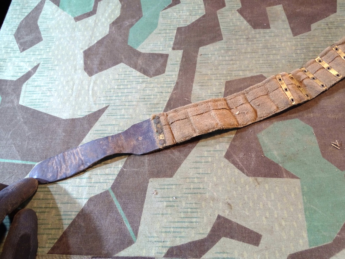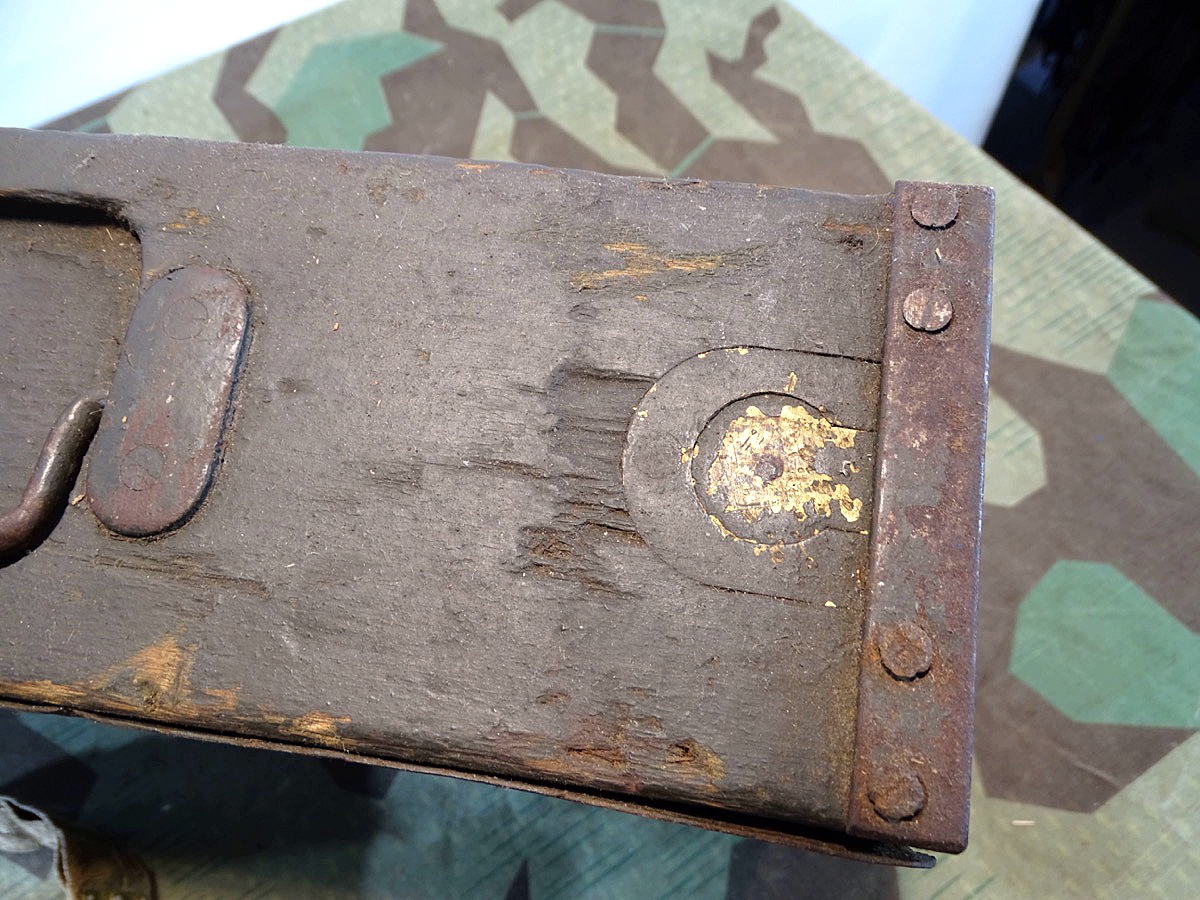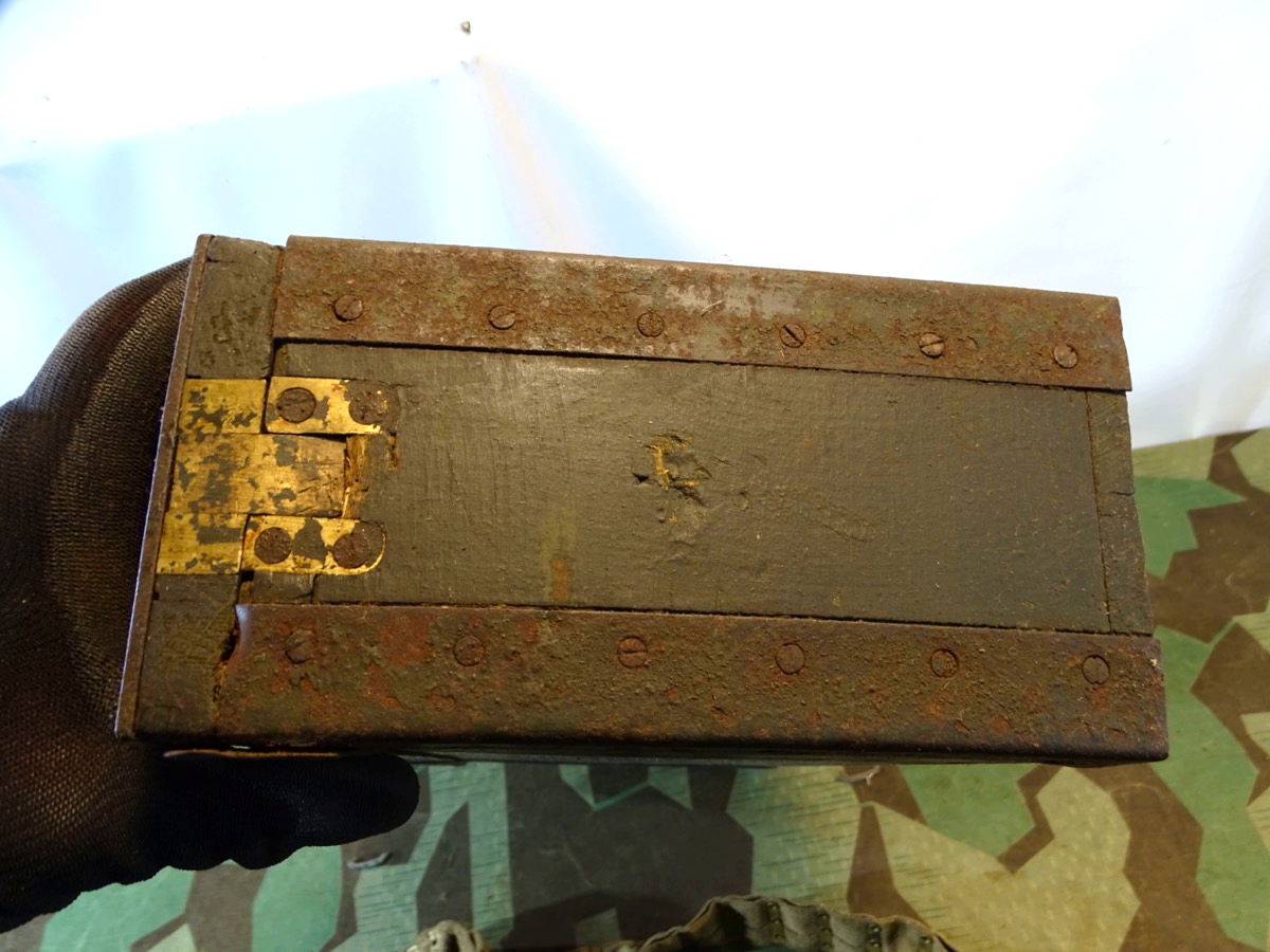 Patronenkasten der deutschen kaiserlichen Truppen im I. Weltkrieg. Vorne mit typischem runden Messing Drücker. Gute Erhaltung. Verschluss klappt. Mit altem 250er Stoffgurt. Der Gurt kann auch für ein anderes MG dieser Zeit sein, war aber bei Ankauf im Kasten und passt gut dazu. Teils wurden im MG 08/15 auch Beutegurte verwendet. Zustand siehe Fotos.