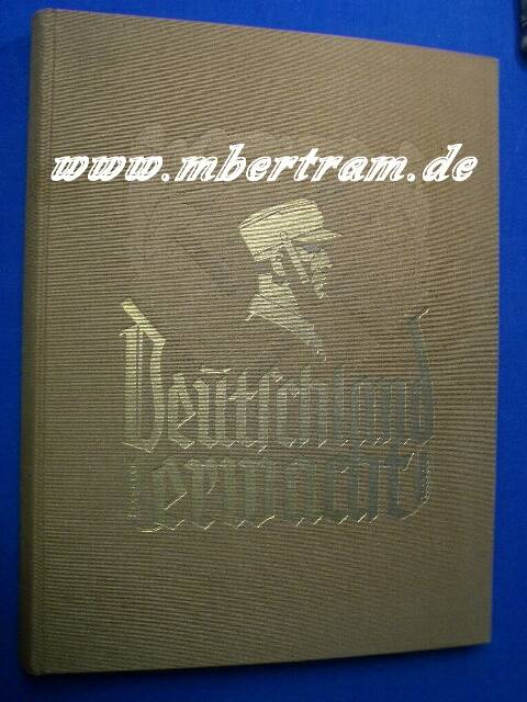 brauner Leineneinband mit golden tiefgeprägtem SA Mann vor einem geprägten HK. Schrift etwas berieben. Buchrücken etwas bestoßen. Ausgabe 625-675 Tsd. Herausgegeben von Cigaretten Bilderdienst Altona Bahrenfeld. Copyright 1933. Alle Bilder vorhanden und sauber eingeklebt. Seiten mit leichter Bräunung. S 74 in Mitte unten ca. 3cm Riss vom Blättern. Auf der letzten Seite ein monumentales Faltbild über einen Aufmarsch der SA und SS bei der Standartenweihe Luitpoldhain 1933. Etwa 8x Din A 4 Seiten vereinigen sich zu einem riesigen Panoramabild, Überaus eindrucksvolle Propaganda.